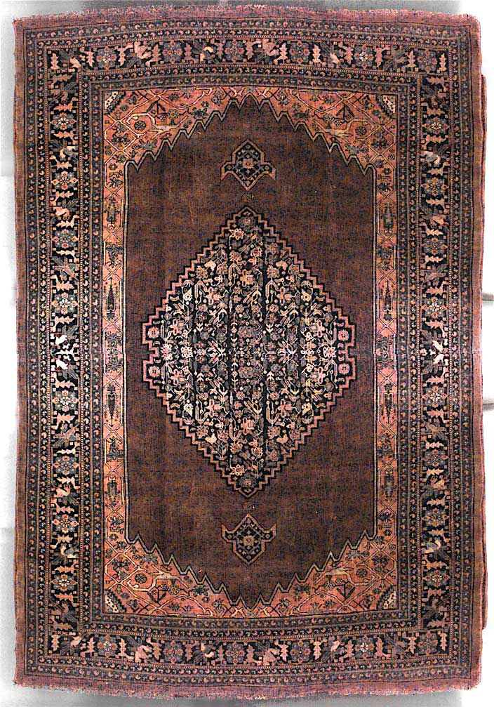 Middle Eastern Persian Bijar (19th Century) rug carpet with maroon background and blue diamond design center medallion & border (8 x 10')..