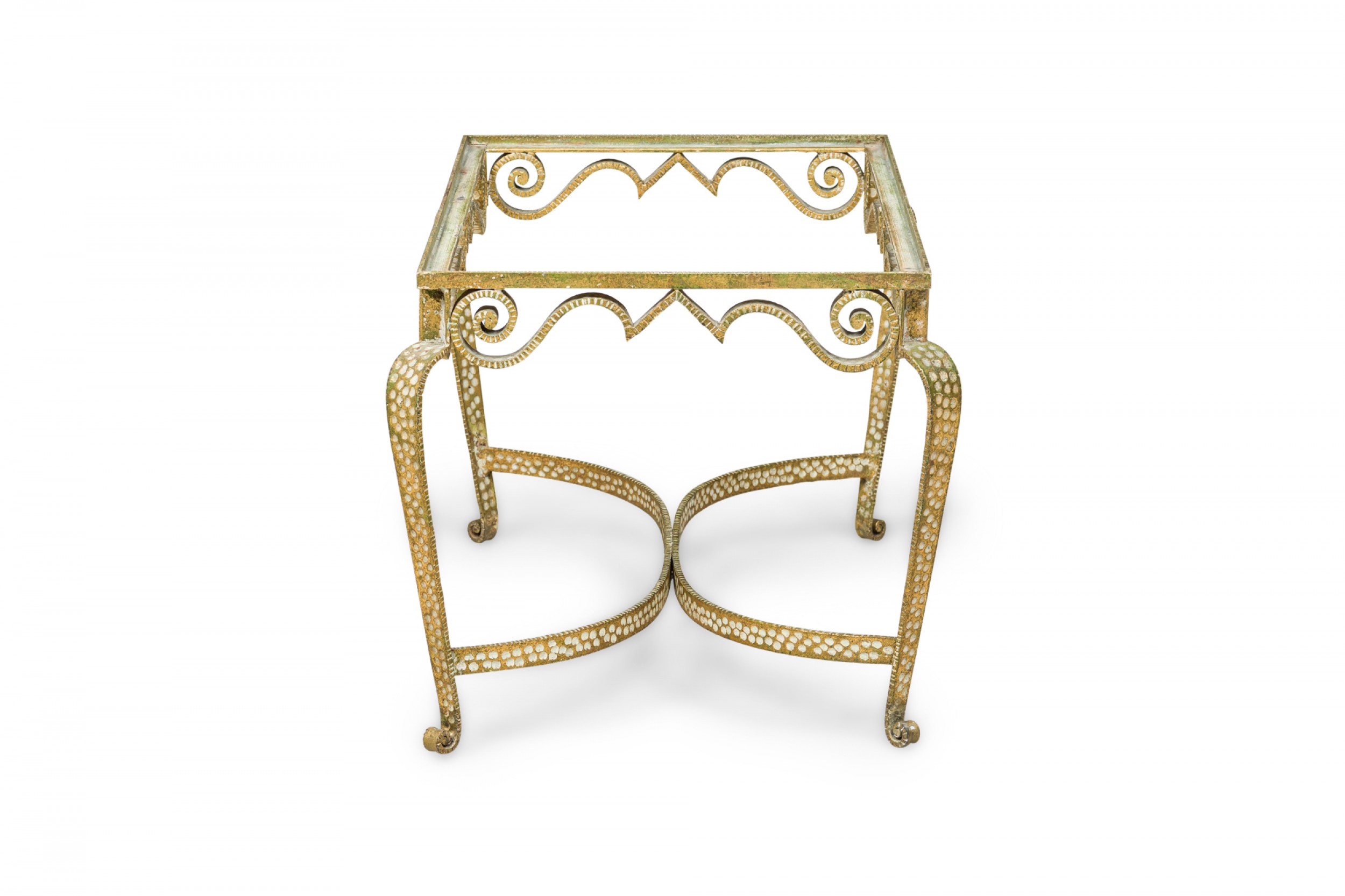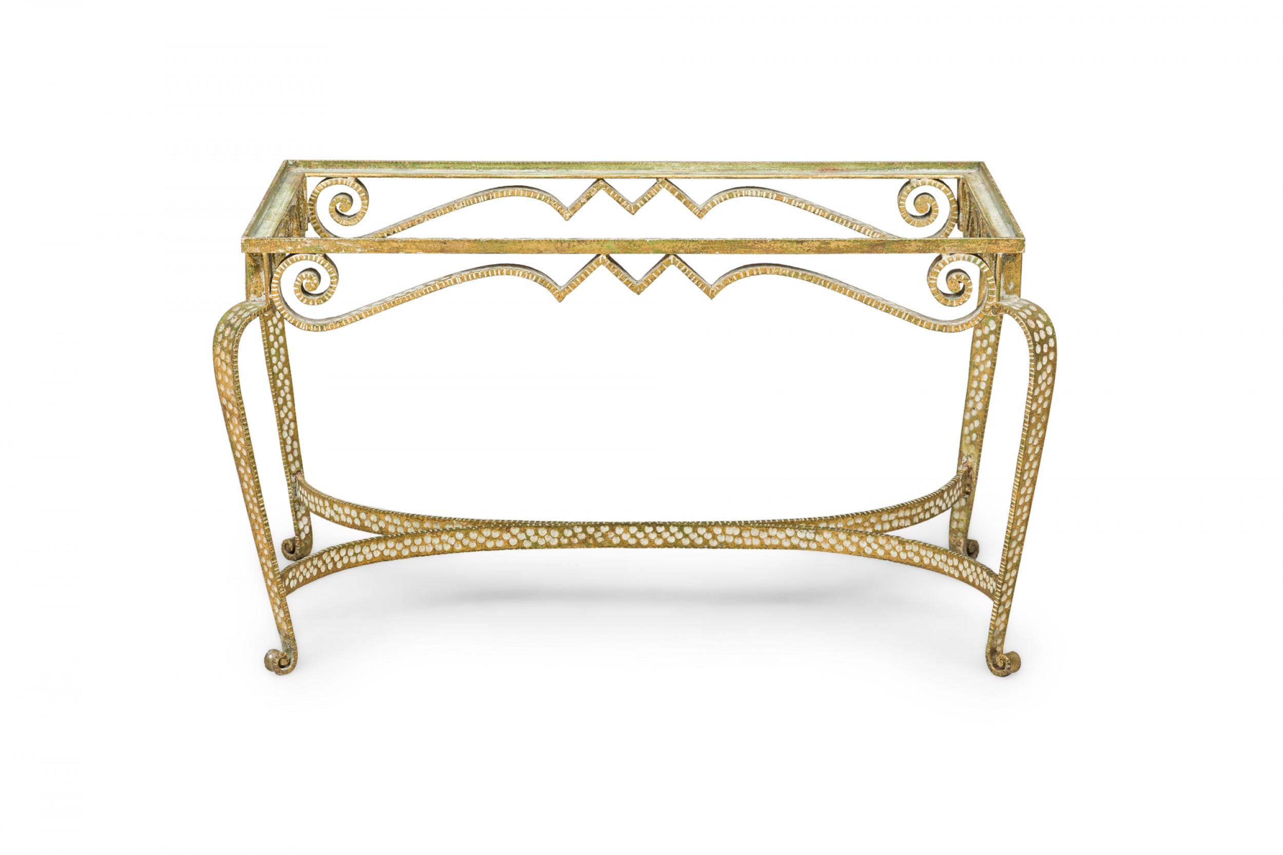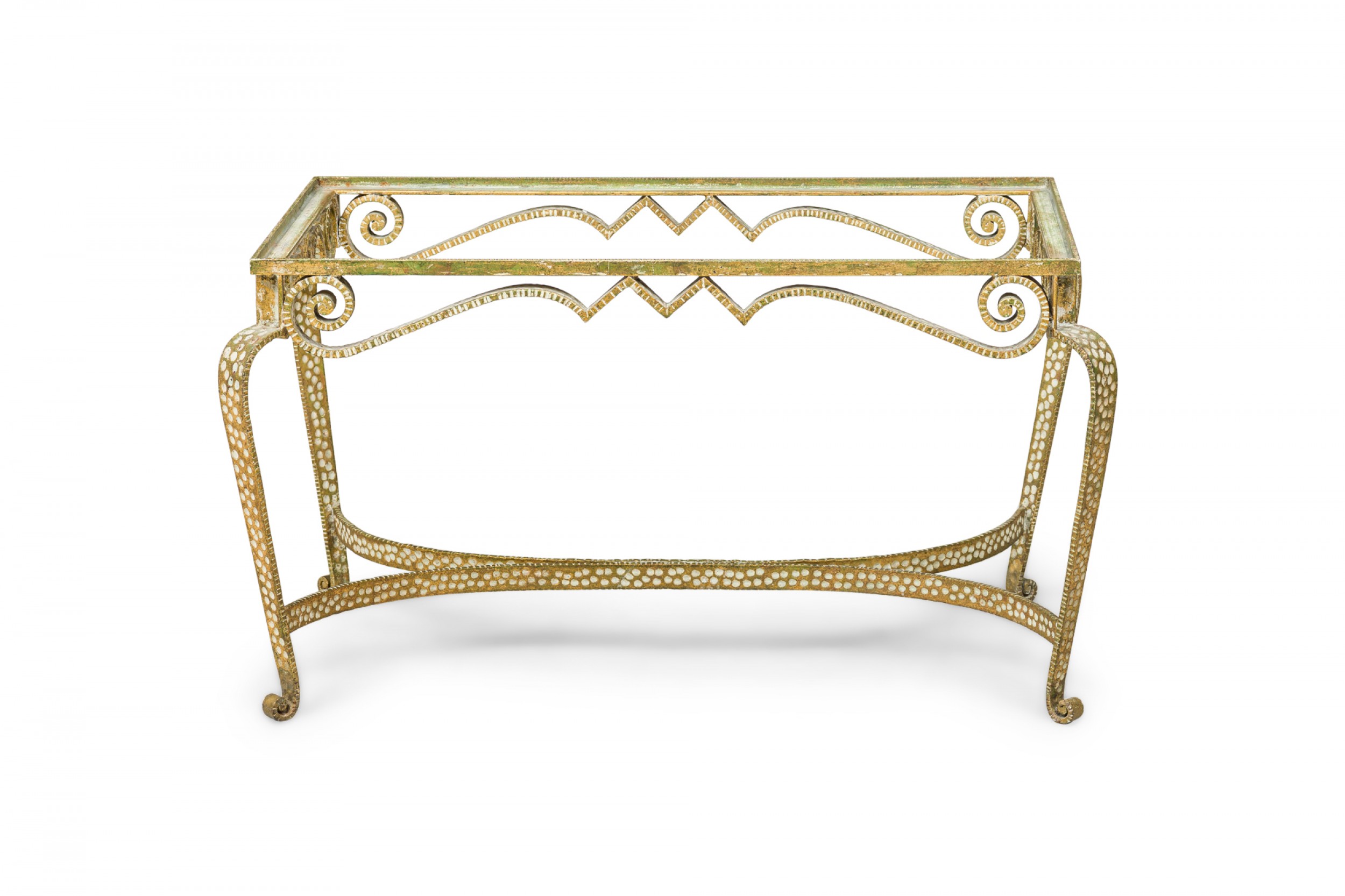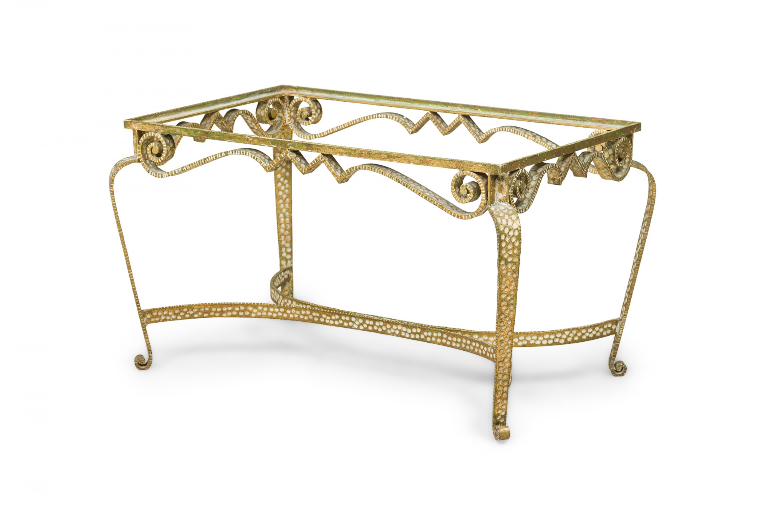 Italian Mid-Century (1950s) low / coffee table frame constructed from pebble hand-hammered gilt iron with scrollwork designs and a stretcher base (missing inset glass or marble table top). (PIER LUIGI COLLI) (missing glass top).