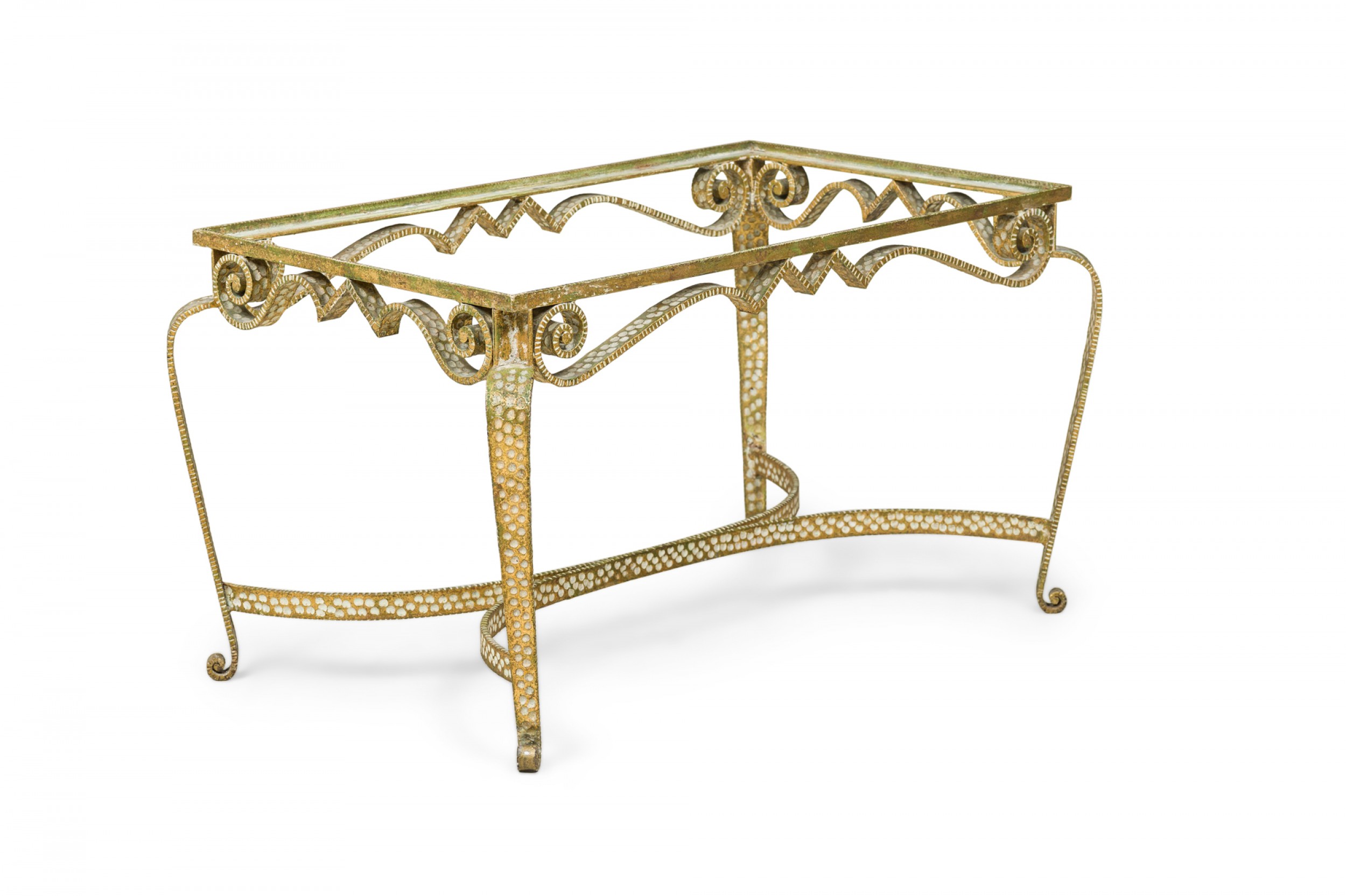 Italian Mid-Century (1950s) low / coffee table frame constructed from pebble hand-hammered gilt iron with scrollwork designs and a stretcher base (missing inset glass or marble table top). (PIER LUIGI COLLI) (missing glass top)