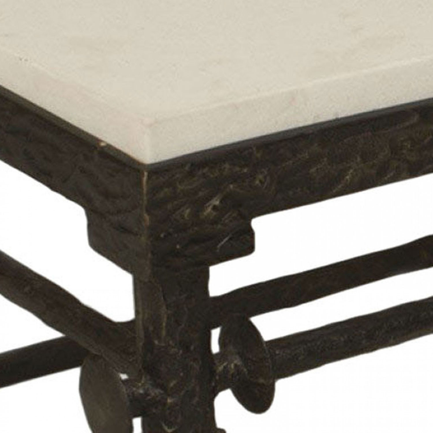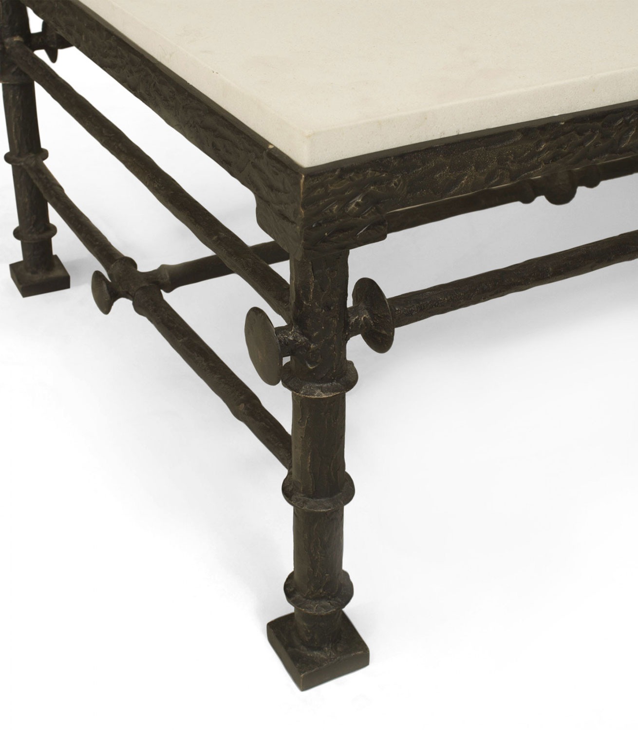 French Modern Grecian-style textured dark patinated bronze coffee table with double stretcher sides and a limestone top. (manner of ALBERTO GIACOMETTI).