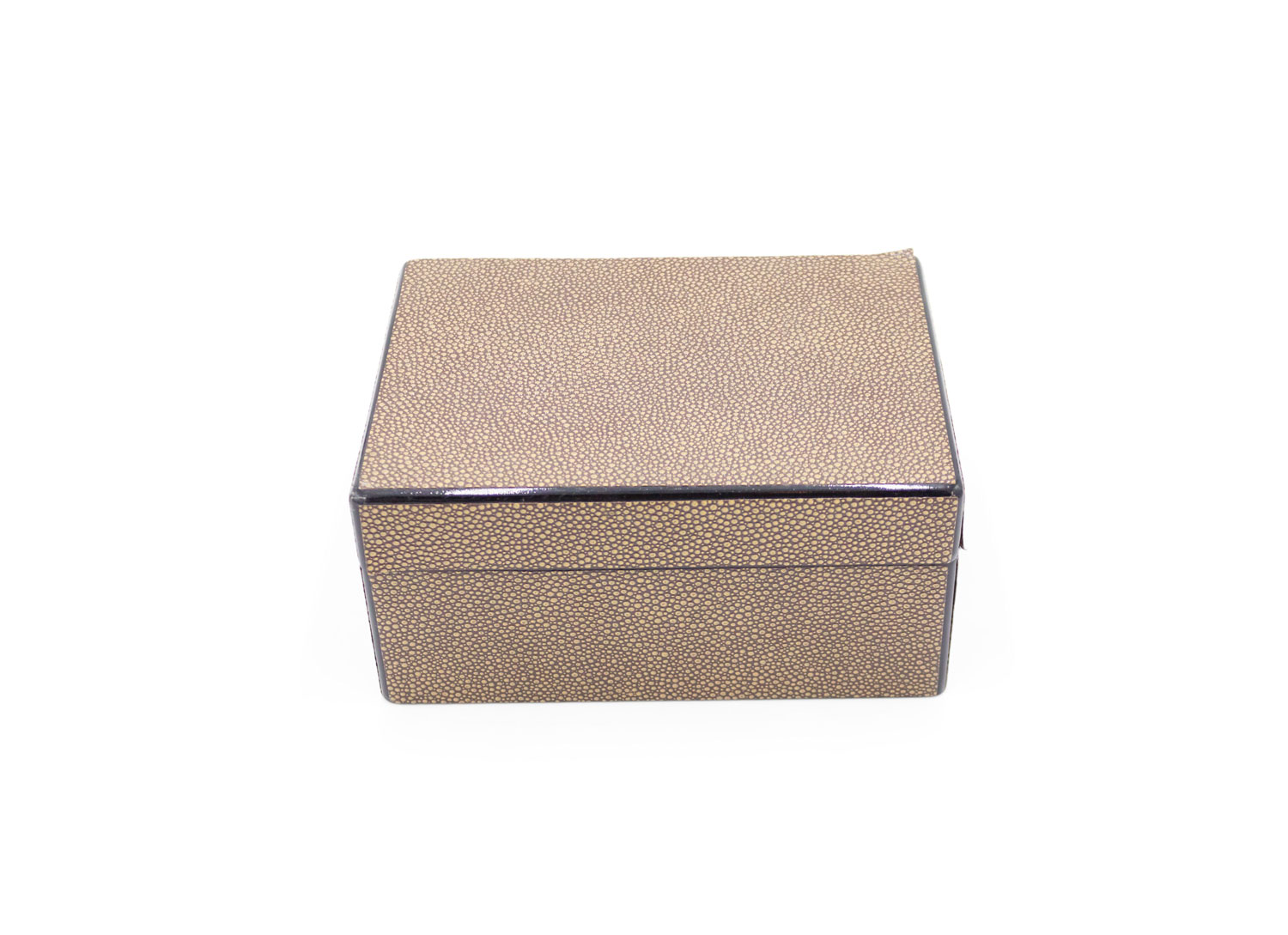 Rectangular brown shagreen wood box with a black trim and a lift-off cover