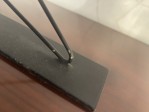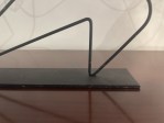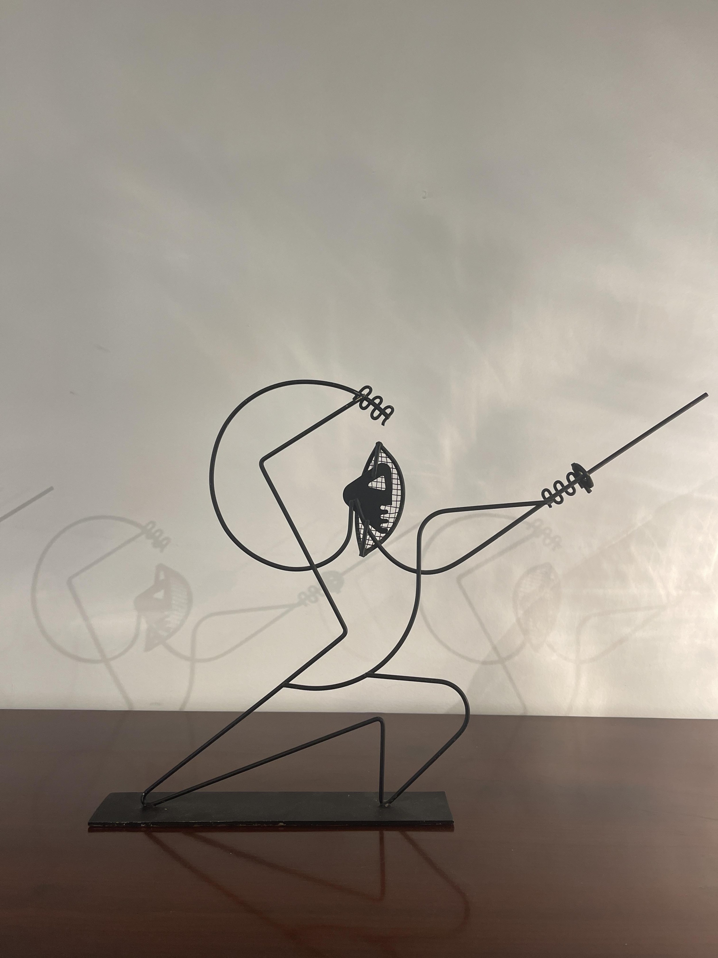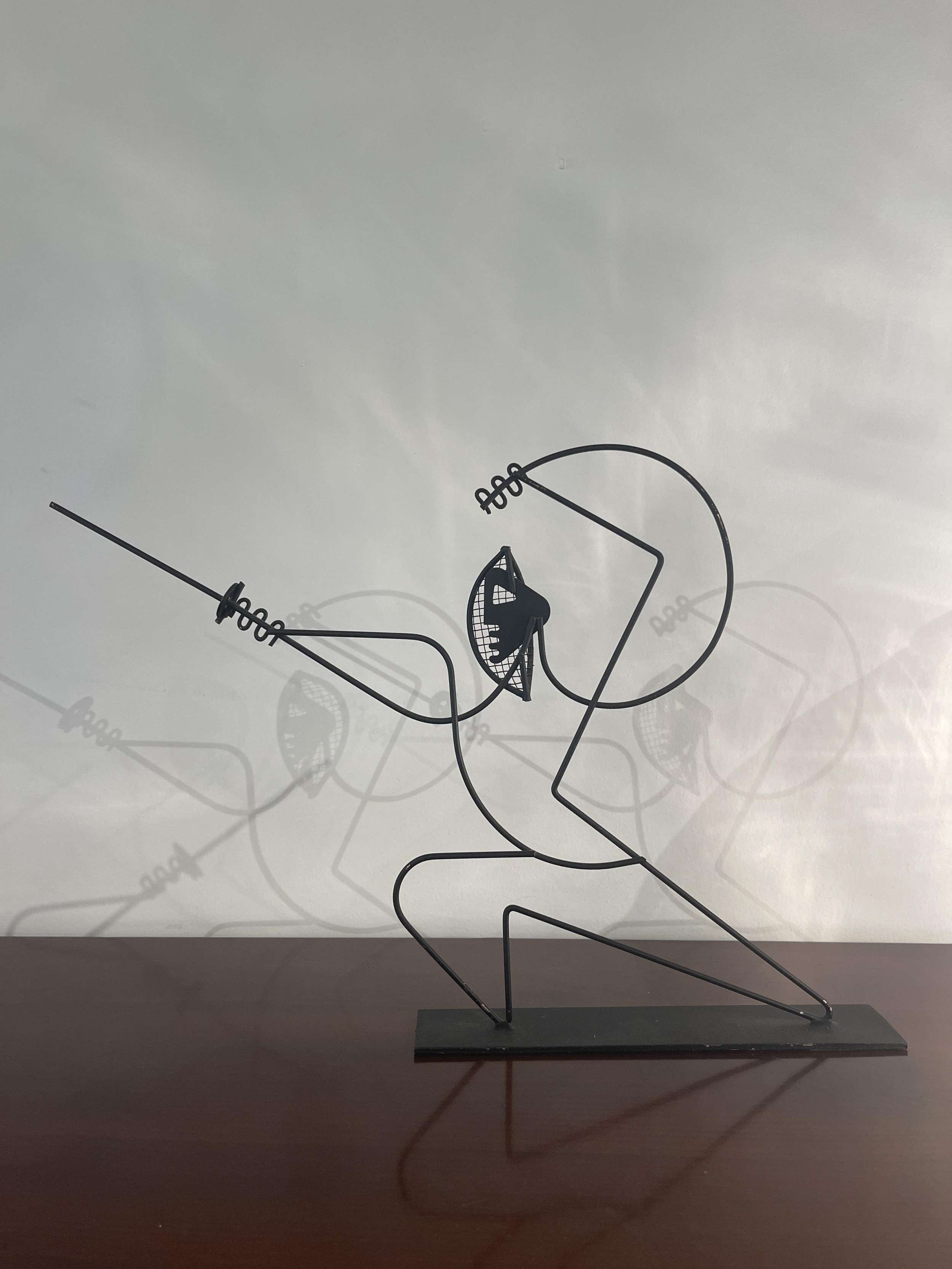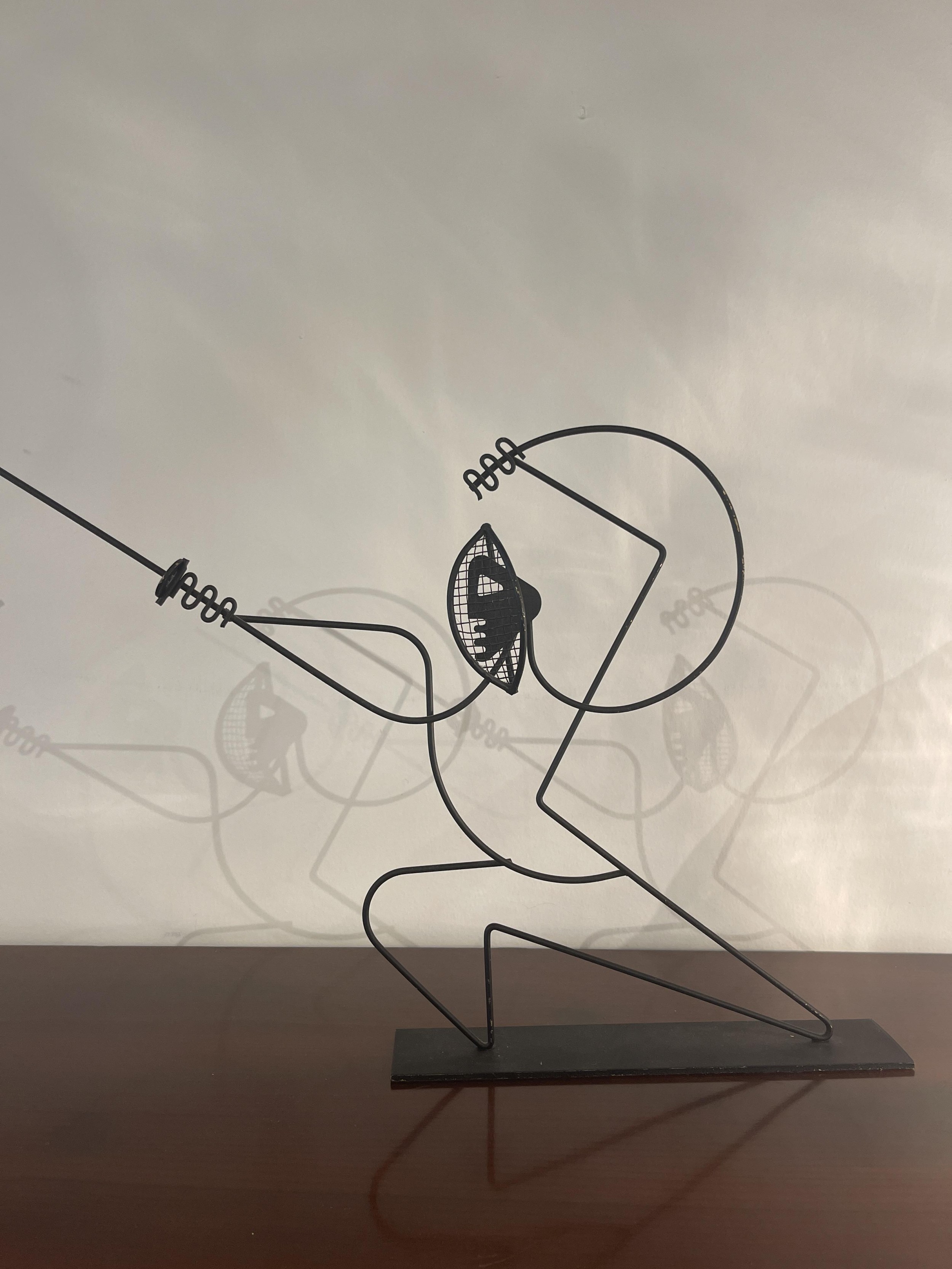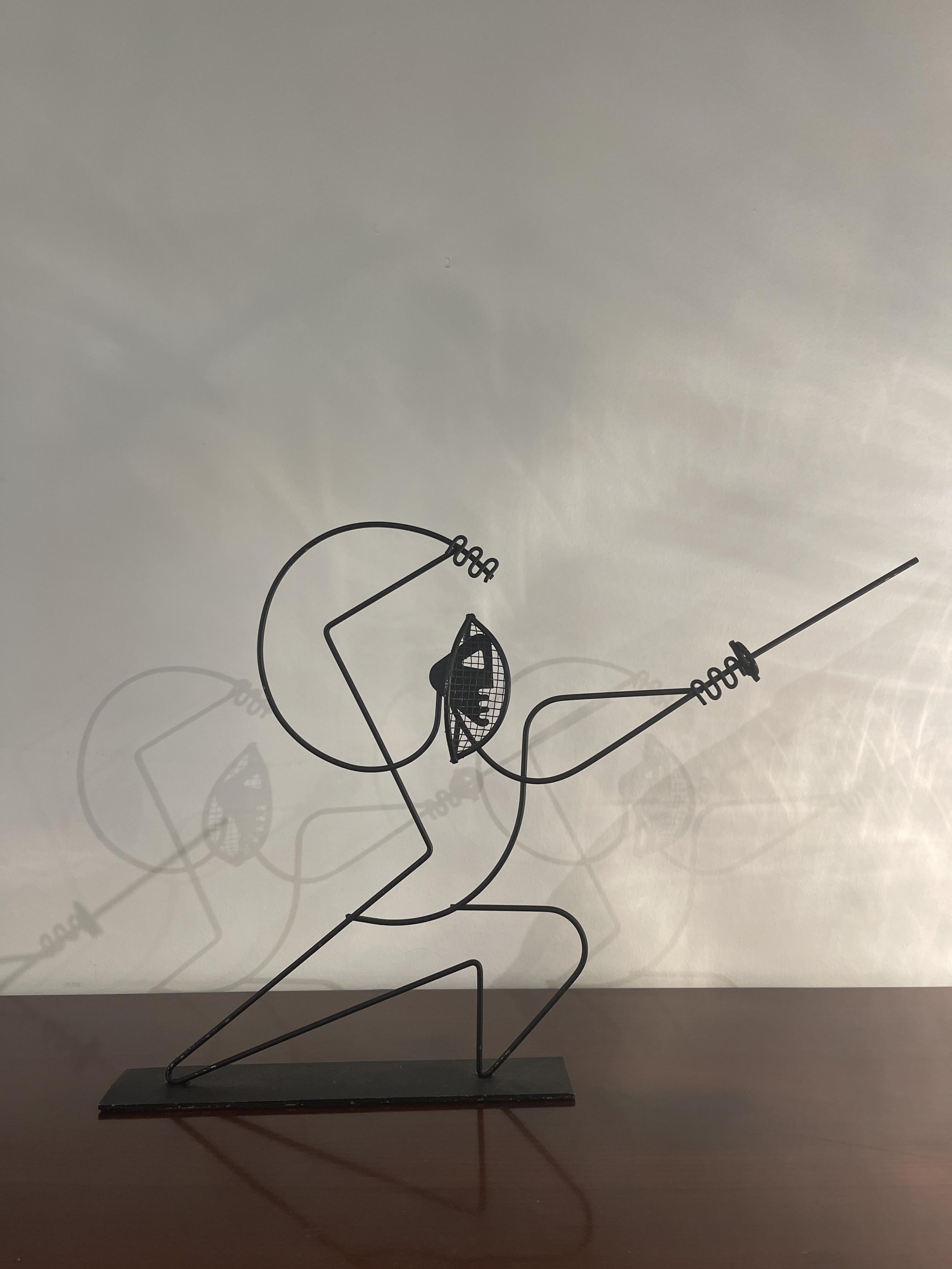 American Mid-Century (1950s) black wire sculpture of 2 fencers resting on narrow rectangular black metal bases (FREDRICK WEINBERG).