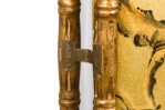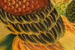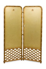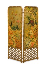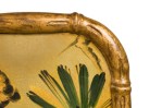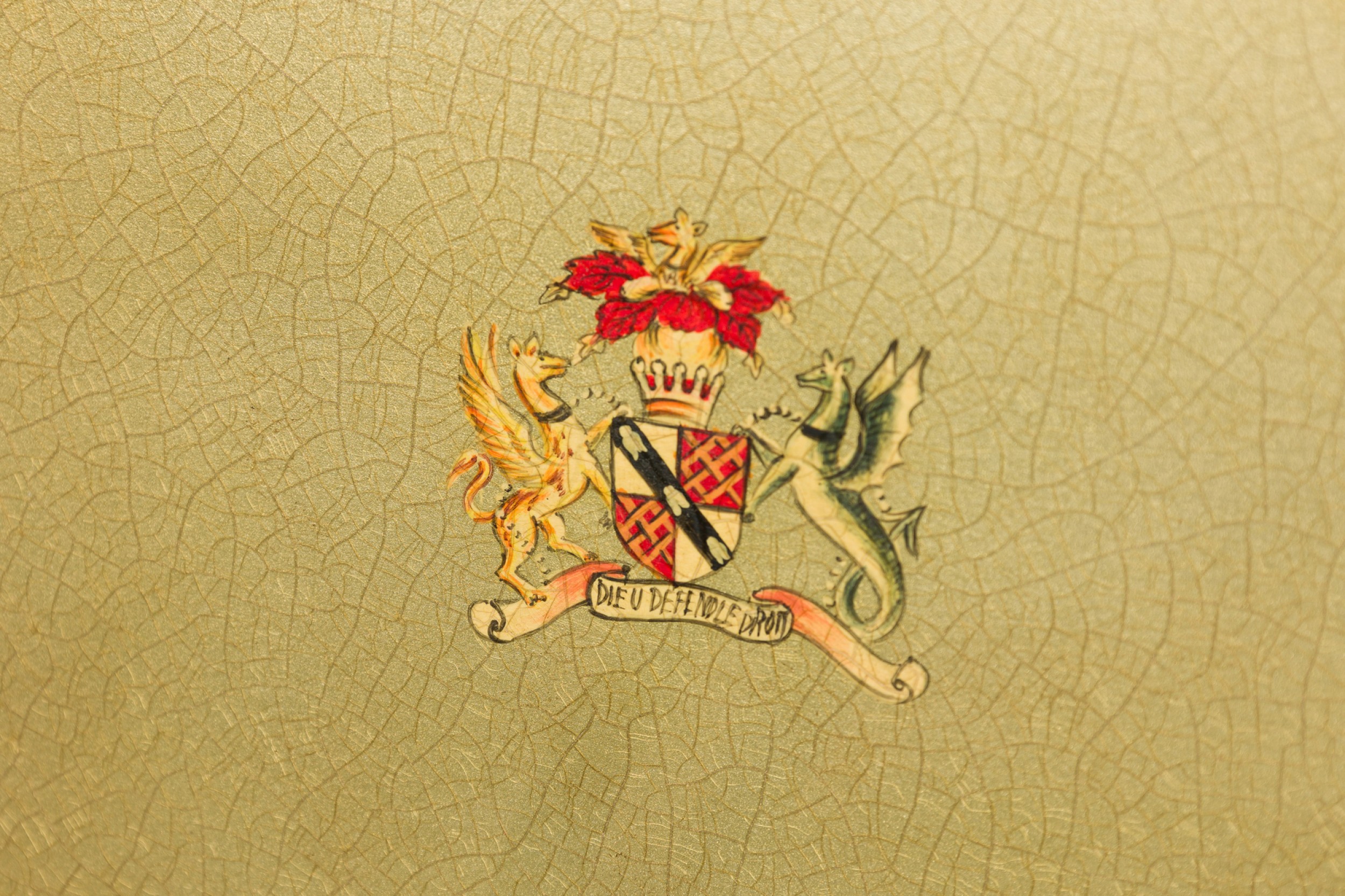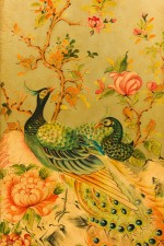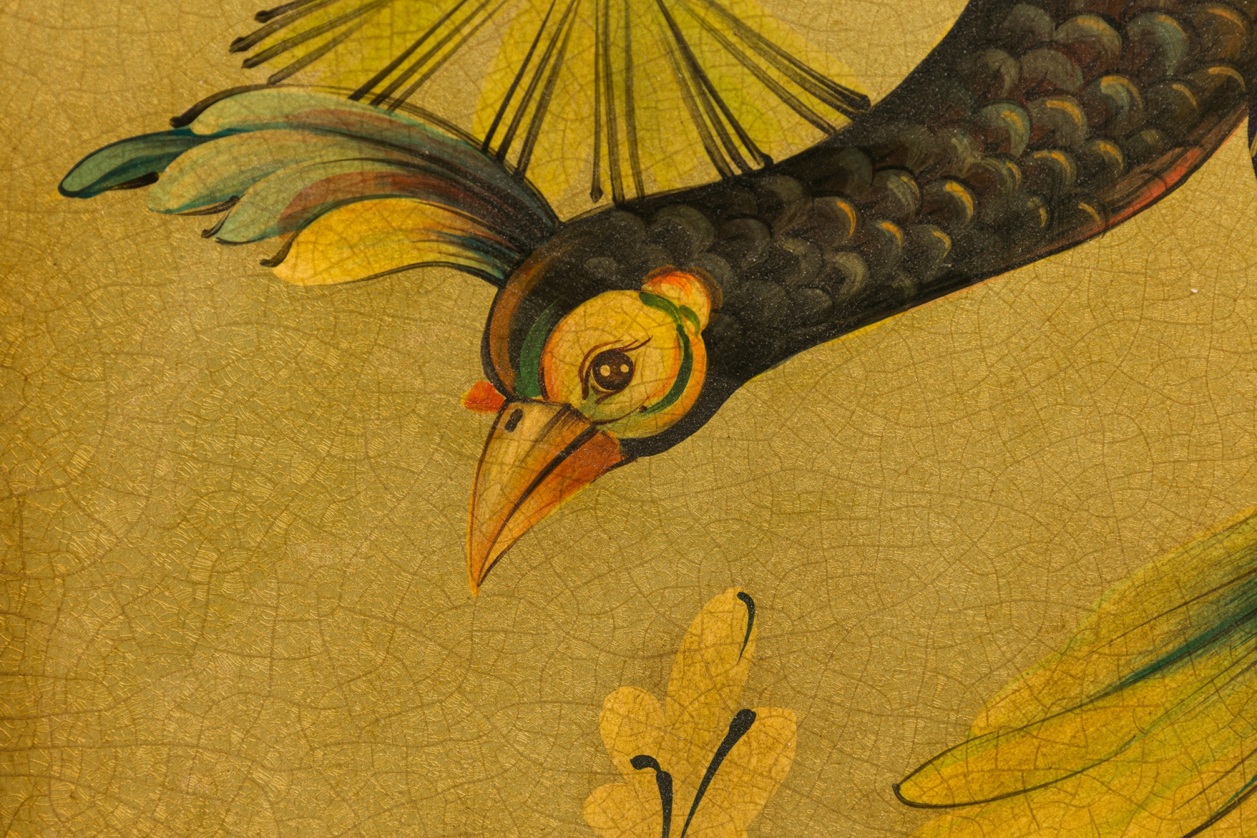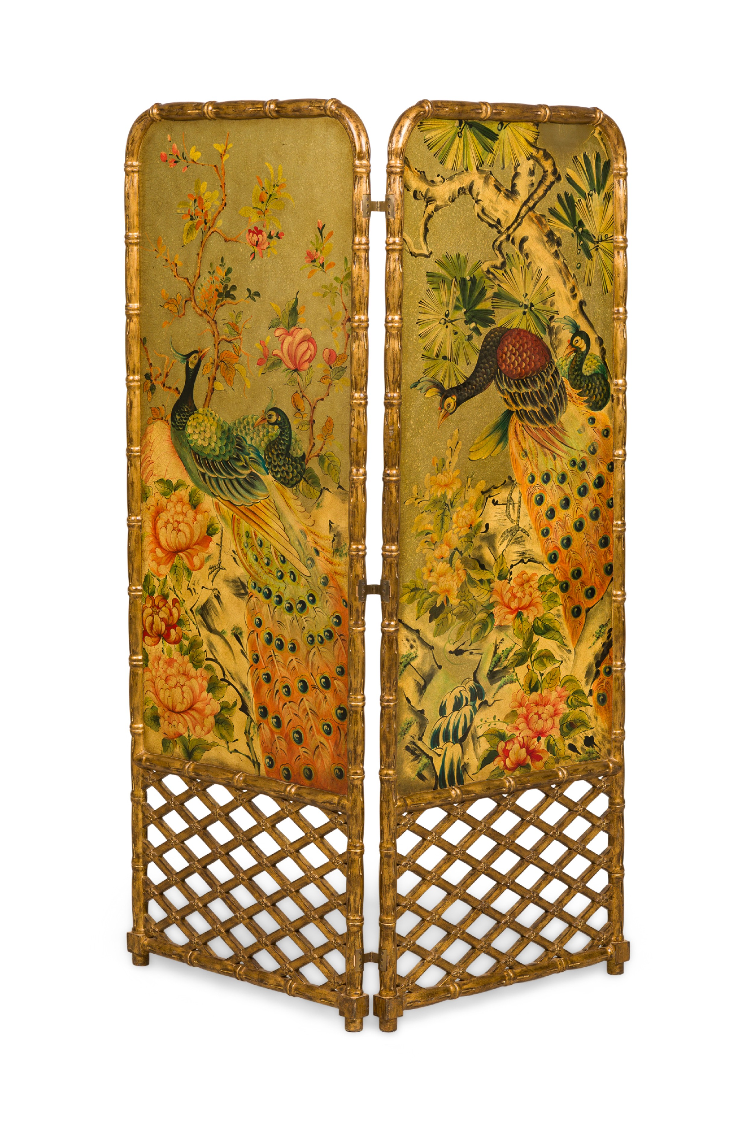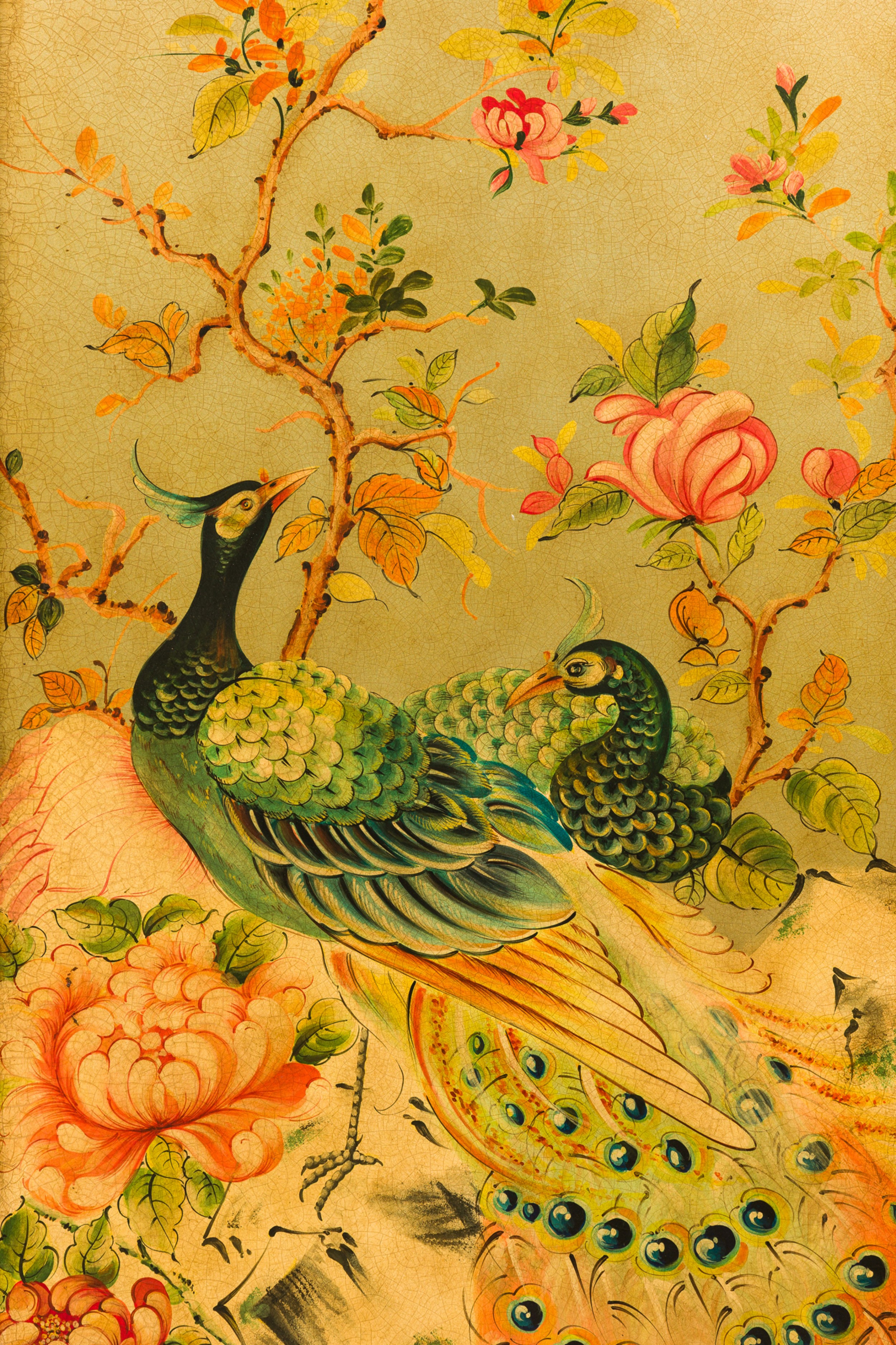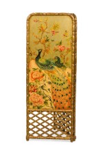 Regency-Style Chinoiserie (20th Century) decorated hand-painted peacocks and floral motifs on a crackle-lacquer background, framed in faux bamboo giltwood frame having an openwork lattice design bottom, bearing a heraldic crest with the motto “Dieu et mon Droit.” (THEODORE ALEXANDER)