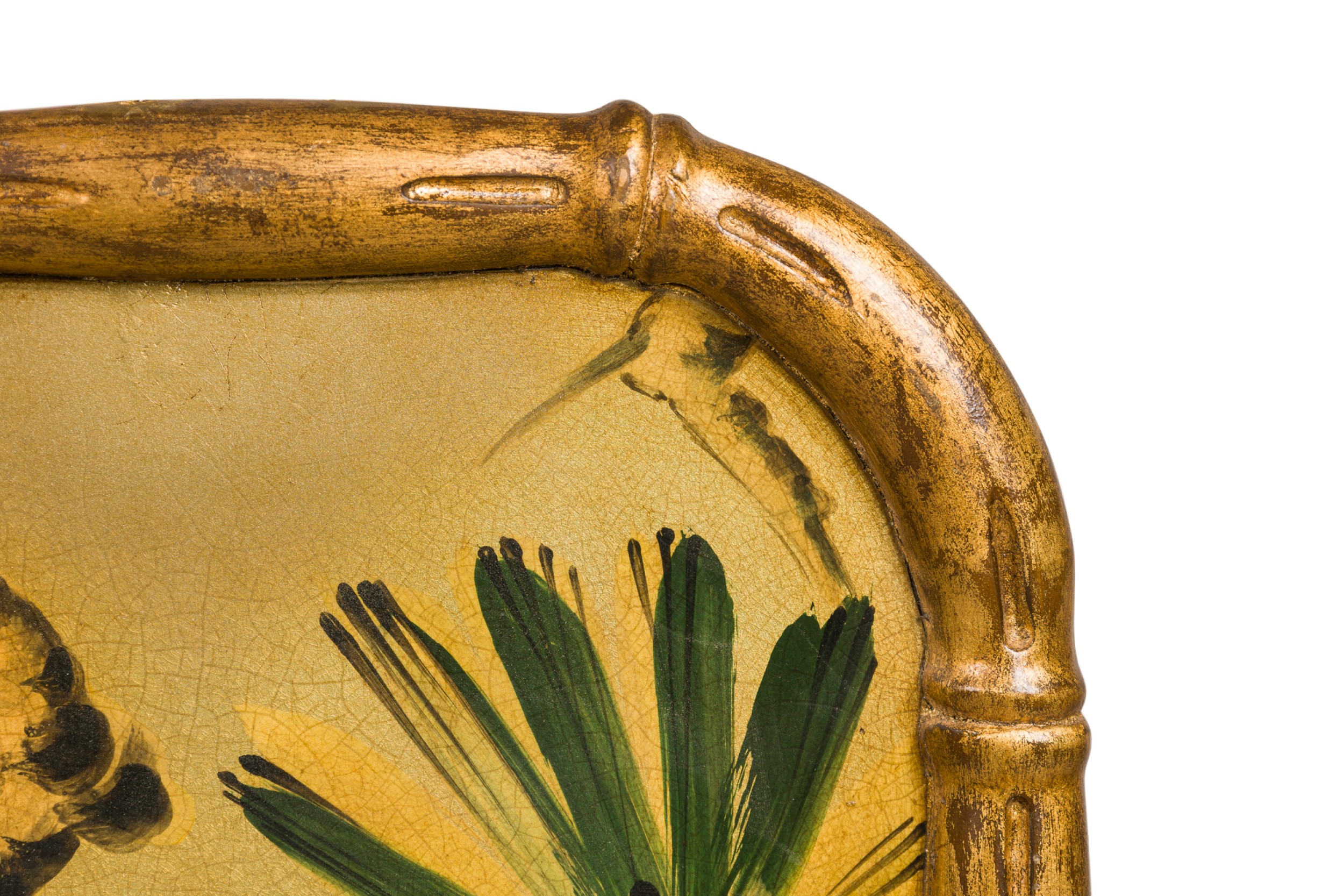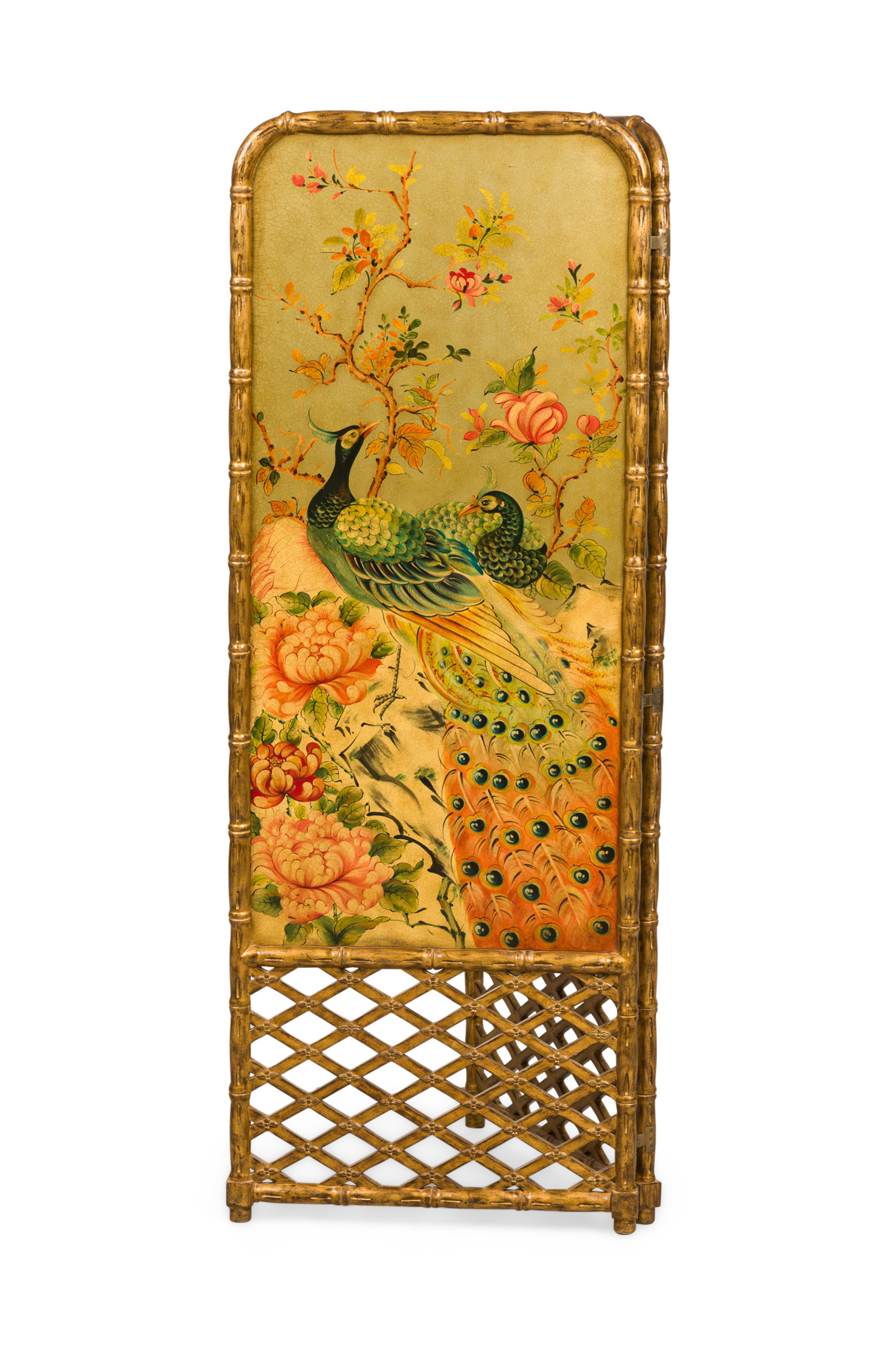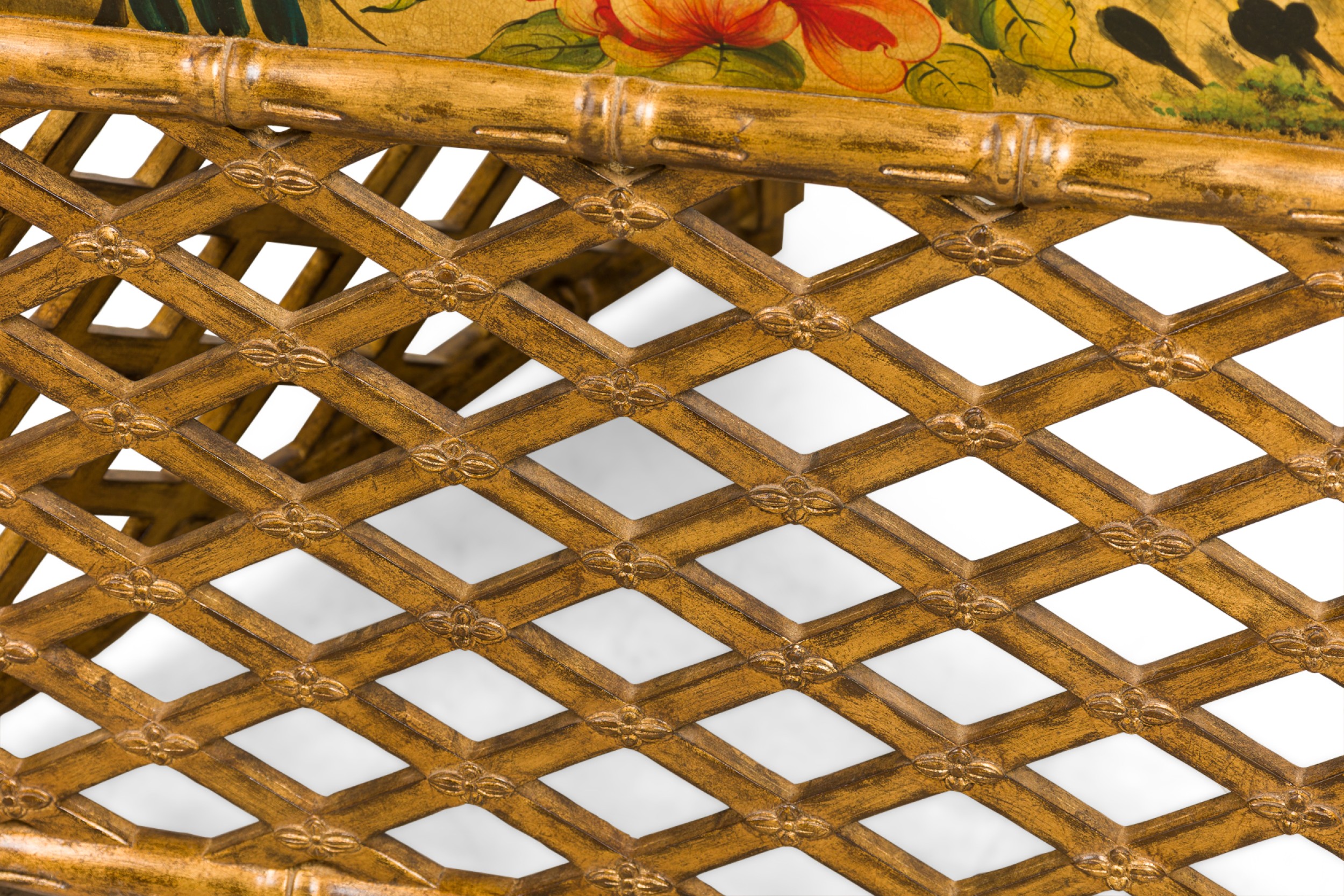 Regency-Style Chinoiserie (20th Century) decorated hand-painted peacocks and floral motifs on a crackle-lacquer background, framed in faux bamboo giltwood frame having an openwork lattice design bottom, bearing a heraldic crest with the motto “Dieu et mon Droit.” (THEODORE ALEXANDER).