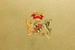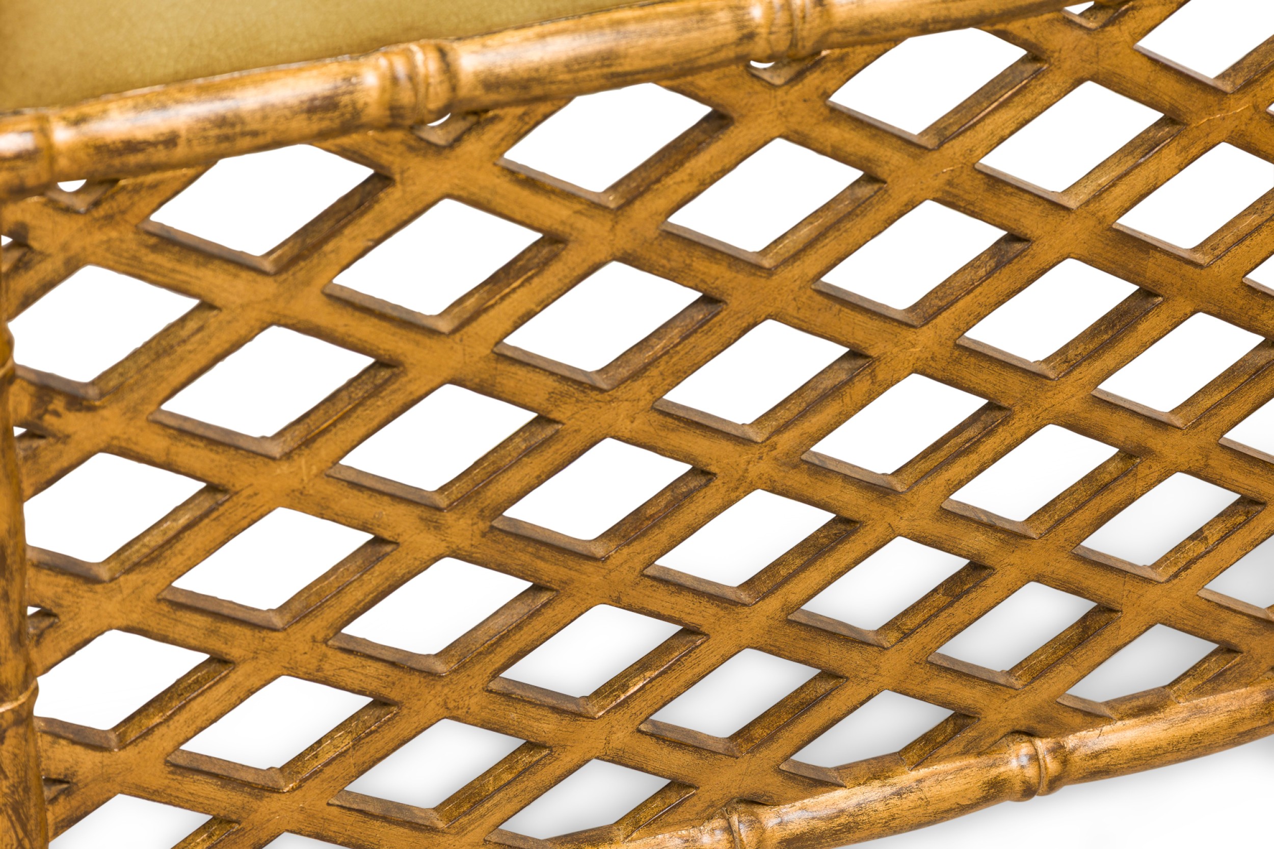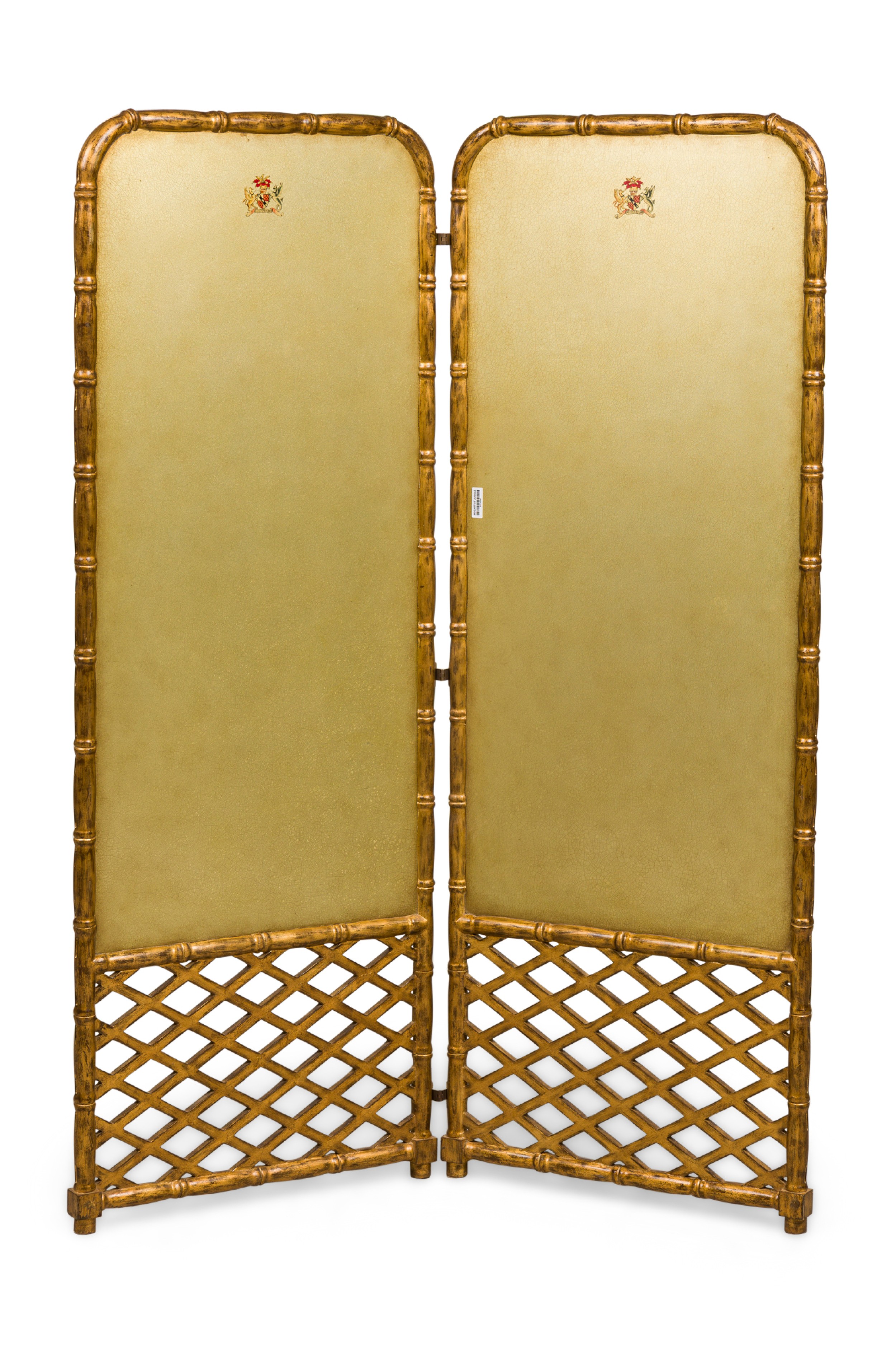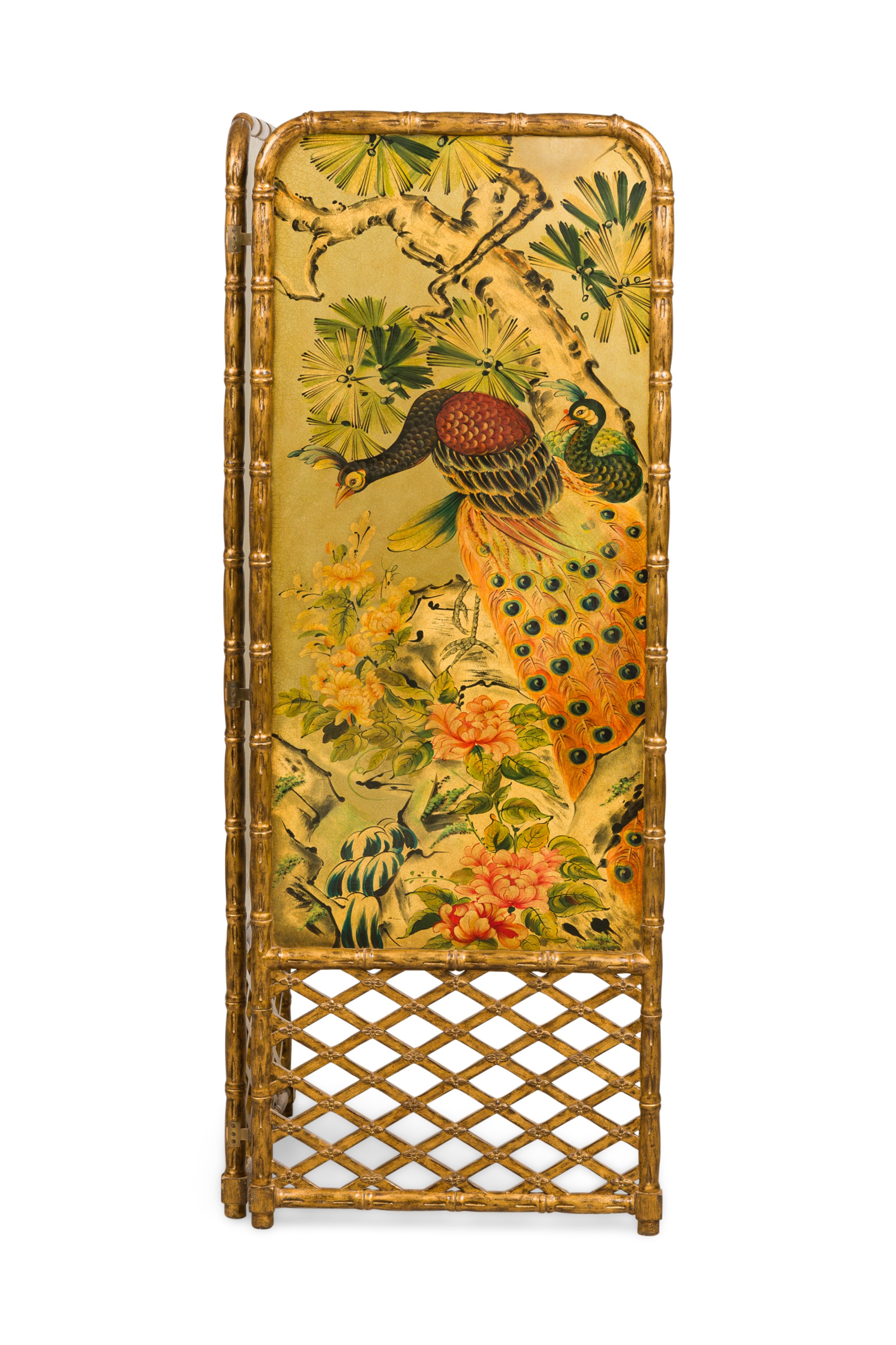 Regency-Style Chinoiserie (20th Century) decorated hand-painted peacocks and floral motifs on a crackle-lacquer background, framed in faux bamboo giltwood frame having an openwork lattice design bottom, bearing a heraldic crest with the motto “Dieu et mon Droit.” (THEODORE ALEXANDER).