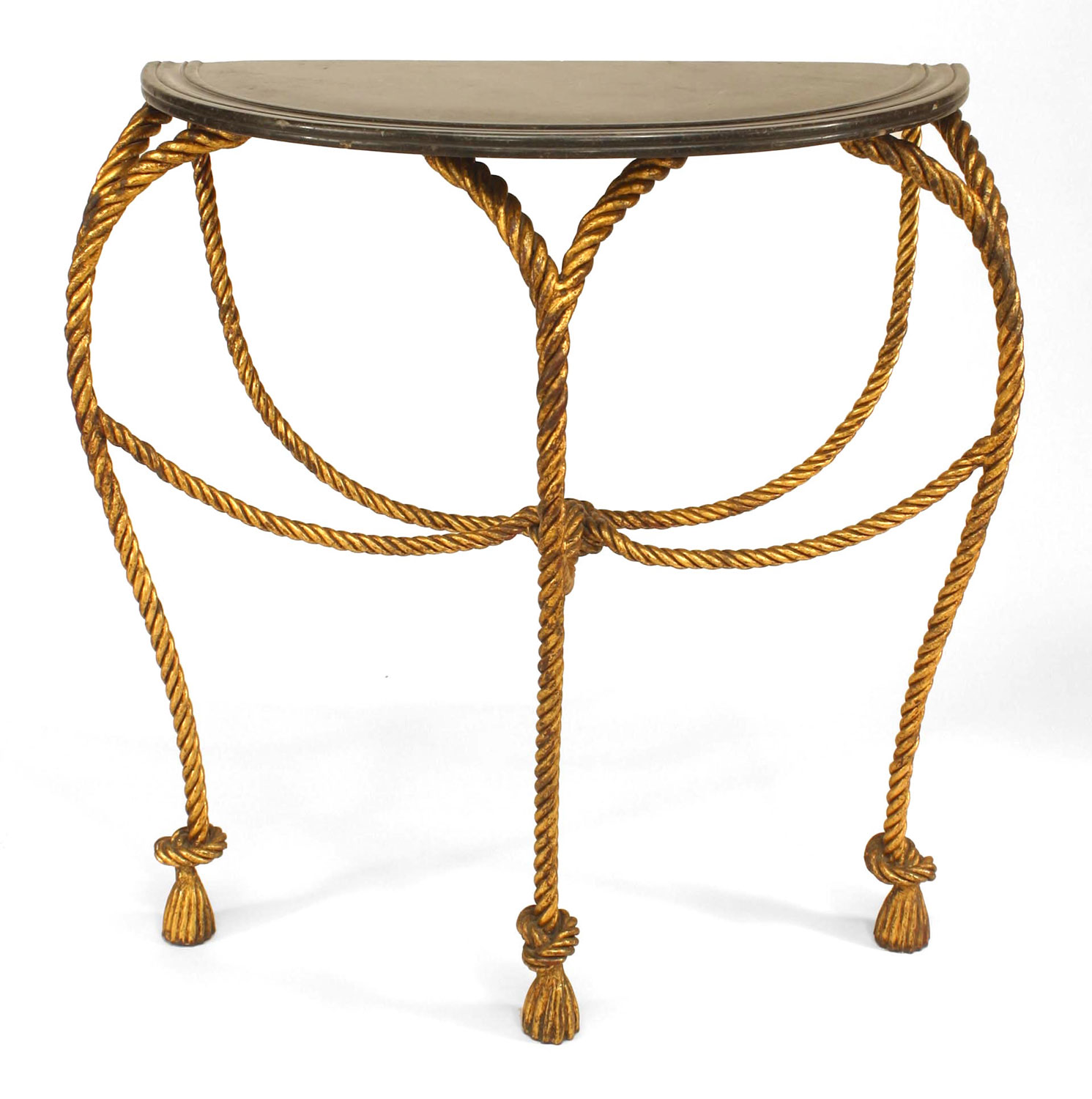 Hollywood Regency (20th Century) rope and tassel design gilt metal half round console table with marble top