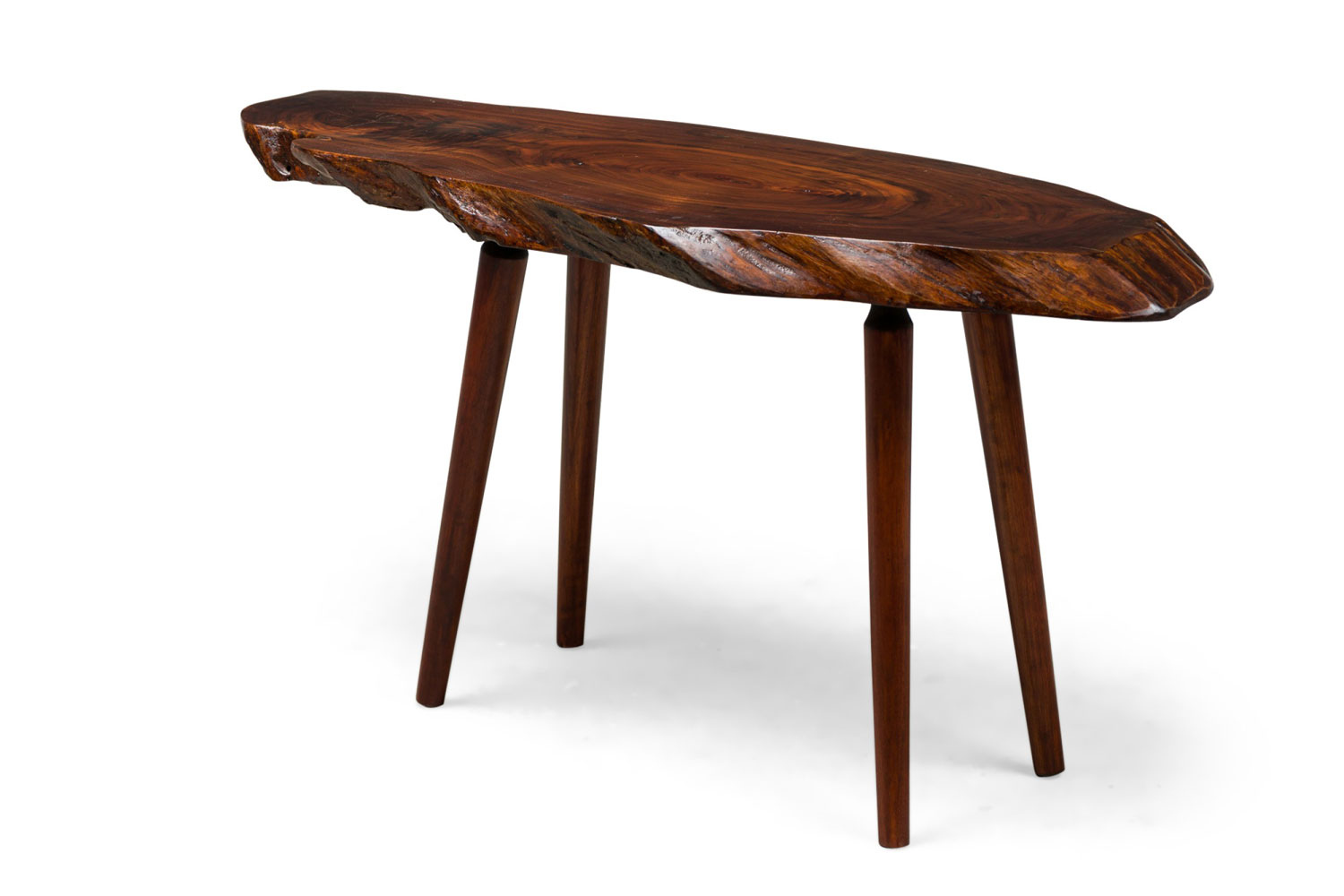 American Mid-Century Rustic style Low Cocktail /coffee Table having a freeform edge top and resting on 4 round legs (Studio Craft-ROY SHELDON)