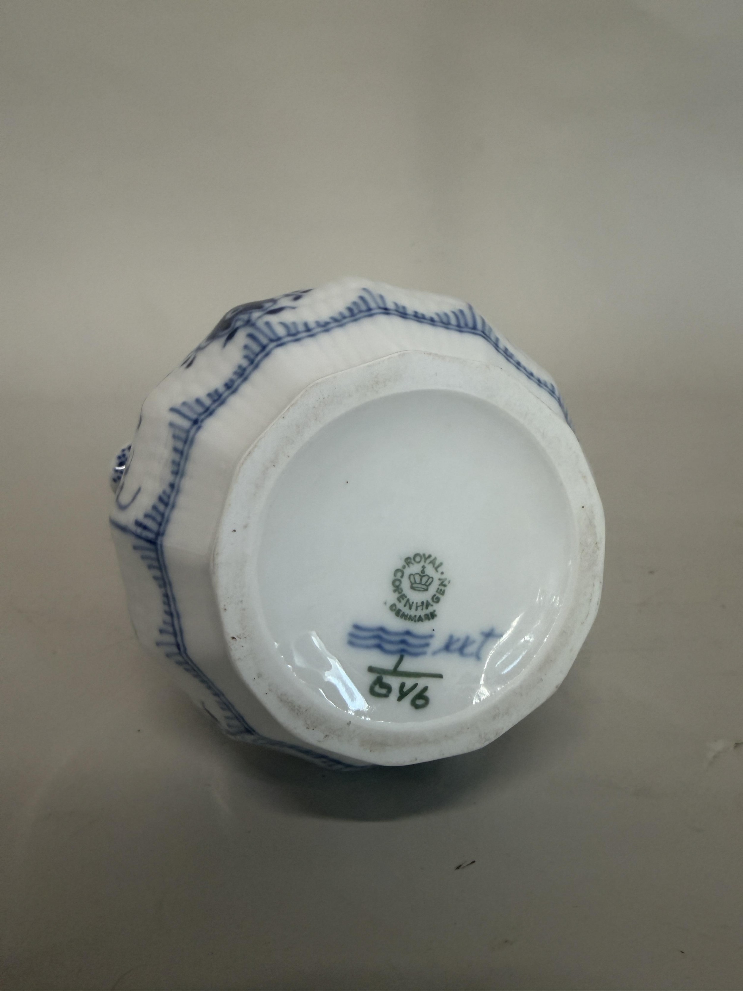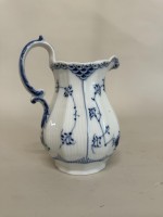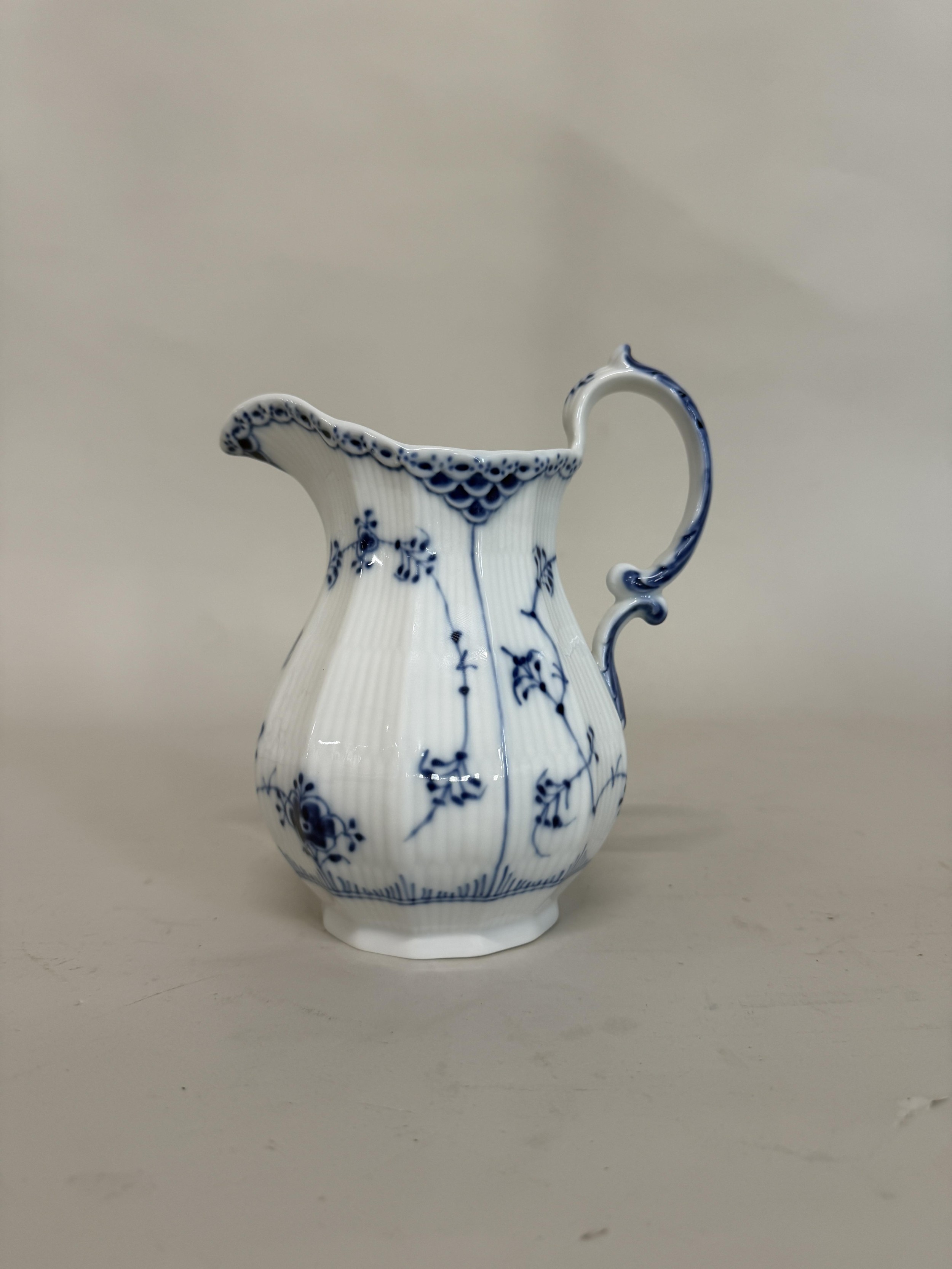 Danish porcelain jug / pitcher fluted form with a blue hand painted half lace design (stamped and editioned underside: ROYAL COPENHAGEN of DENMARK).