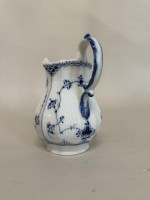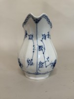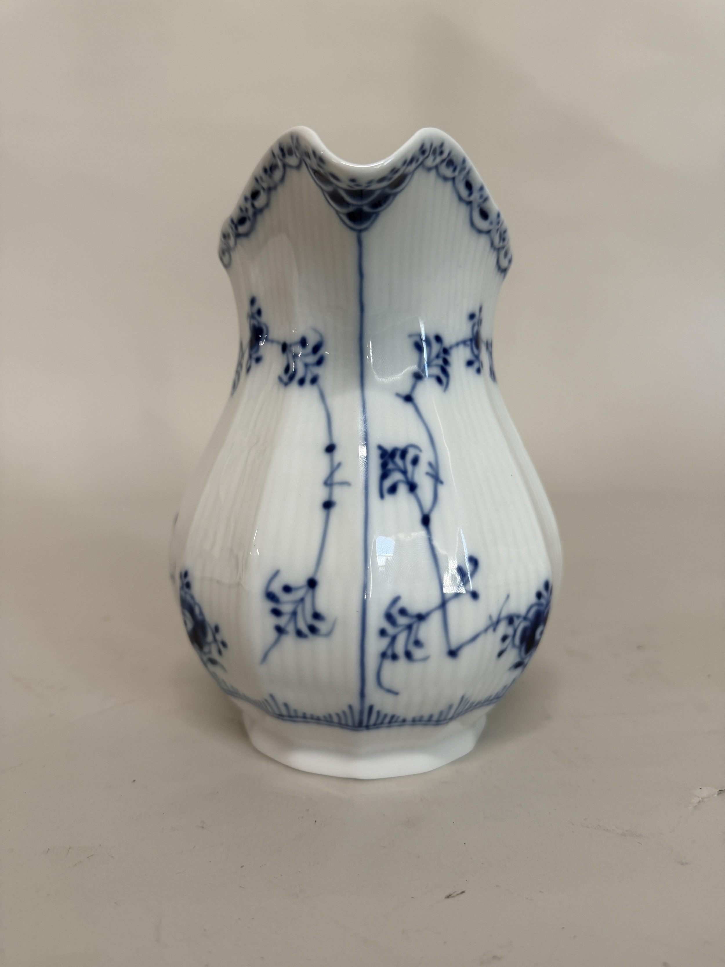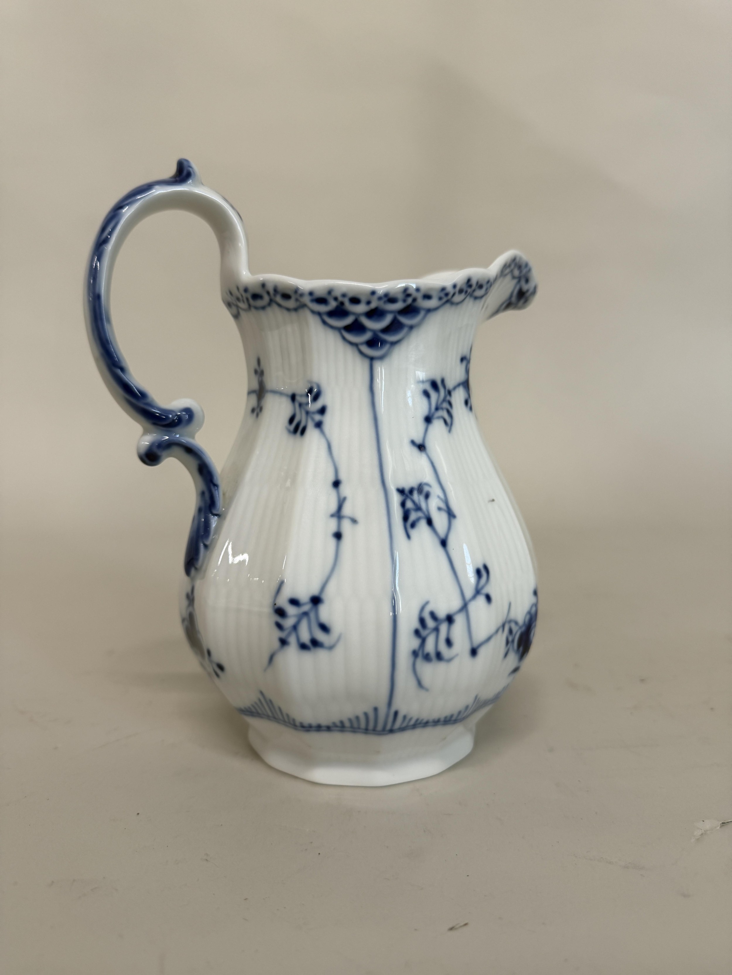 Danish porcelain jug / pitcher fluted form with a blue hand painted half lace design (stamped and editioned underside: ROYAL COPENHAGEN of DENMARK)