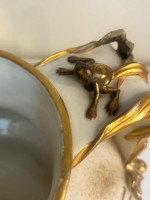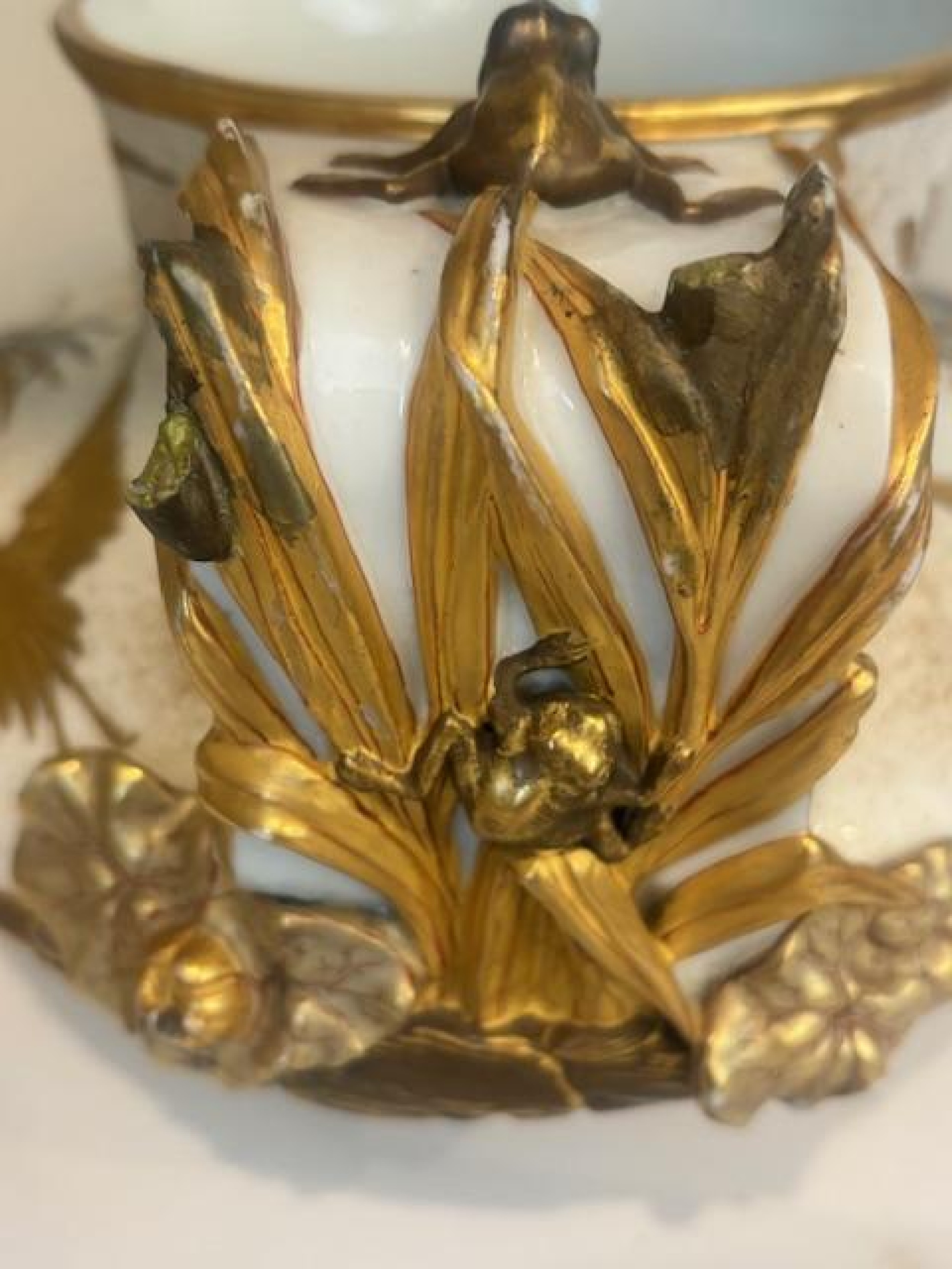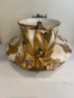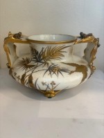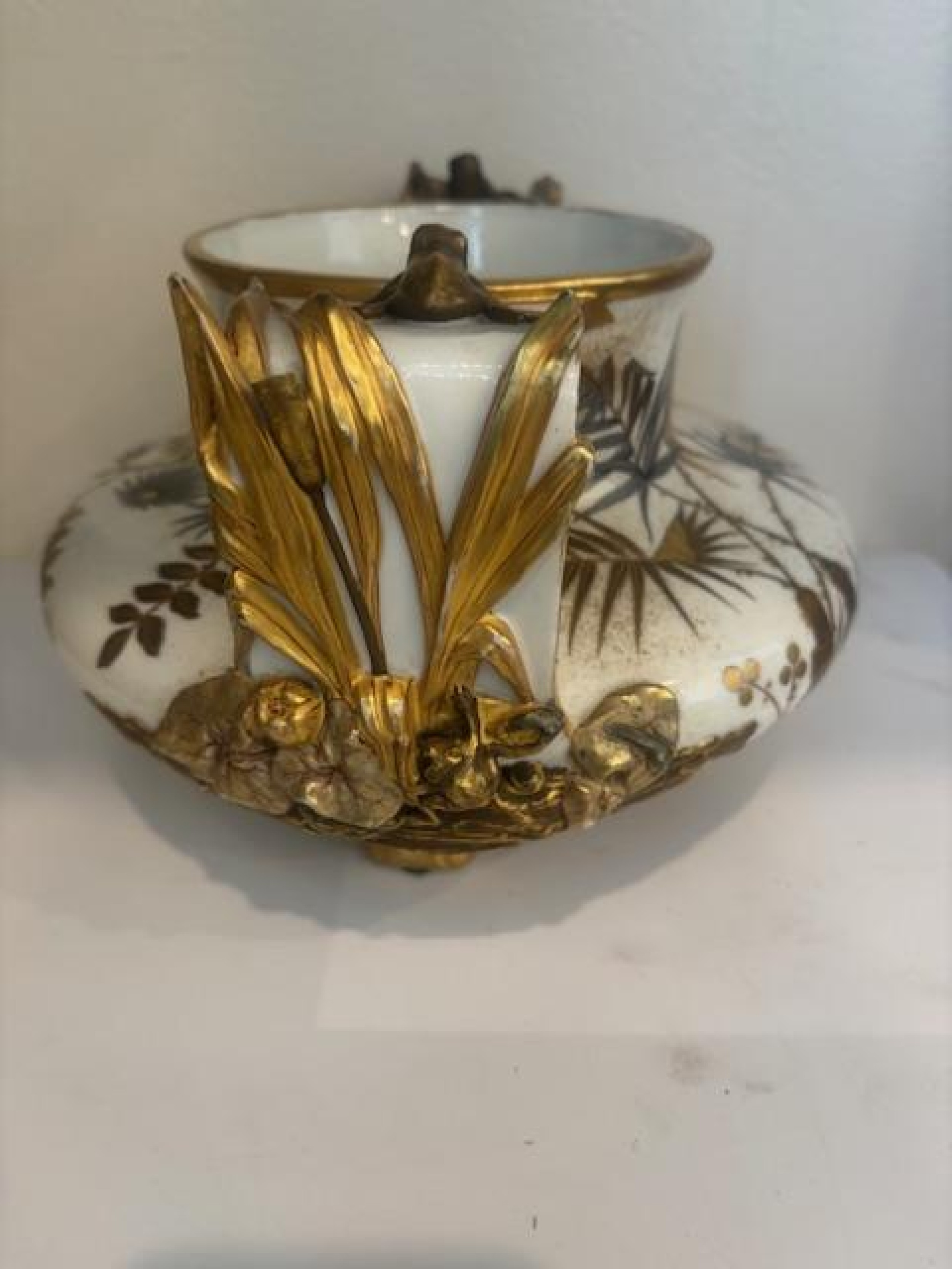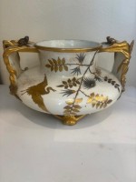English Victorian white porcelain squat form vase / centerpiece with a Japanise style gilt floral, bird, and frog design with large side handles (ROYAL WORCESTER FOR TIFFANY & CO)