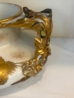 English Victorian white porcelain squat form vase / centerpiece with a Japanise style gilt floral, bird, and frog design with large side handles (ROYAL WORCESTER FOR TIFFANY & CO).