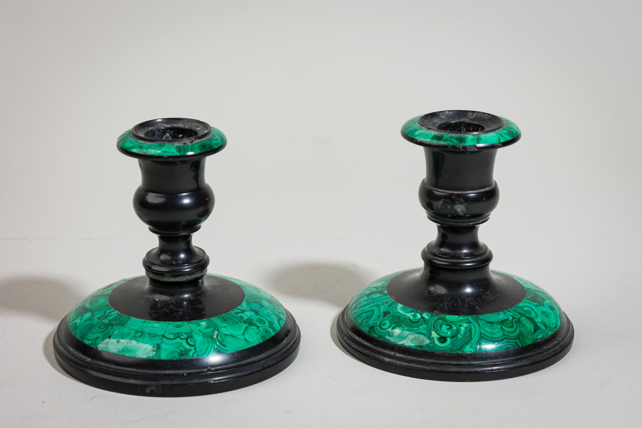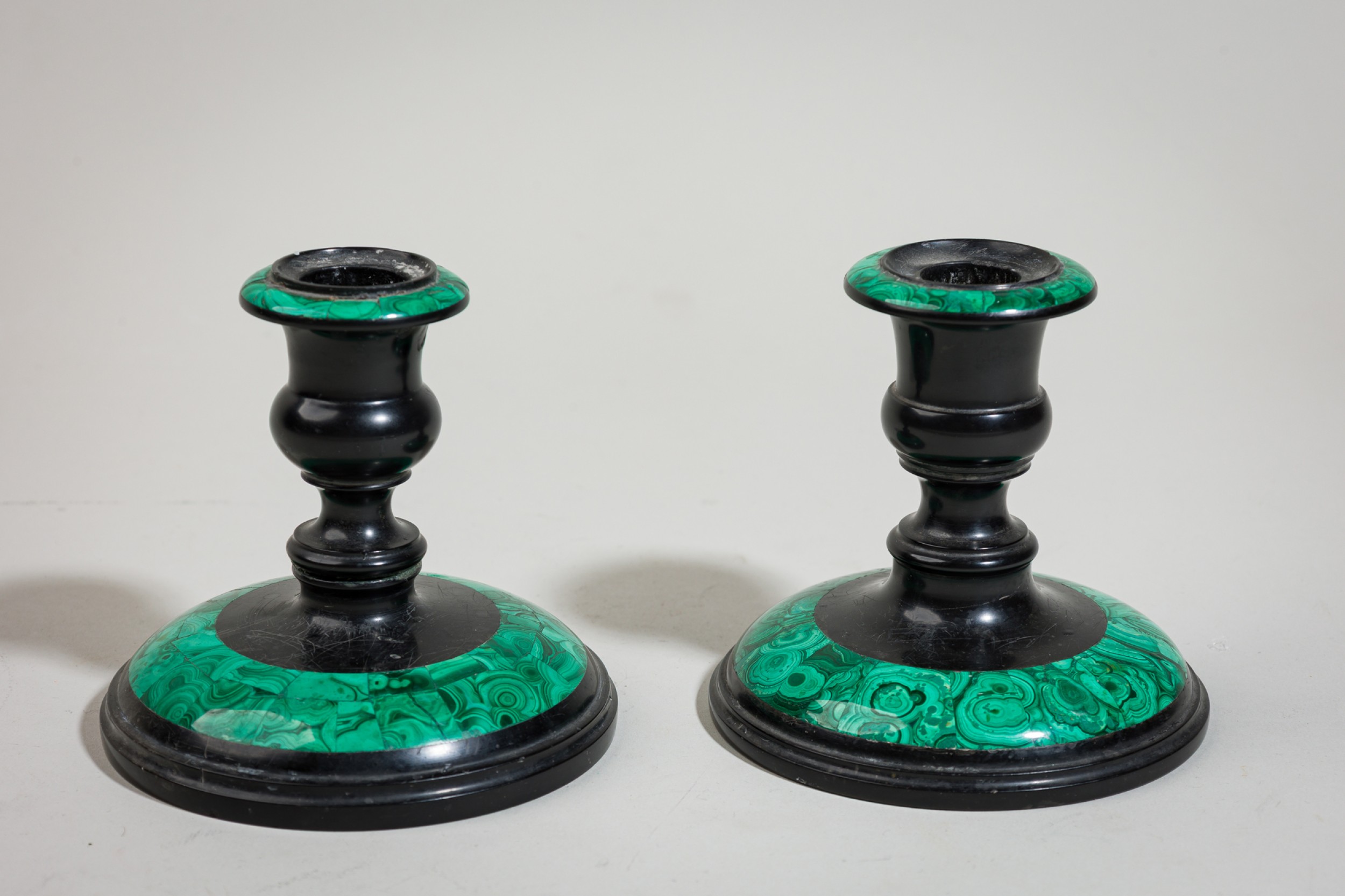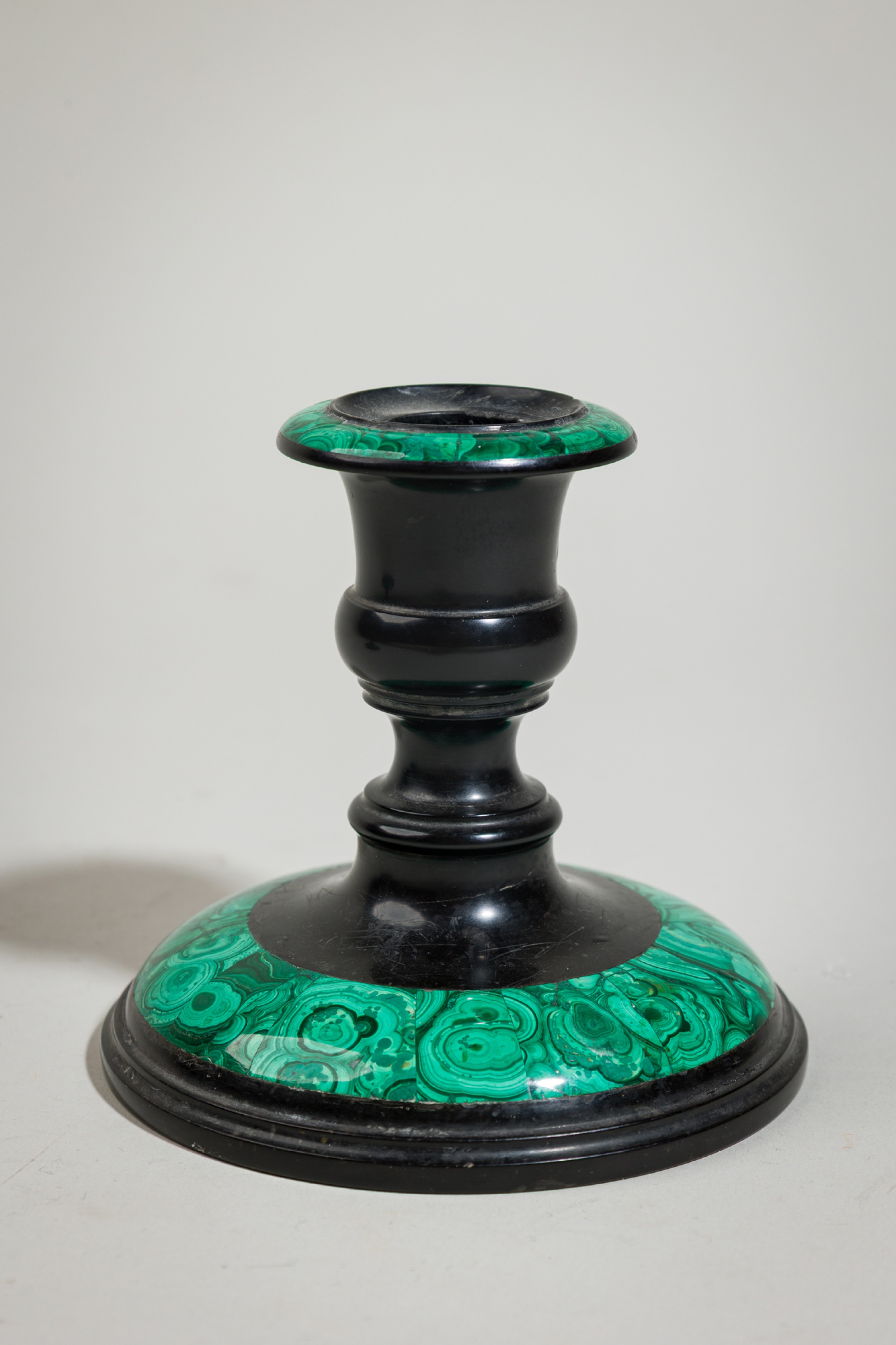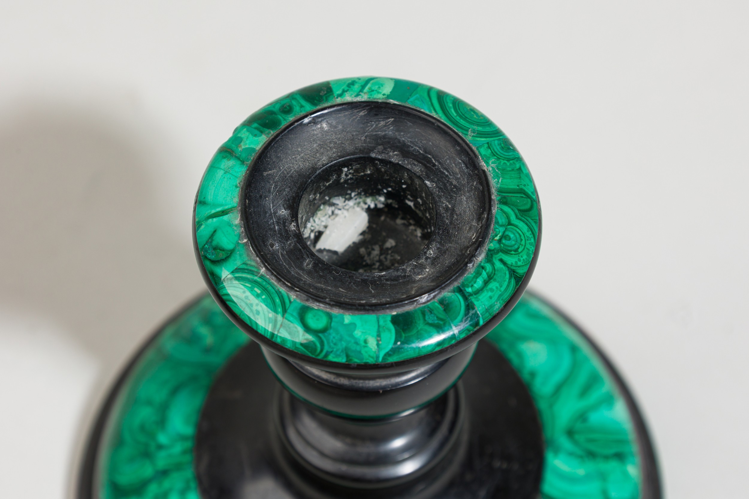 Pair Victorian Ashford Black Marble and Malachite Candlesticks PAIR of Russian (19/20th Century) round black marble candlesticks with malachite inlay trim. (PRICED AS PAIR)