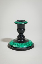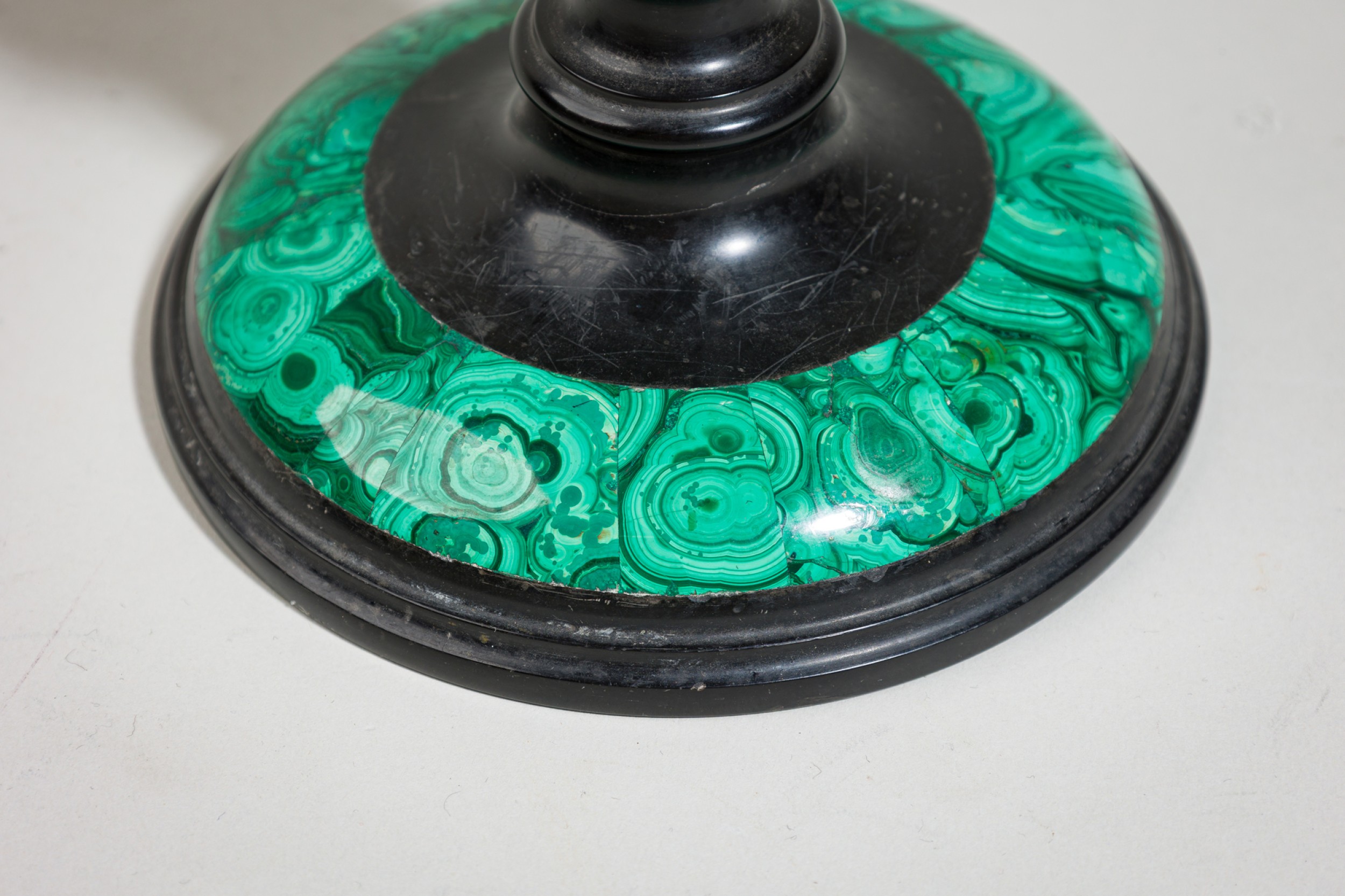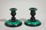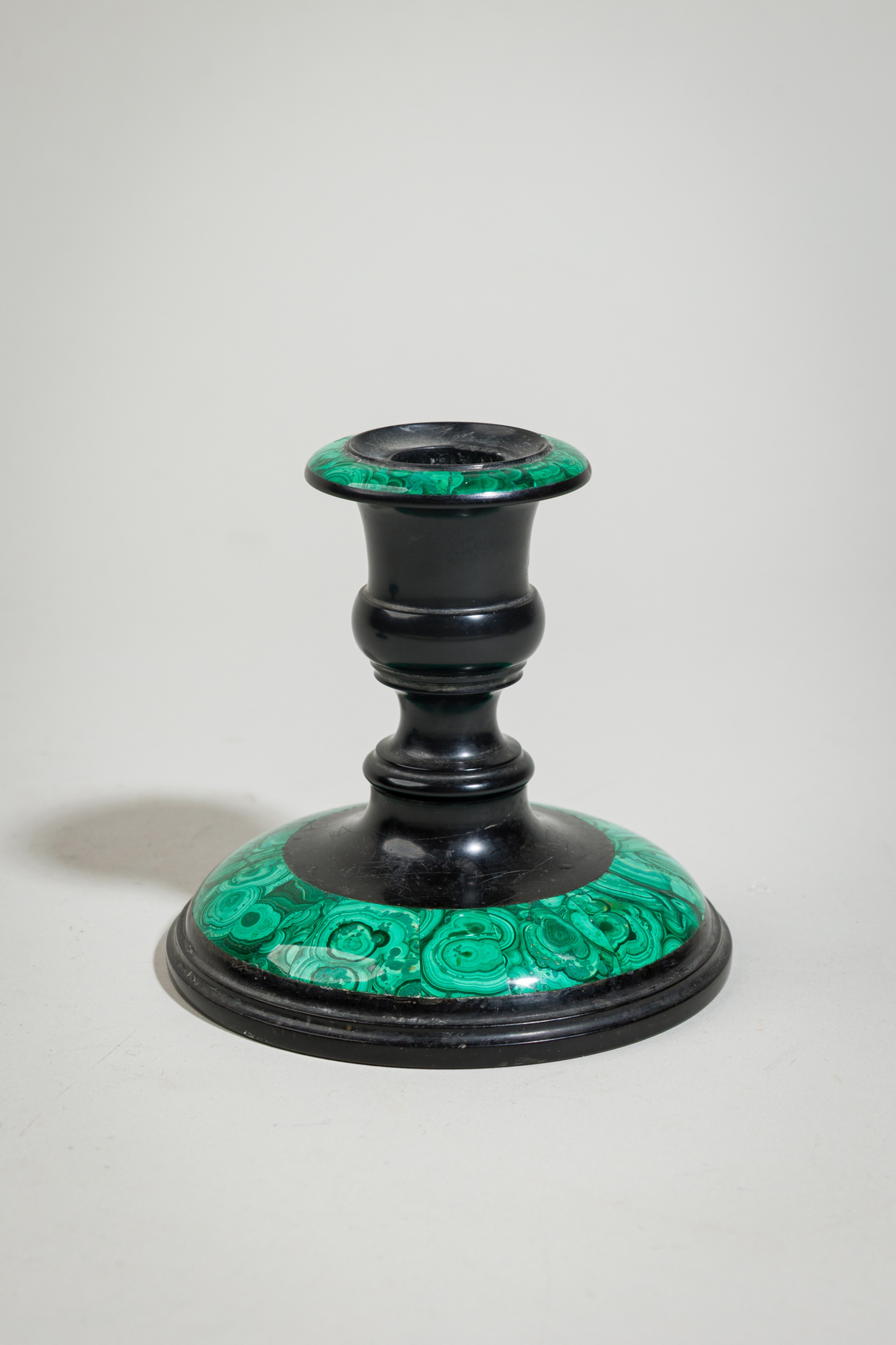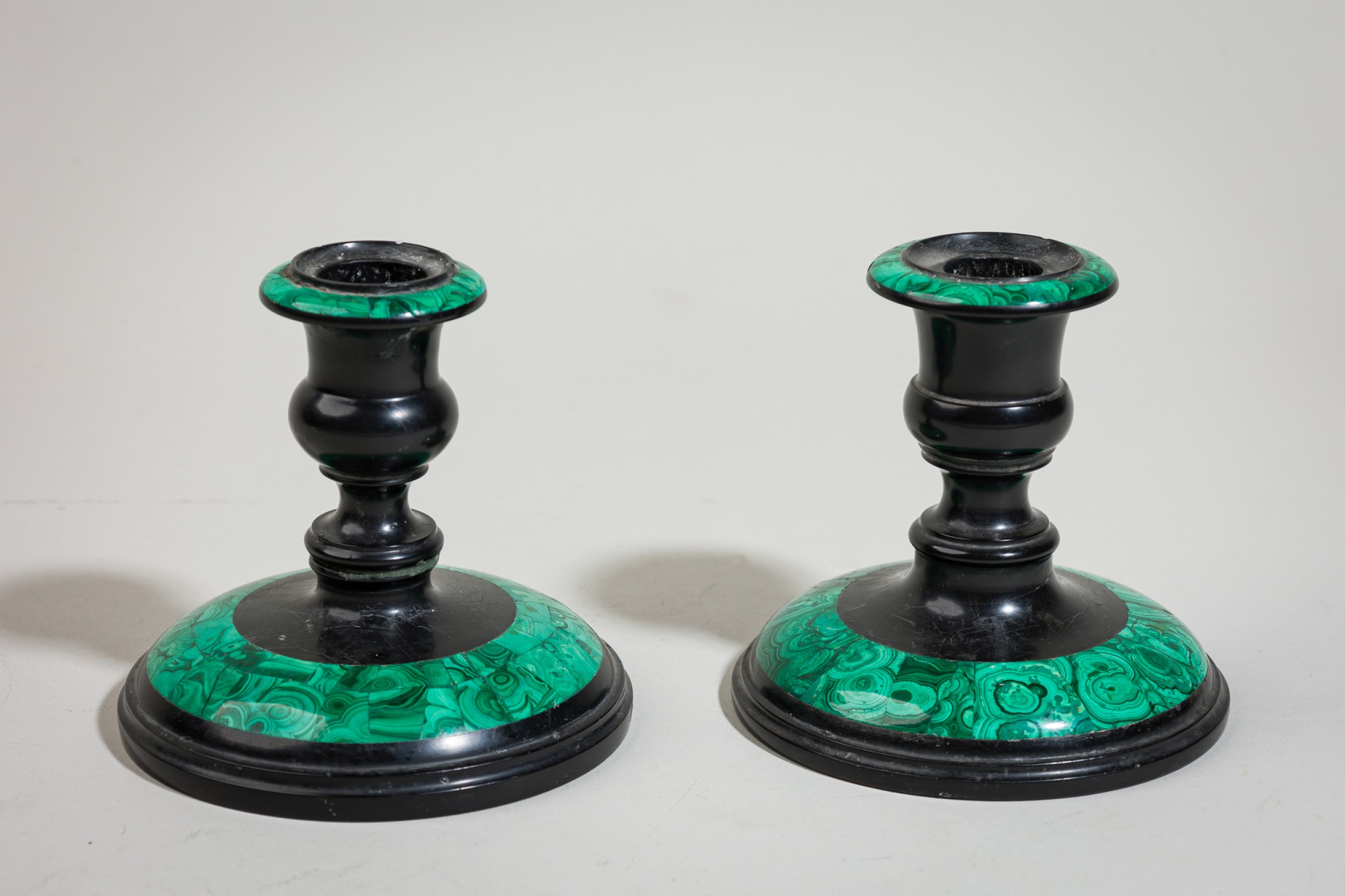 Pair Victorian Ashford Black Marble and Malachite Candlesticks PAIR of Russian (19/20th Century) round black marble candlesticks with malachite inlay trim. (PRICED AS PAIR)