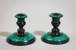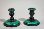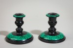 Pair Victorian Ashford Black Marble and Malachite Candlesticks PAIR of Russian (19/20th Century) round black marble candlesticks with malachite inlay trim. (PRICED AS PAIR).