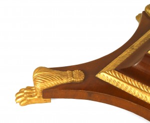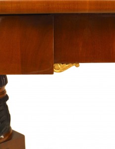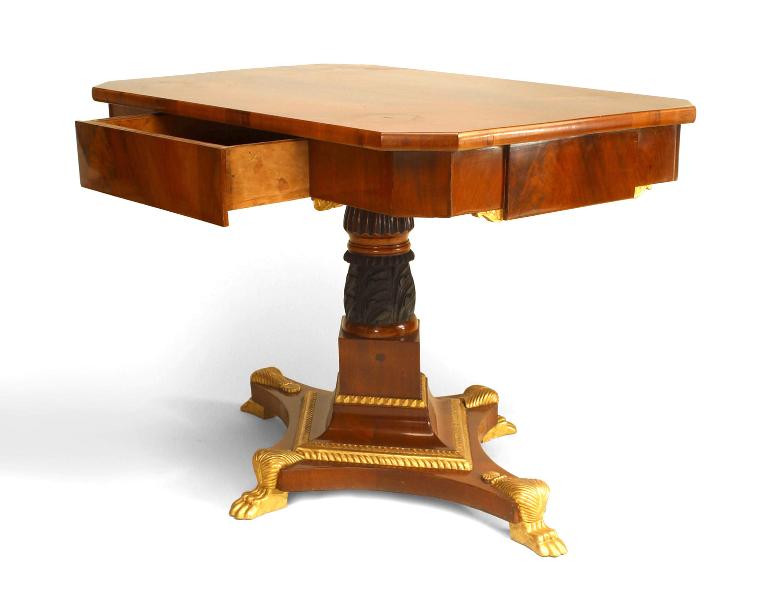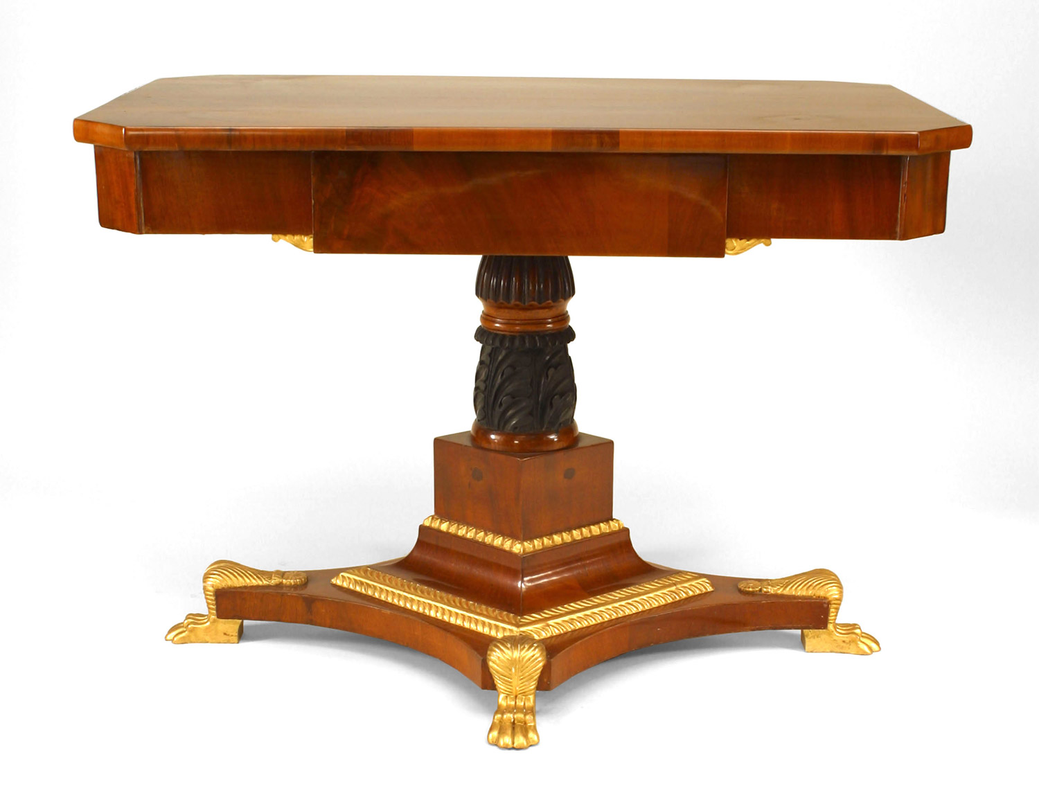 Russian Neoclassic (19th Century) parcel gilt & ebonized mahogany center table with a frieze drawer on an acanthus carved stem and quadripartite base with claw feet..