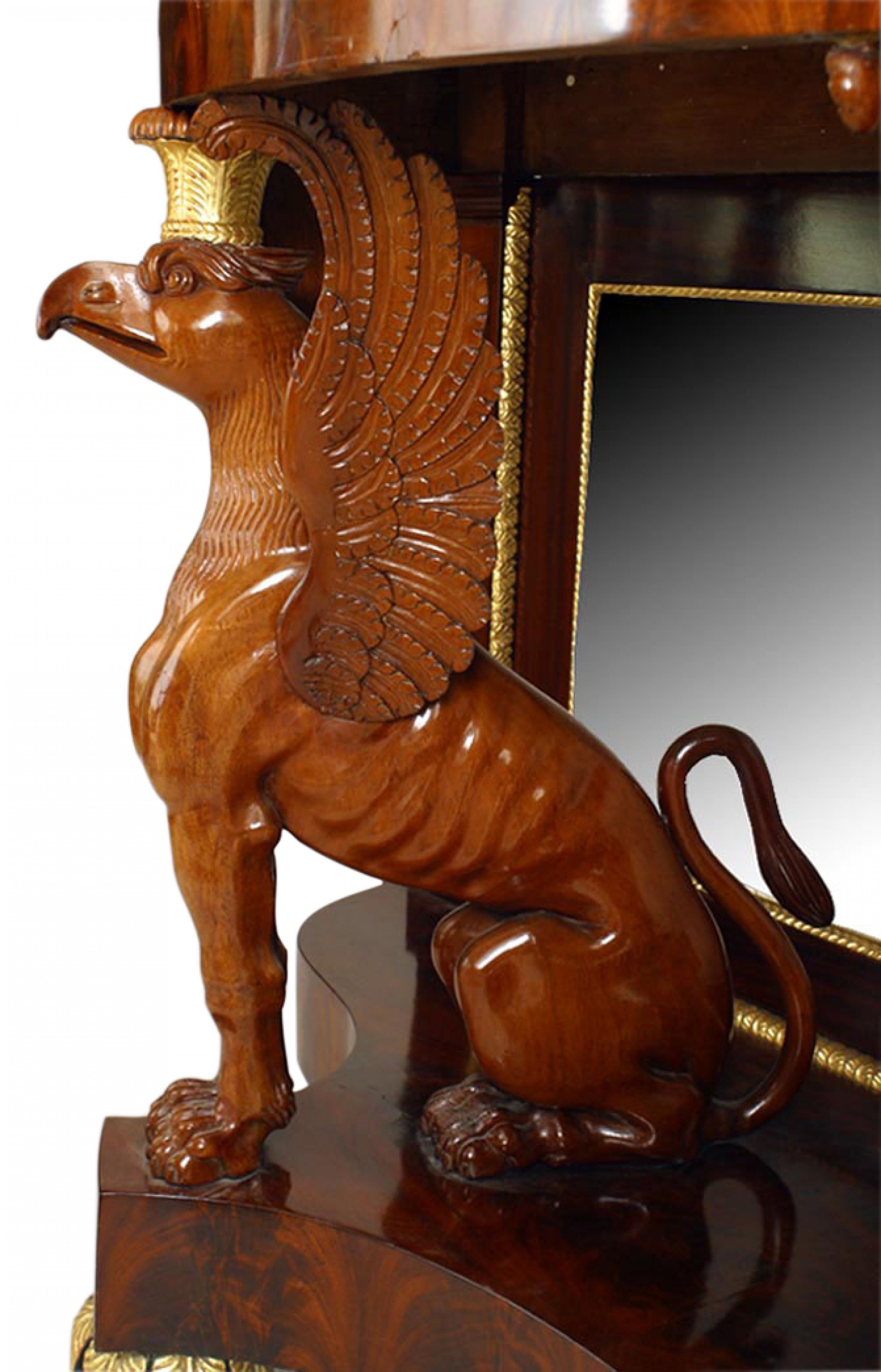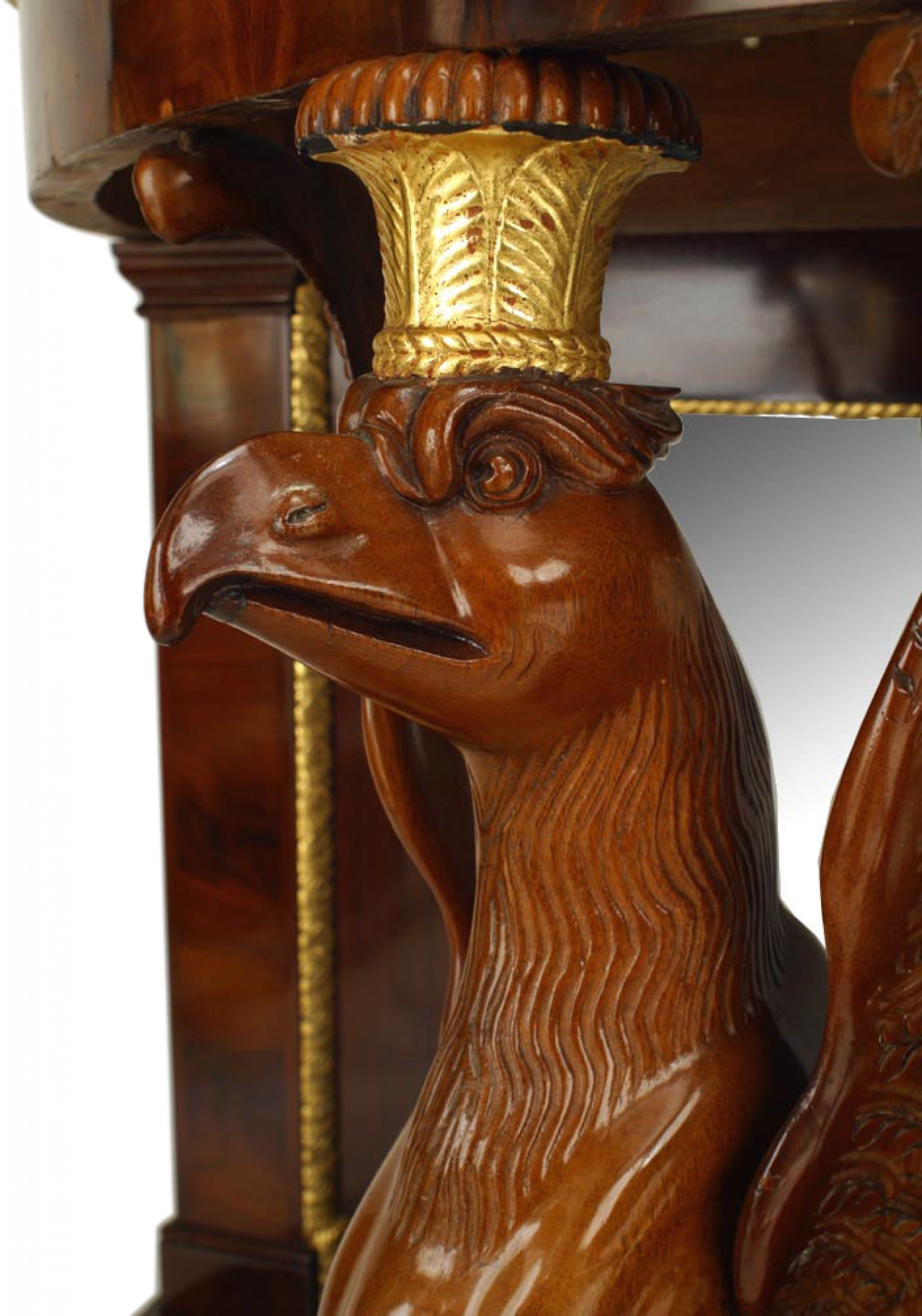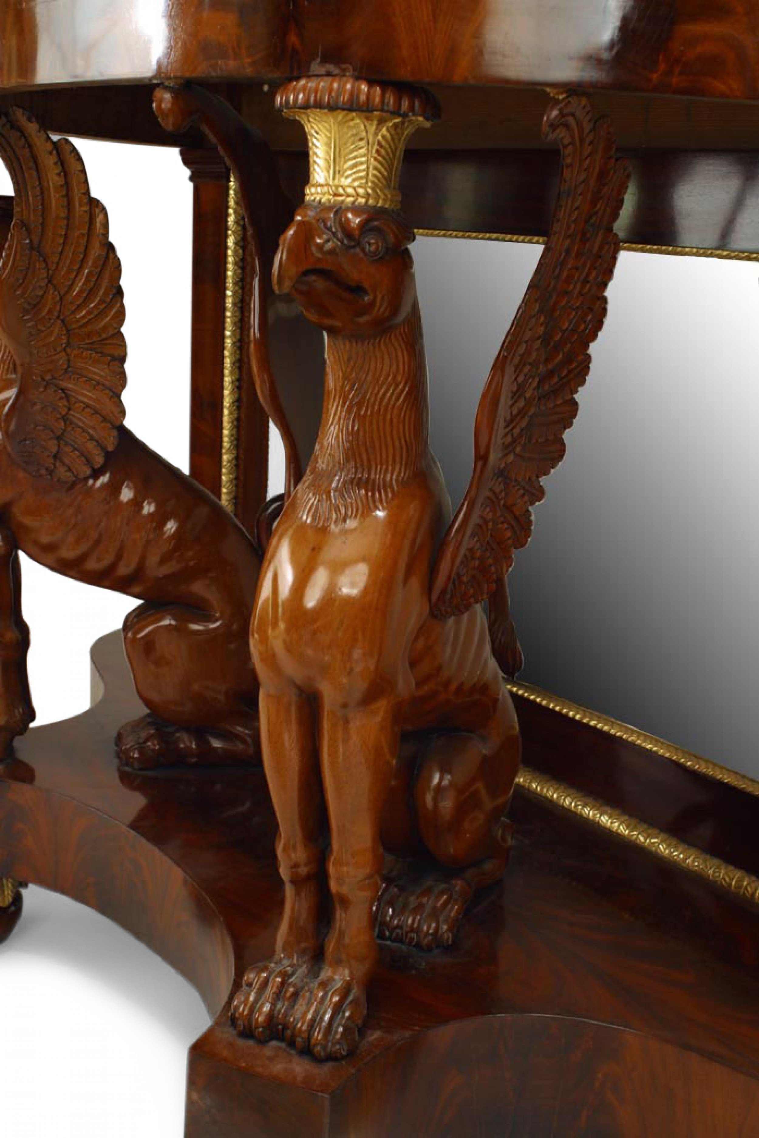 Russian Neoclassic (Early 19th Century) parcel gilt mahogany demilune console table with white marble top above two griffin supporters and mirrored back..