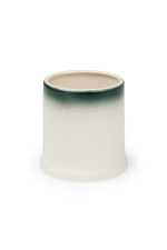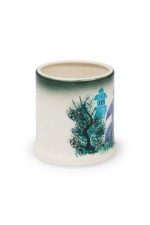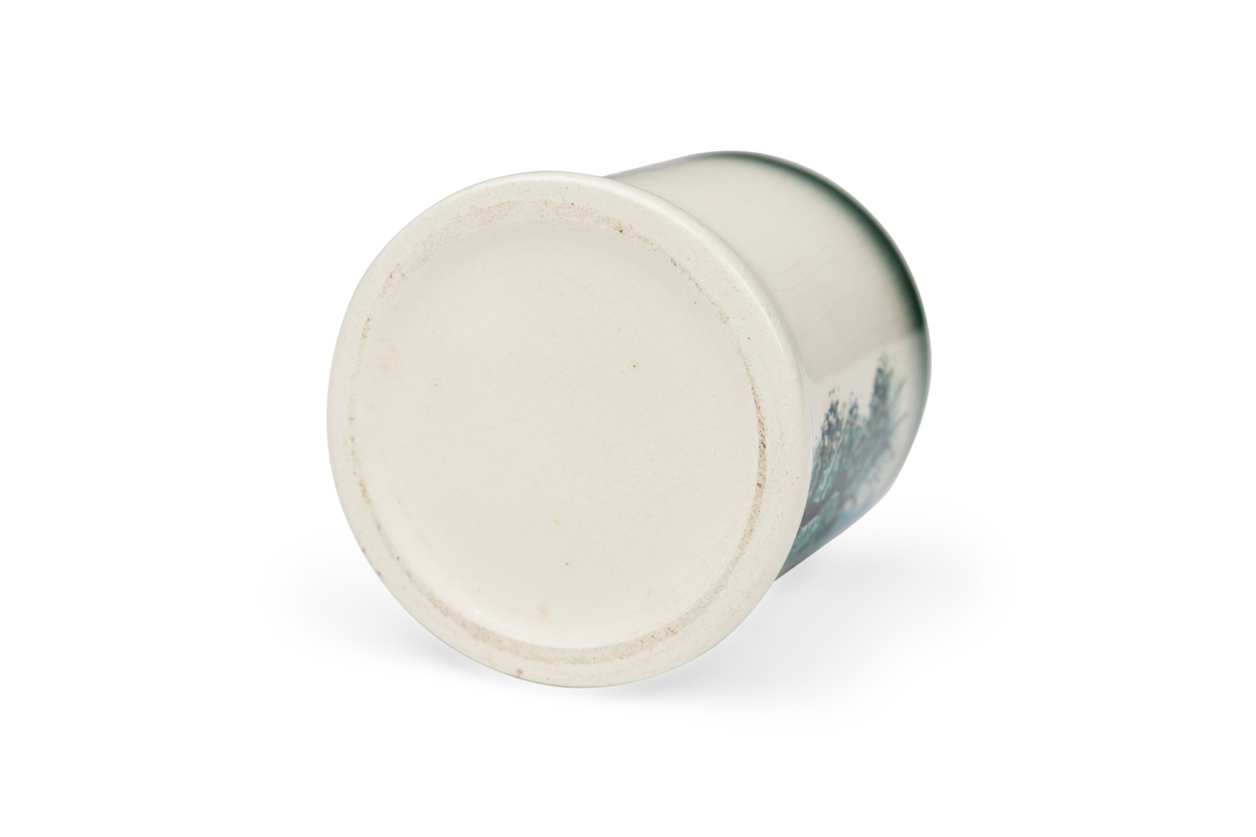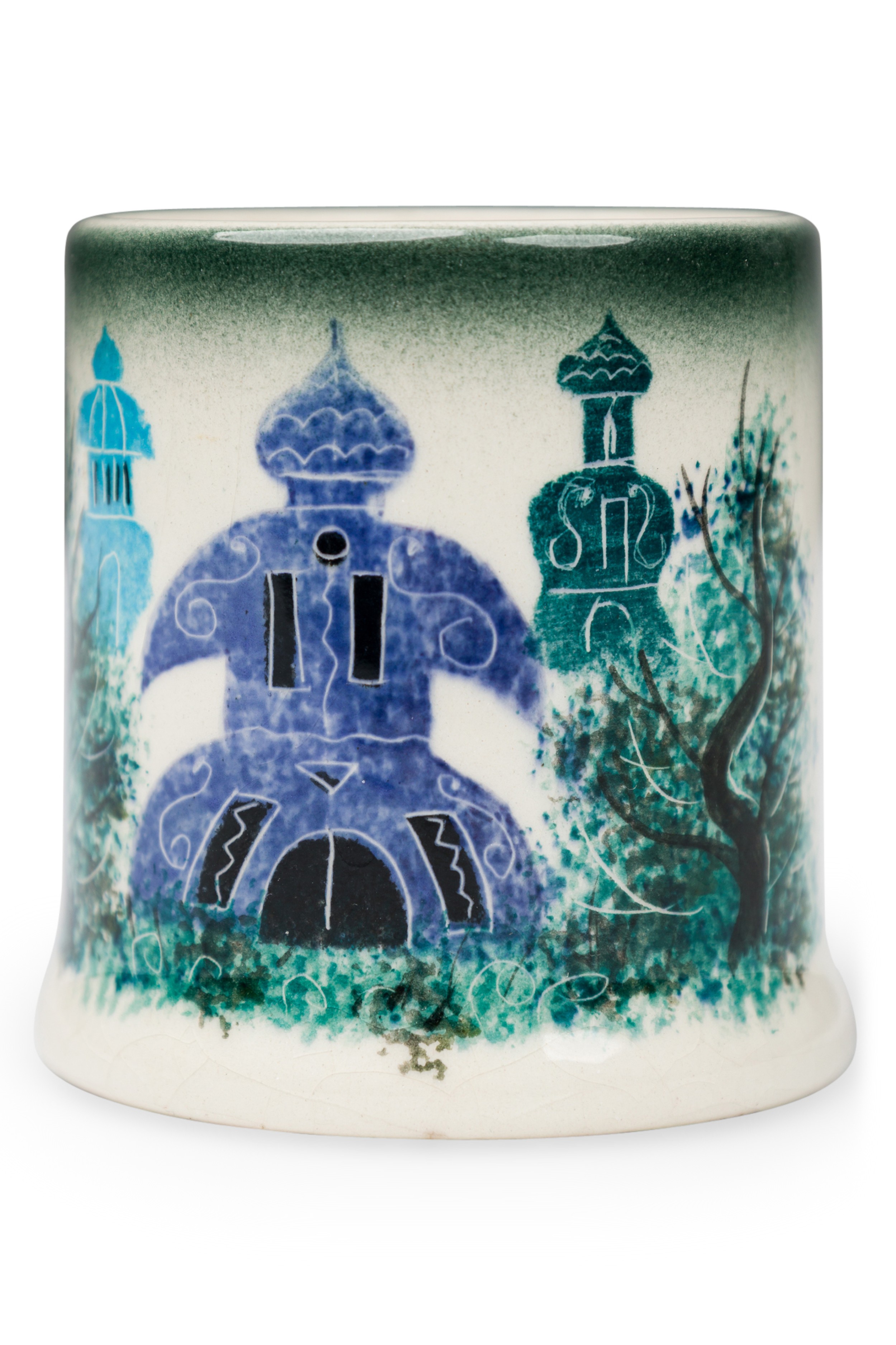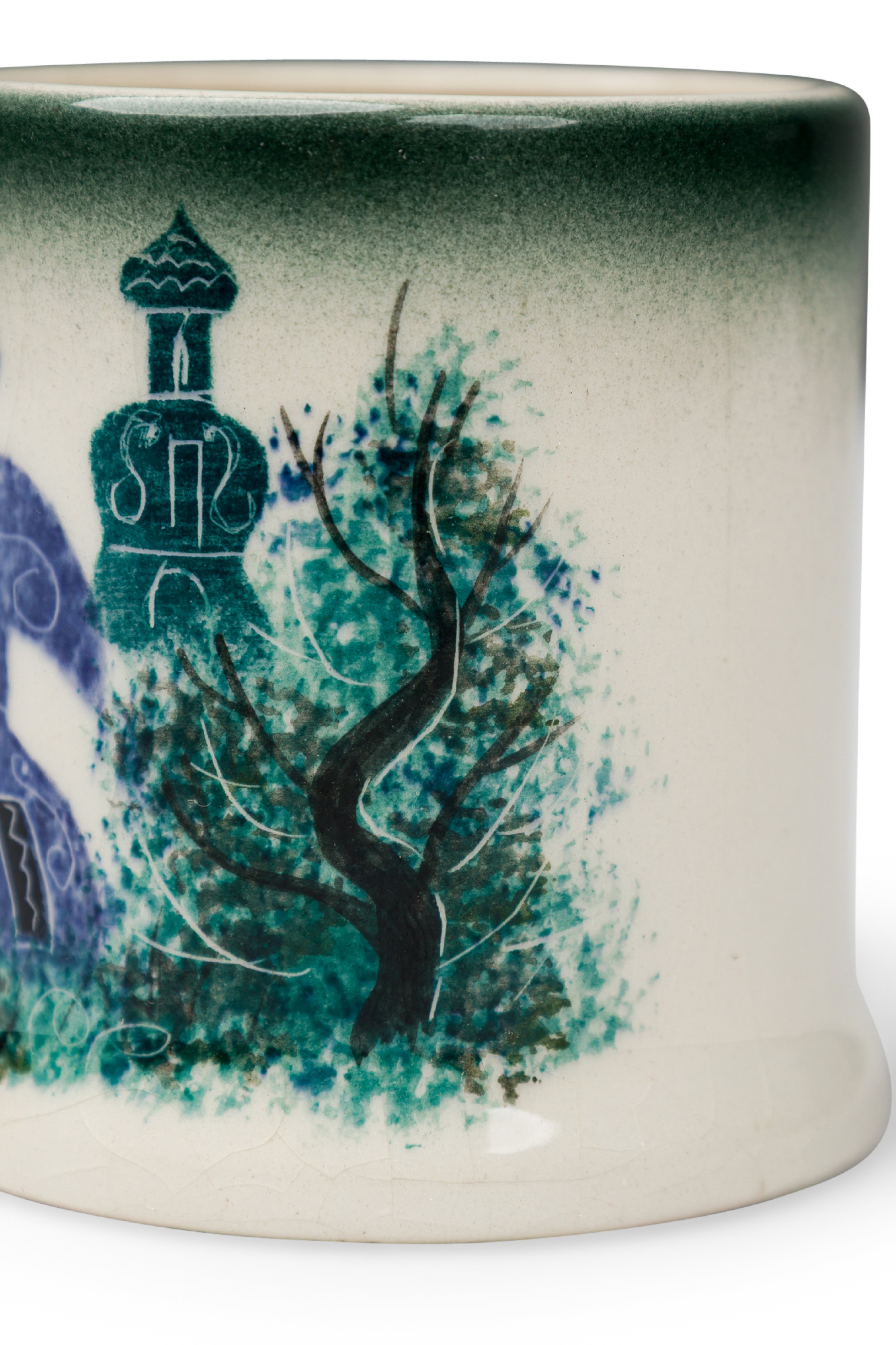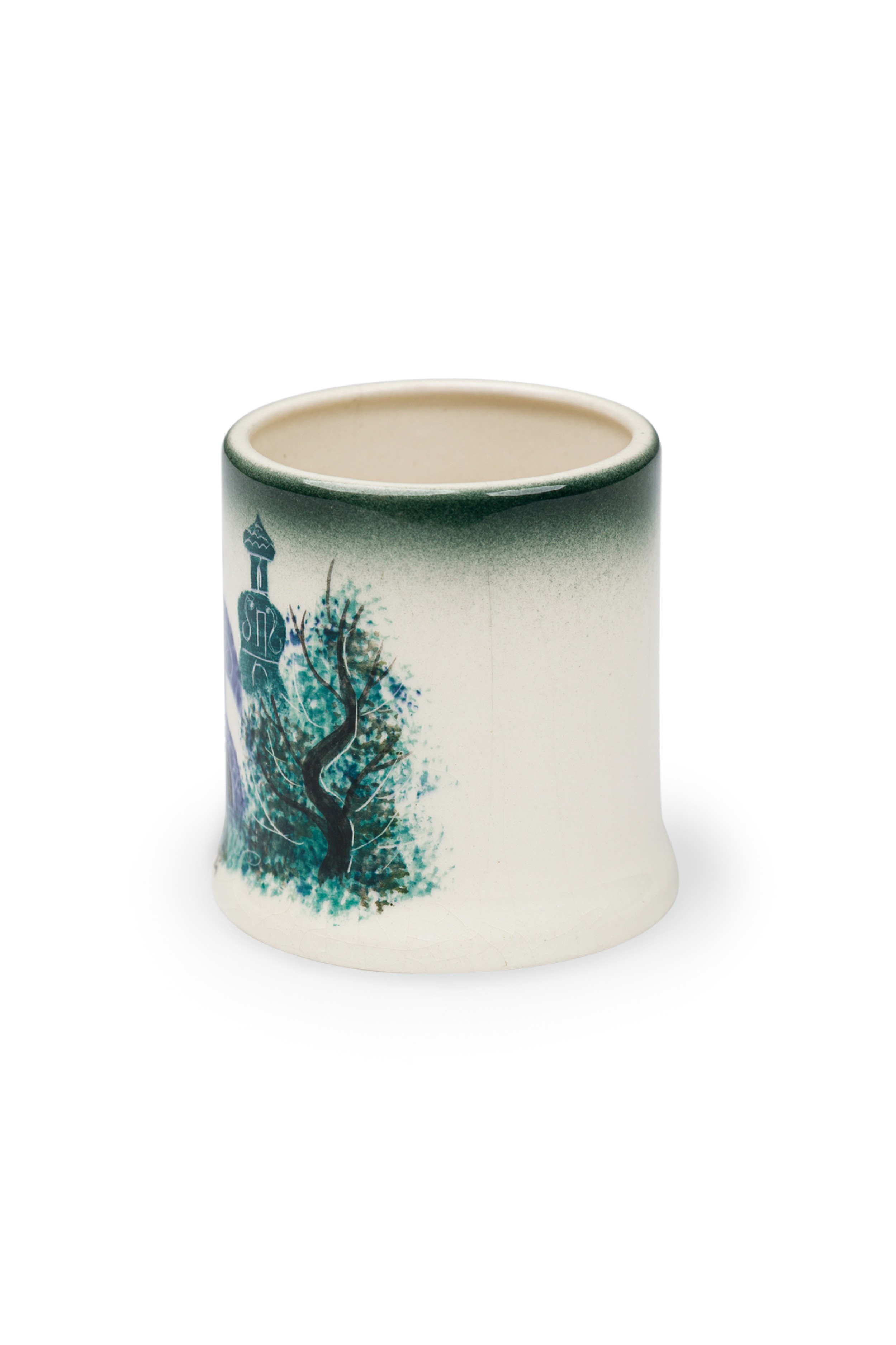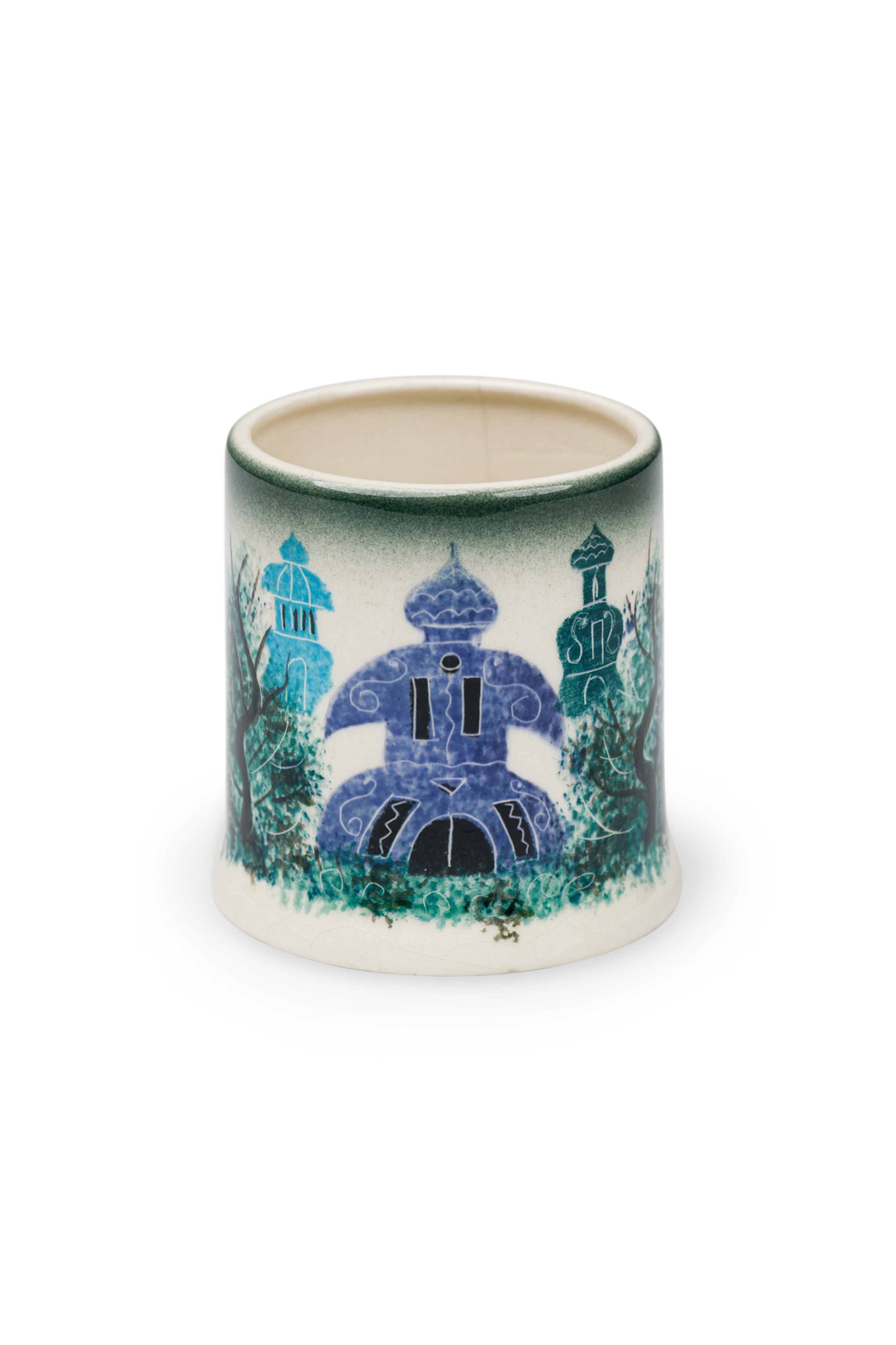 Russian Vintage folk art design mug with a slightly tapered body on a circular base having a blue / green
