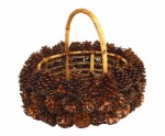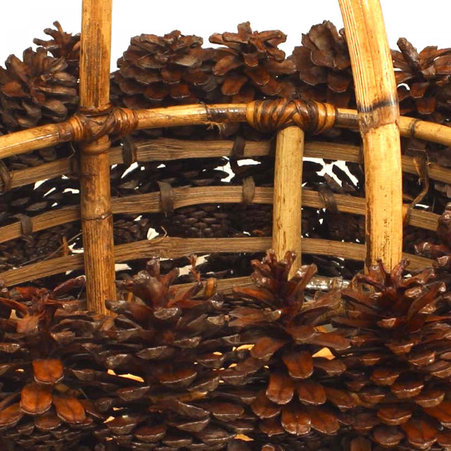 Rustic Adirondack-style (1940s) oval picnic basket covered with large pine cones and a bamboo hoop handle.