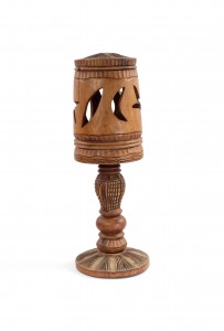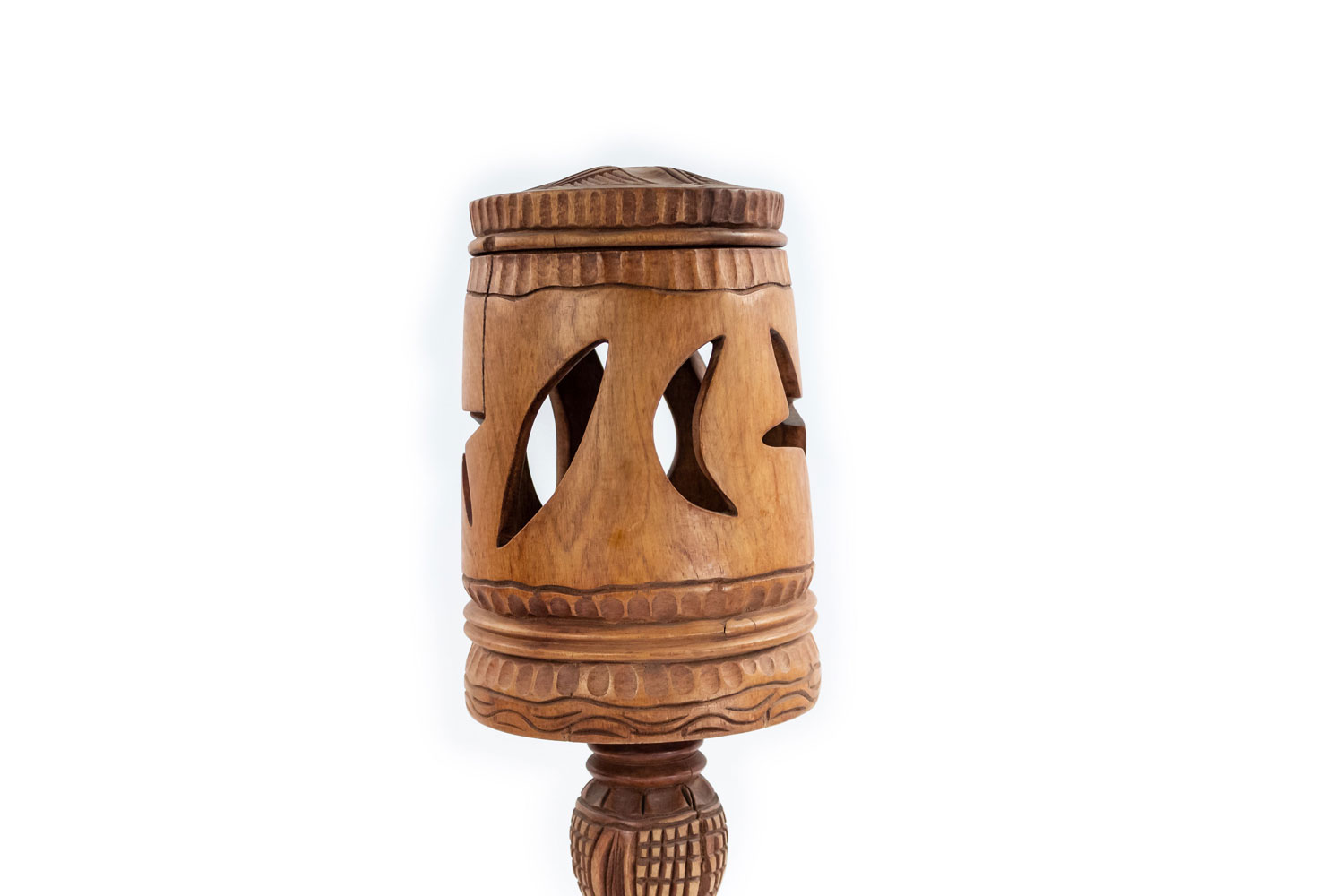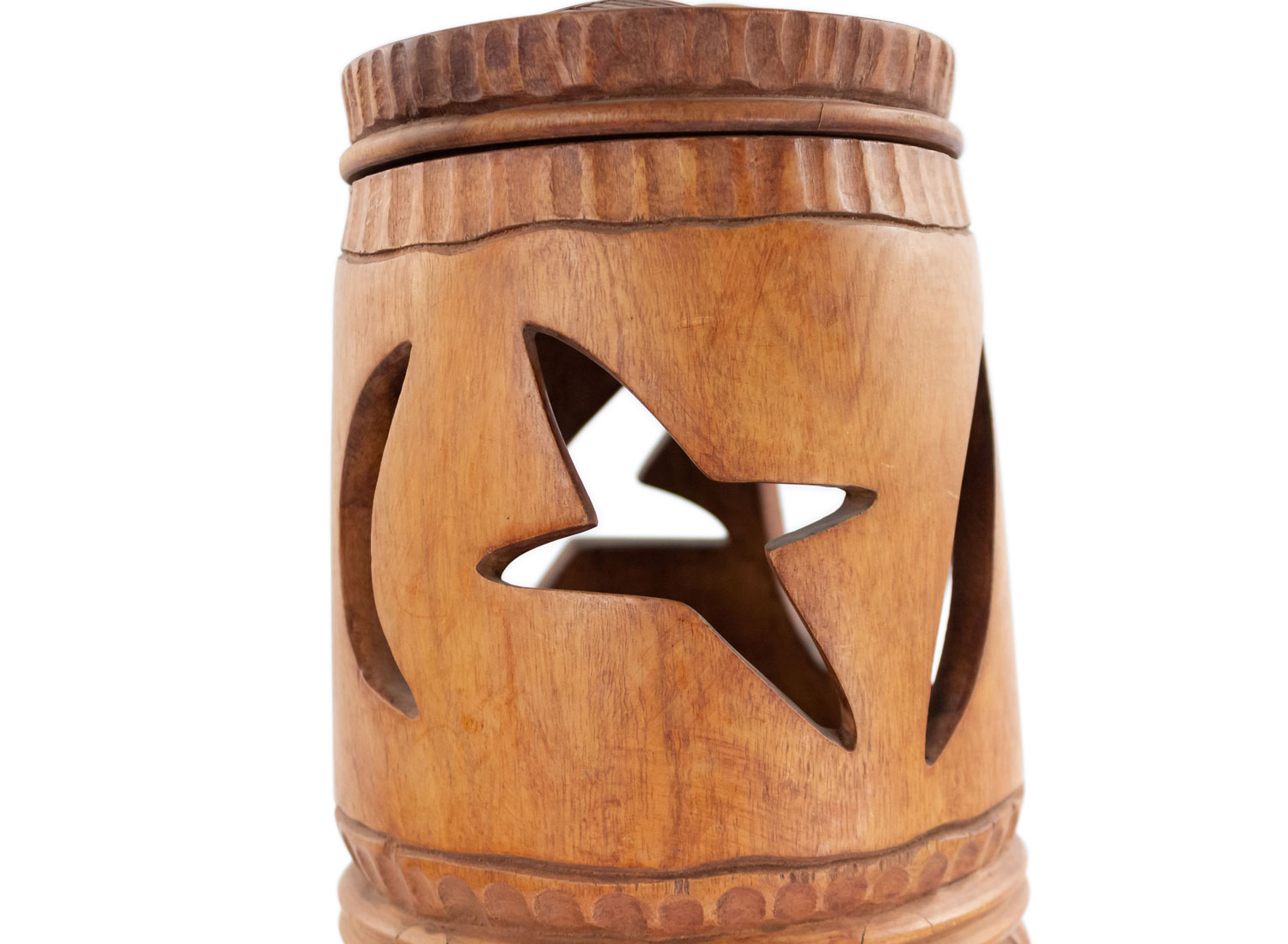 PAIR of Rustic American Adirondack style (1930s possibly Haitian) light wood table lamps wIth carved moon and star cut out design shade under a top cover (PRICED AS PAIR).