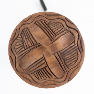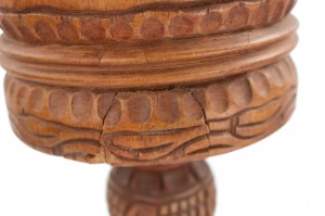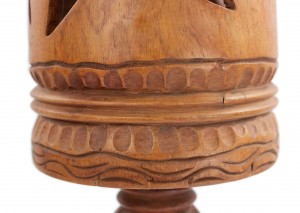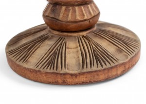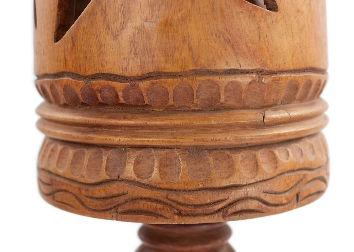 Style: Rustic Materials & Techniques: Carved, iron, wood Category: Lighting Condition: Former glue repair on one shade