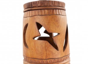 PAIR of Rustic American Adirondack style (1930s possibly Haitian) light wood table lamps wIth carved moon and star cut out design shade under a top cover (PRICED AS PAIR)..