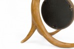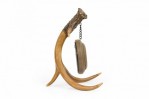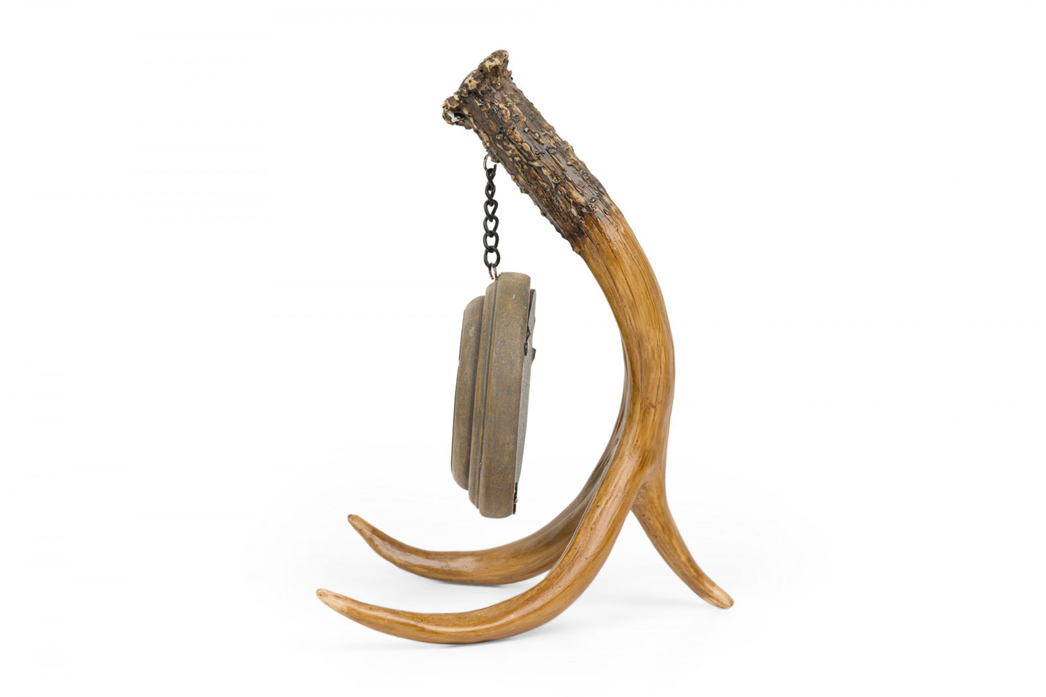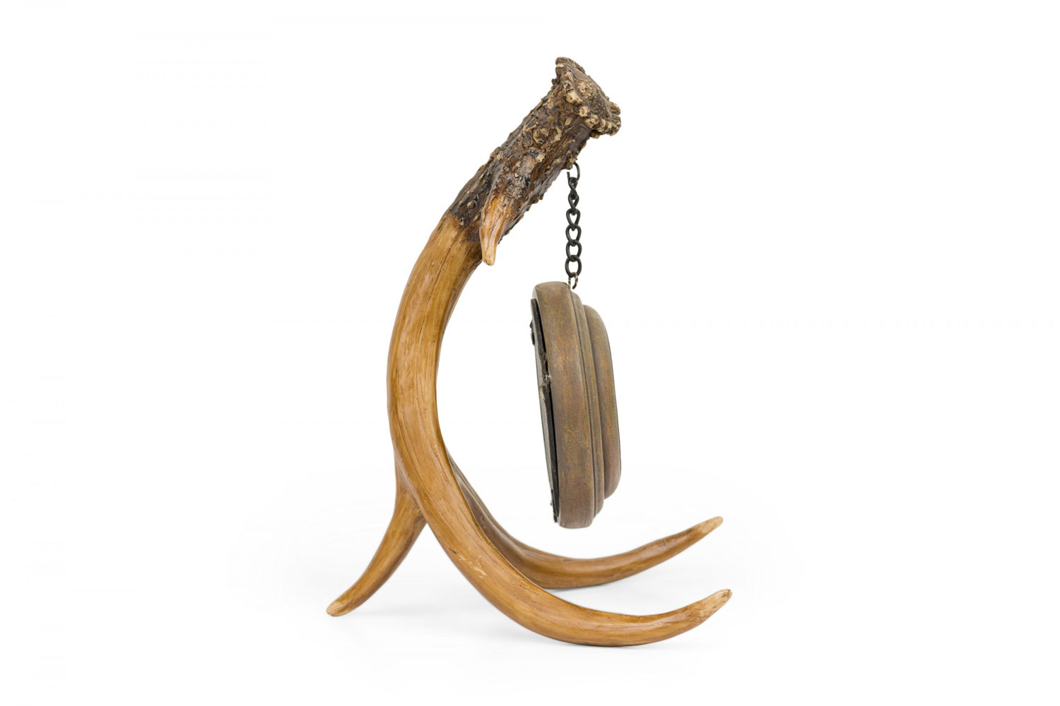 Rustic Continenetal-style table clock with a resin faux antler stand suspending a brass cased black and beige enamel-faced clock from a small chain.