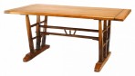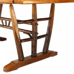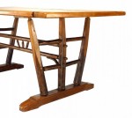 Rustic Old Hickory (Circa 1940) dining table with rectangular top on trestle supports joined by a spindle stretcher (branded: Old Hickory; Martinsville, Indiana)