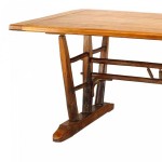 Rustic Old Hickory (Circa 1940) dining table with rectangular top on trestle supports joined by a spindle stretcher (branded: Old Hickory; Martinsville, Indiana).