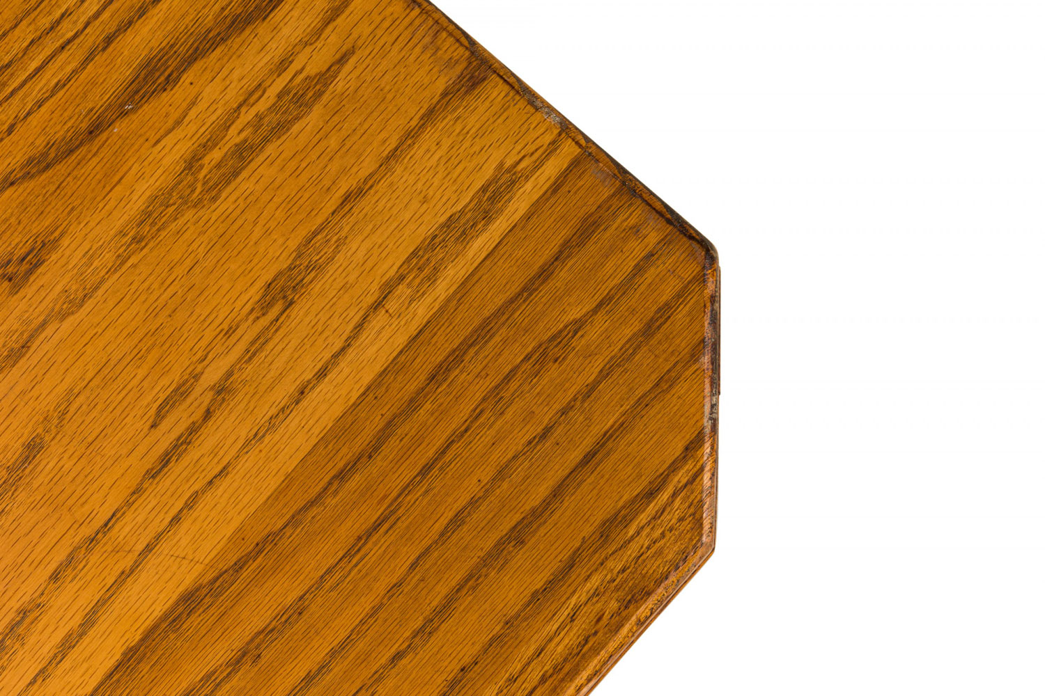 Rustic Old Hickory (Mid-20th Century) coffee table with a rectangular oak top with canted corners supported by a pedestal base ending in an x-shaped log foot with bentwood supports. (signed with brand on bottom, OLD HICKORY).