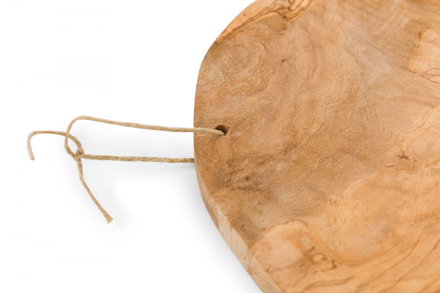 Rustic rectangular olive wood cutting board with live edge organic shape.