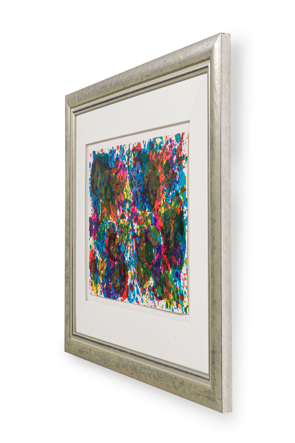 Contemporary American Abstract Expressionist lithograph with scattered colors in an automatic manner in a silver frame with white mat (Certificate of Authenticity: SAM FRANCIS).