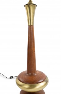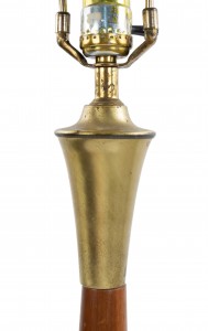PAIR of Post War Design Scandinavian teak table lamps with a bulbous base and long tapered neck with a brass edge and trim (PRICED AS PAIR).