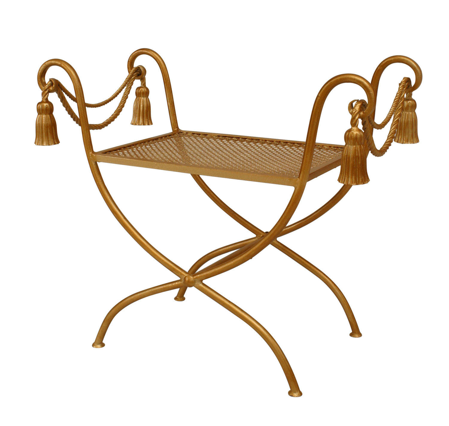 Italian 1940s gilt metal rope and tassel design bench with side arms and mesh seat.