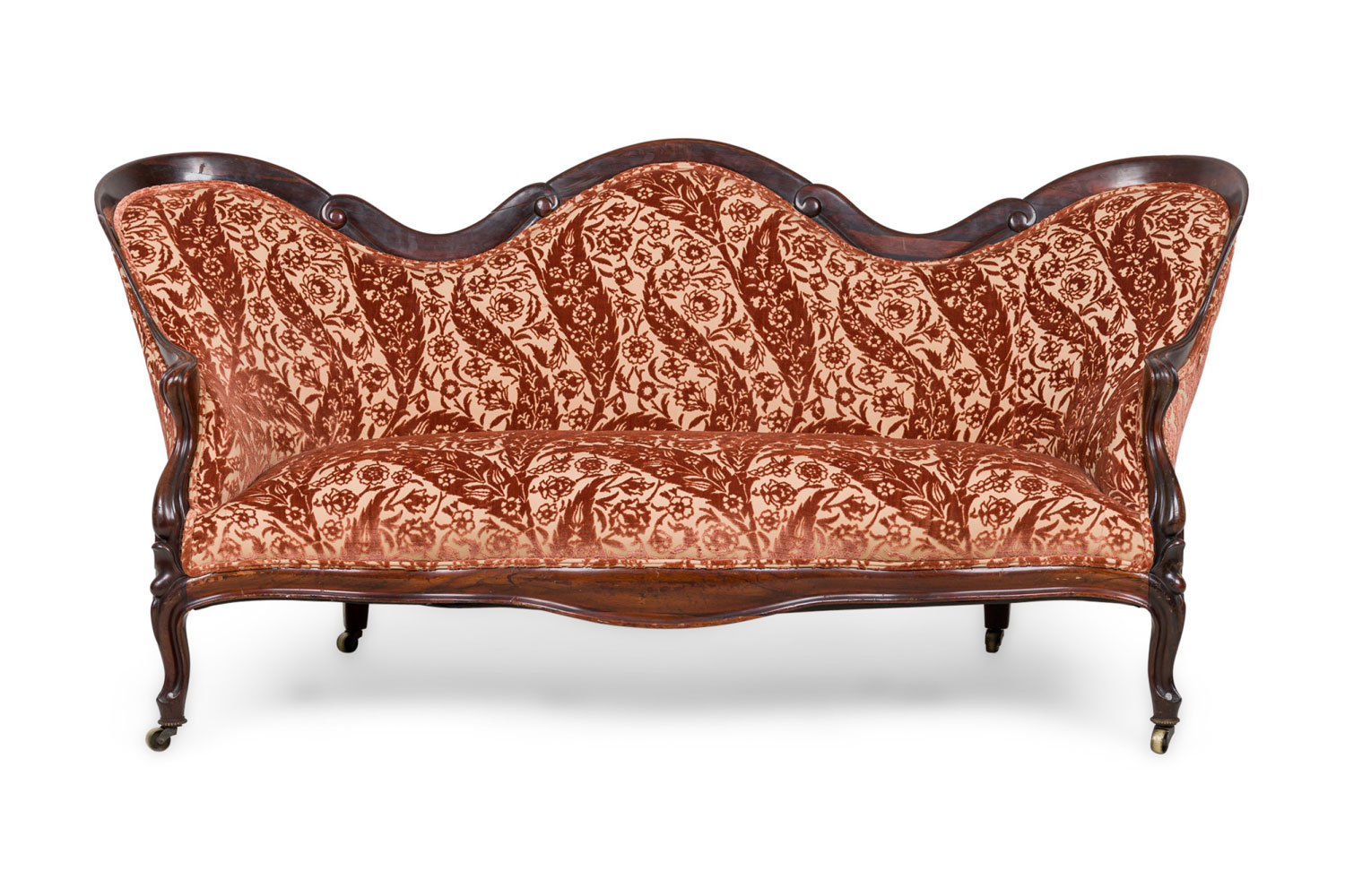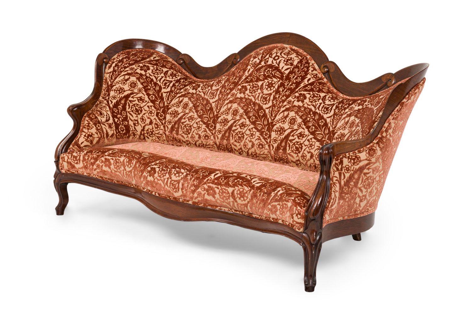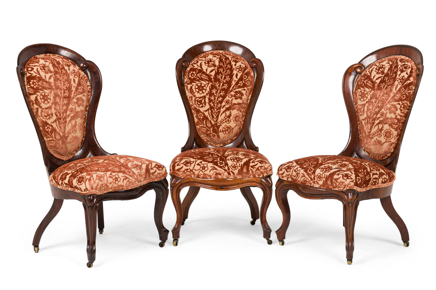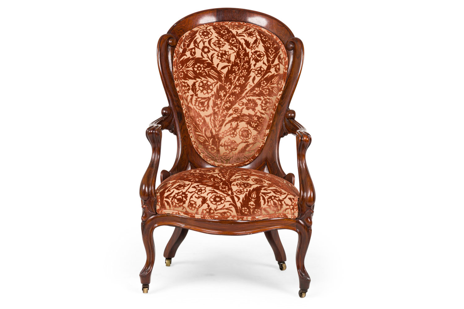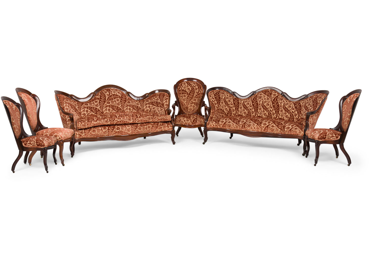 6 Piece American Victorian rosewood salon set with scroll design backs, upholstered in a cream-colored fabric with a raised rich mauve velvet floral design. (att: John Henry Belter) (Pieces available individually: 2 settees-1 with removable cushion: 041801A, 1 with incorporated cushion: 041801D; arm chair: 041801B; 3 side chairs: 041801C).