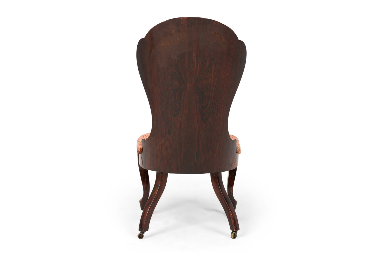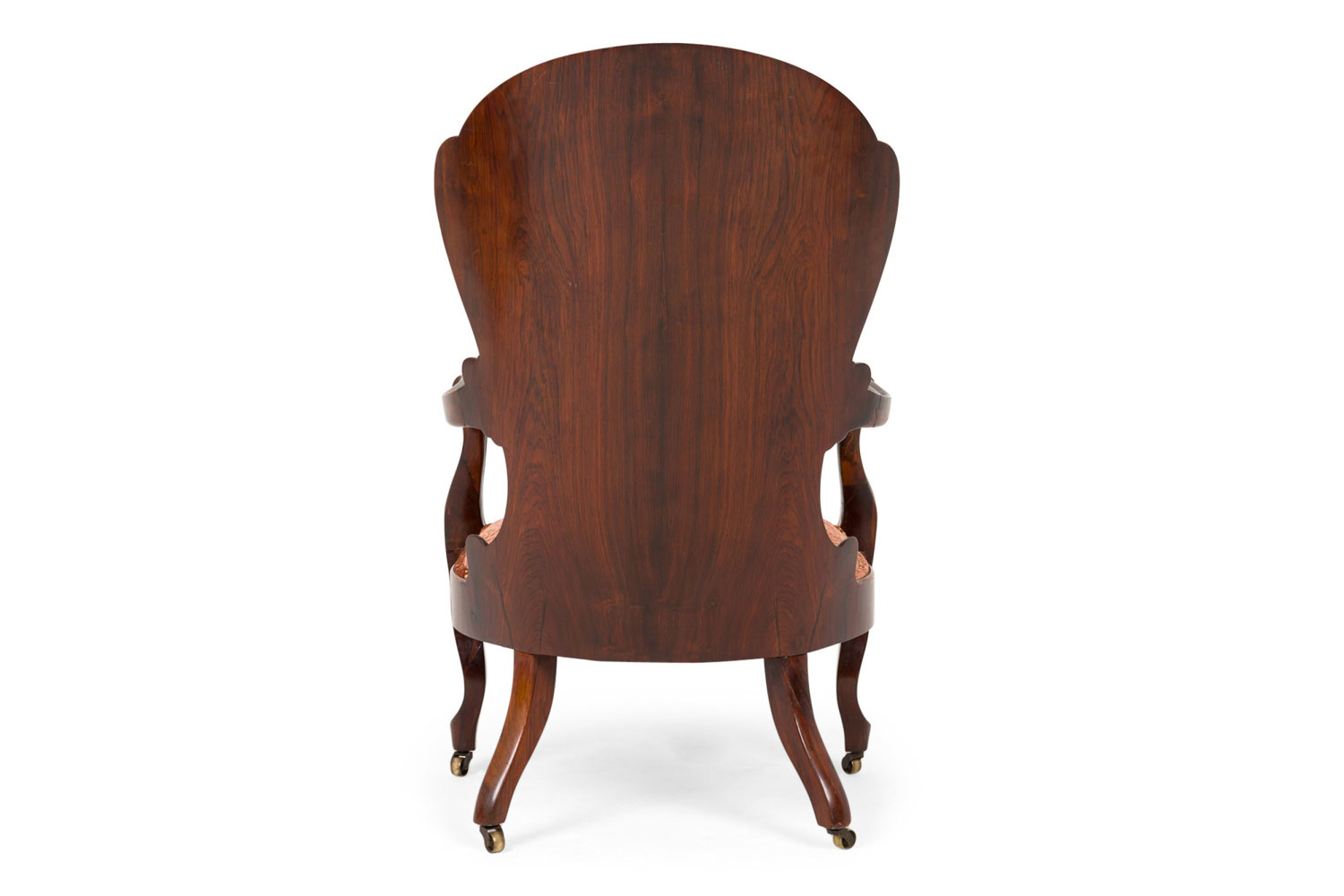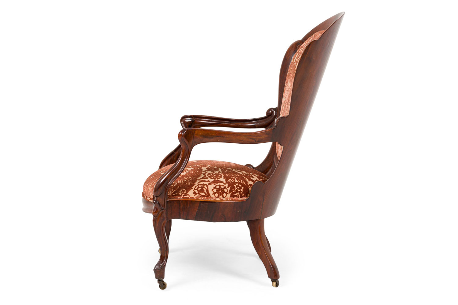 6 Piece American Victorian rosewood salon set with scroll design backs, upholstered in a cream-colored fabric with a raised rich mauve velvet floral design. (att: John Henry Belter) (Pieces available individually: 2 settees-1 with removable cushion: 041801A, 1 with incorporated cushion: 041801D; arm chair: 041801B; 3 side chairs: 041801C)