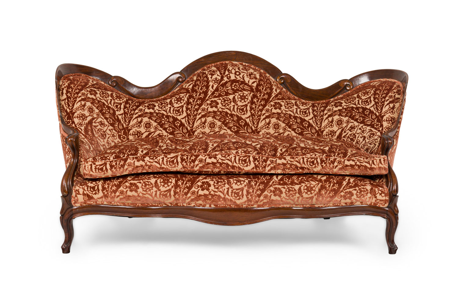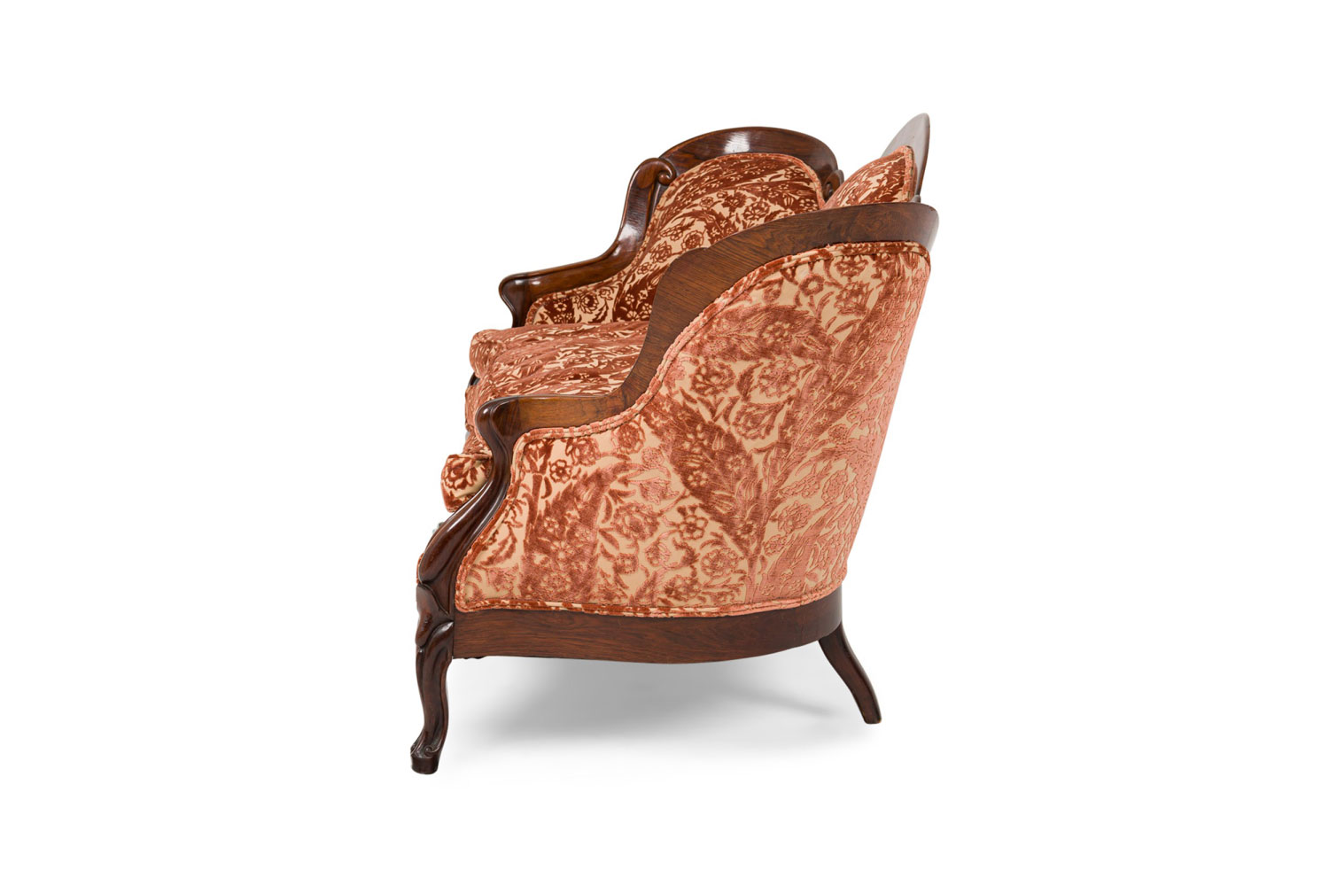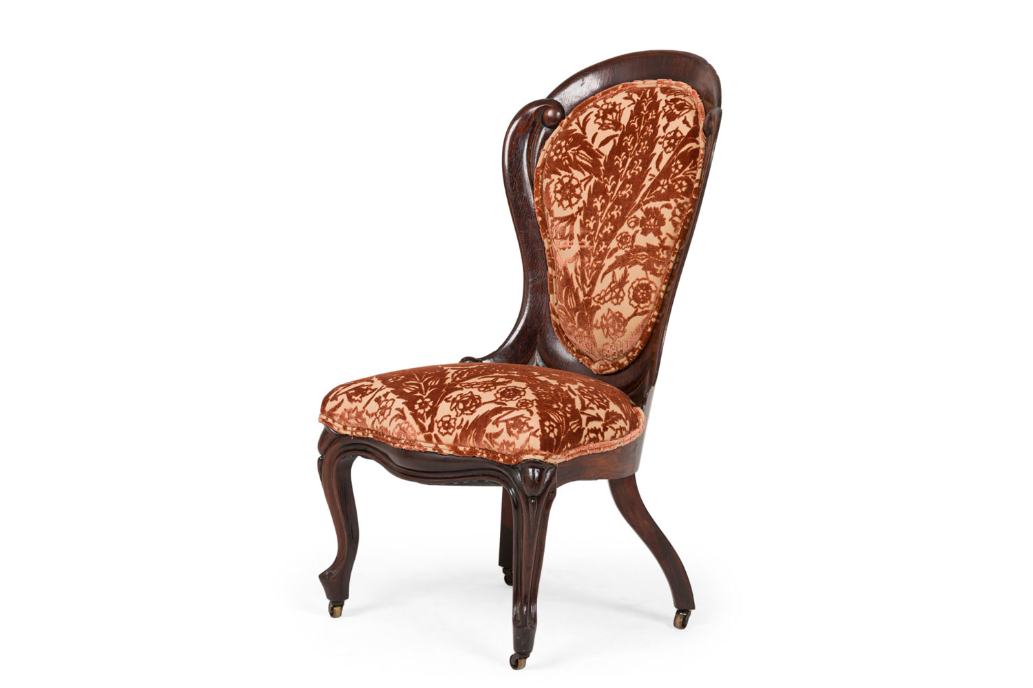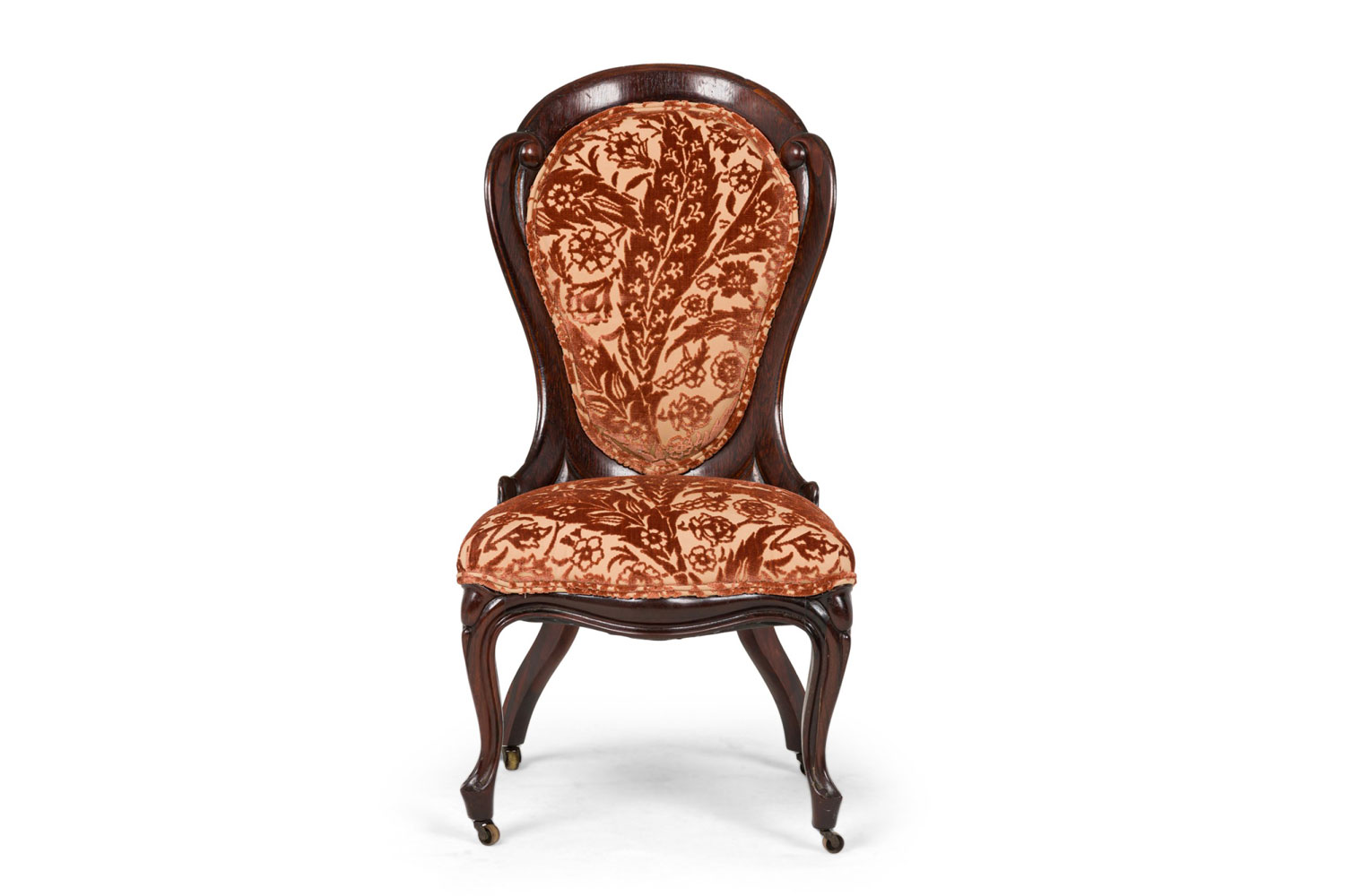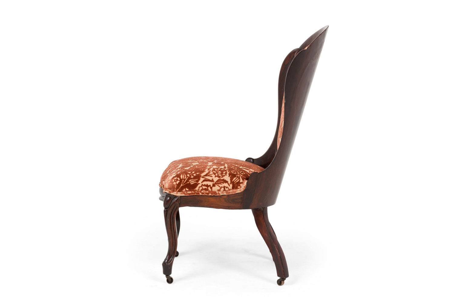 Style: American Materials & Techniques: Fabric, rosewood, upholstered, velvet, wood Category: Seating Good; Wear consistent with age and use