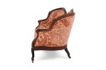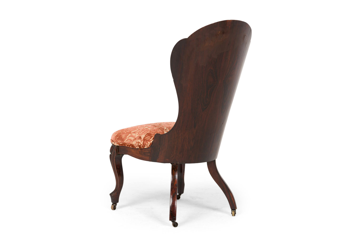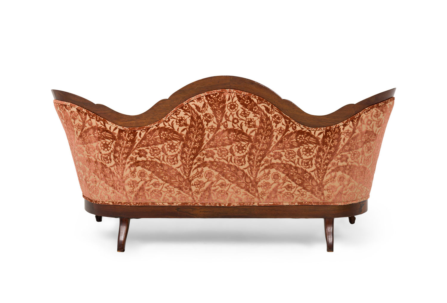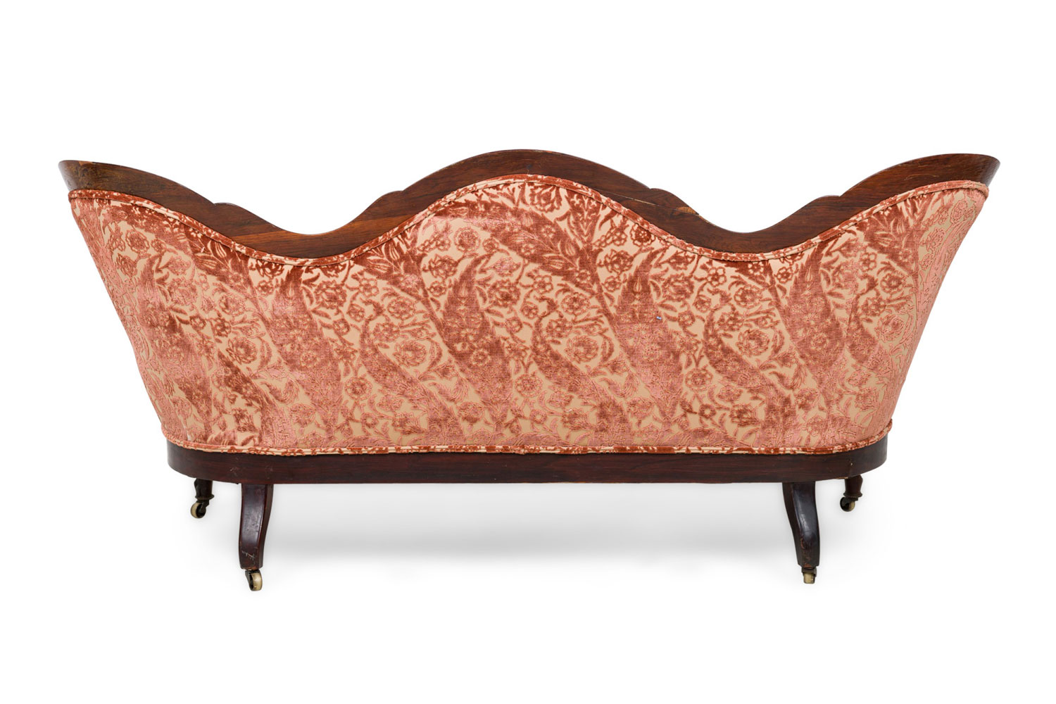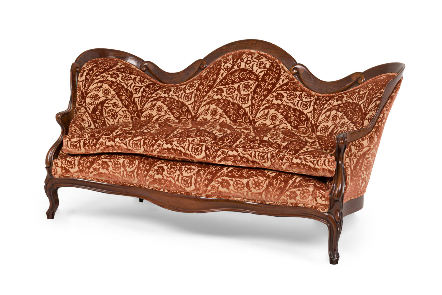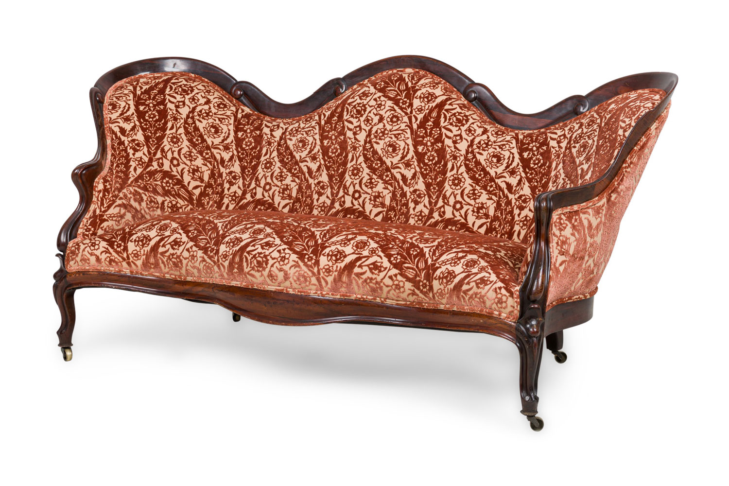 Style: American Materials & Techniques: Fabric, rosewood, upholstered, velvet, wood Category: Seating Good; Wear consistent with age and use