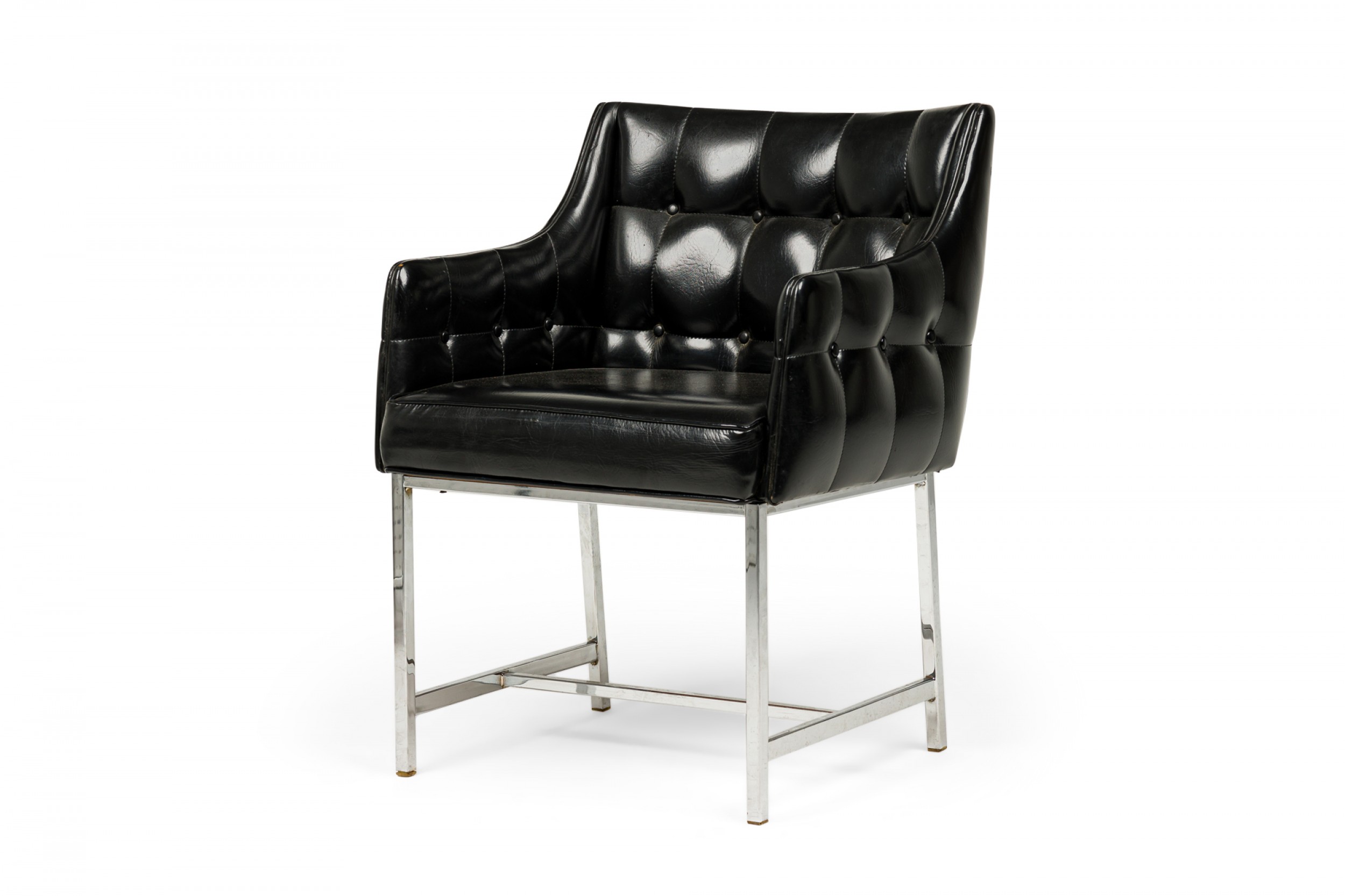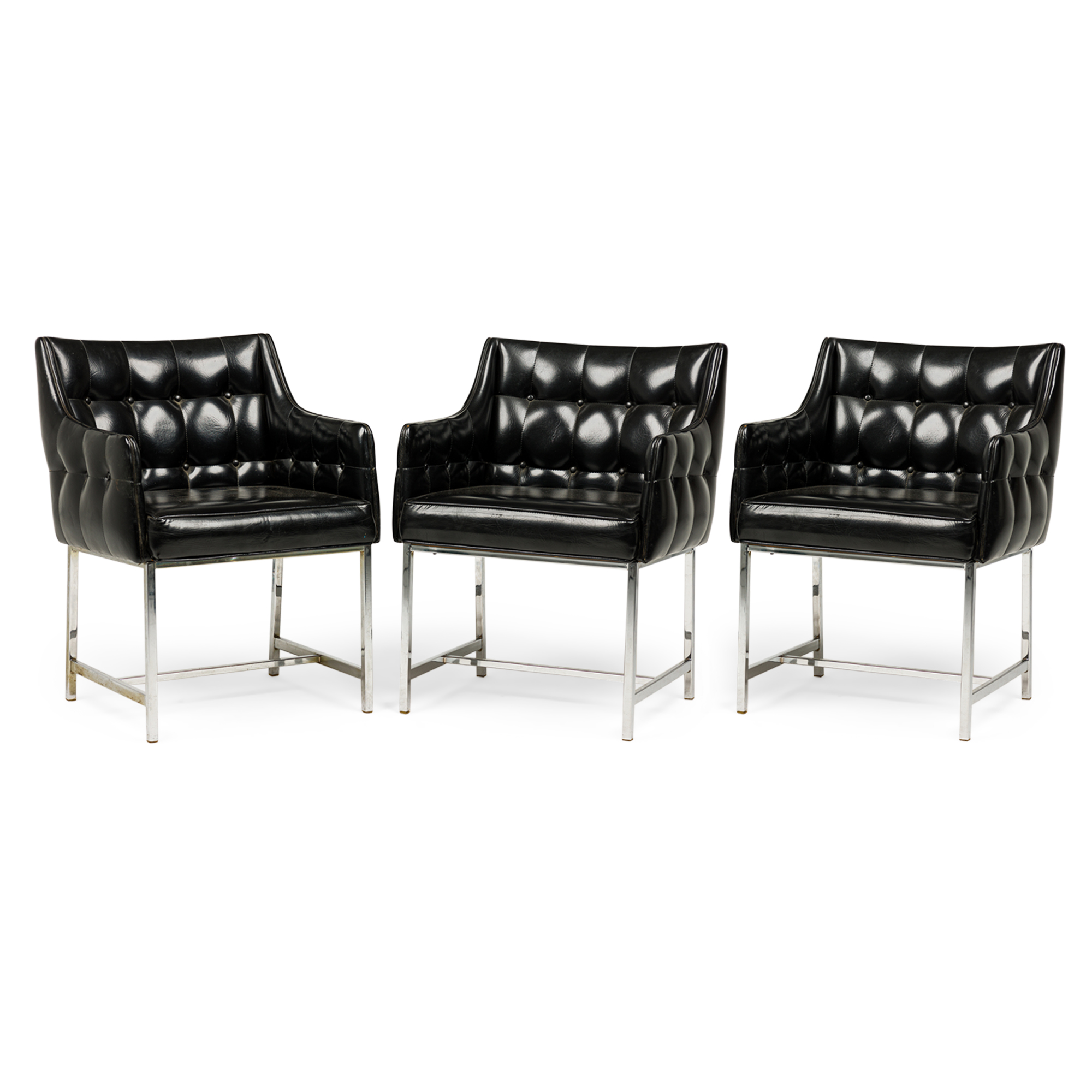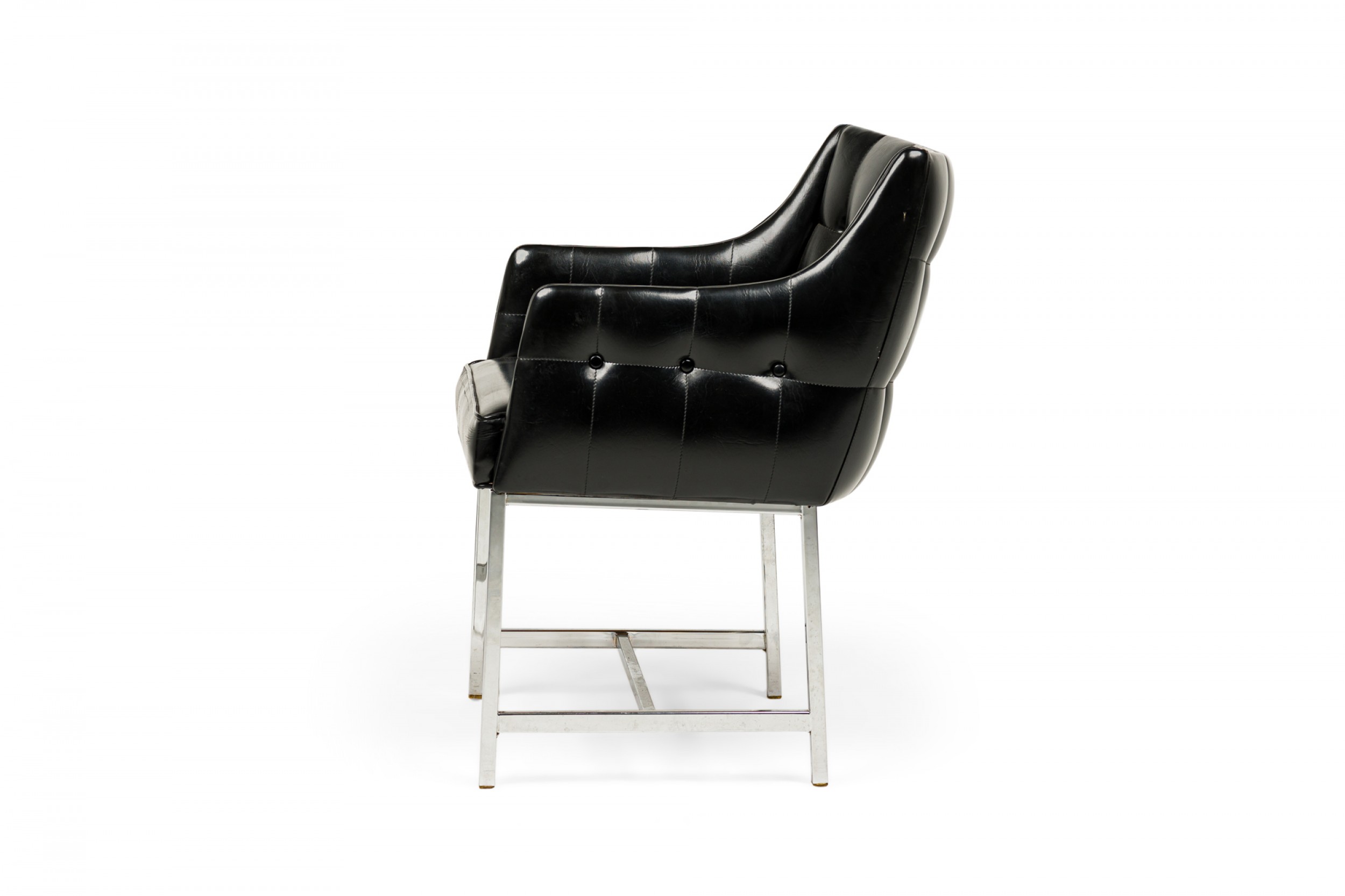 SET of 3 American Mid-Century game / armchairs with high sheen black vinyl button tufted upholstered seats with incorporated arms resting on silver metal square tube frames with stretcher bases. (CARSON)(PRICED AS SET).