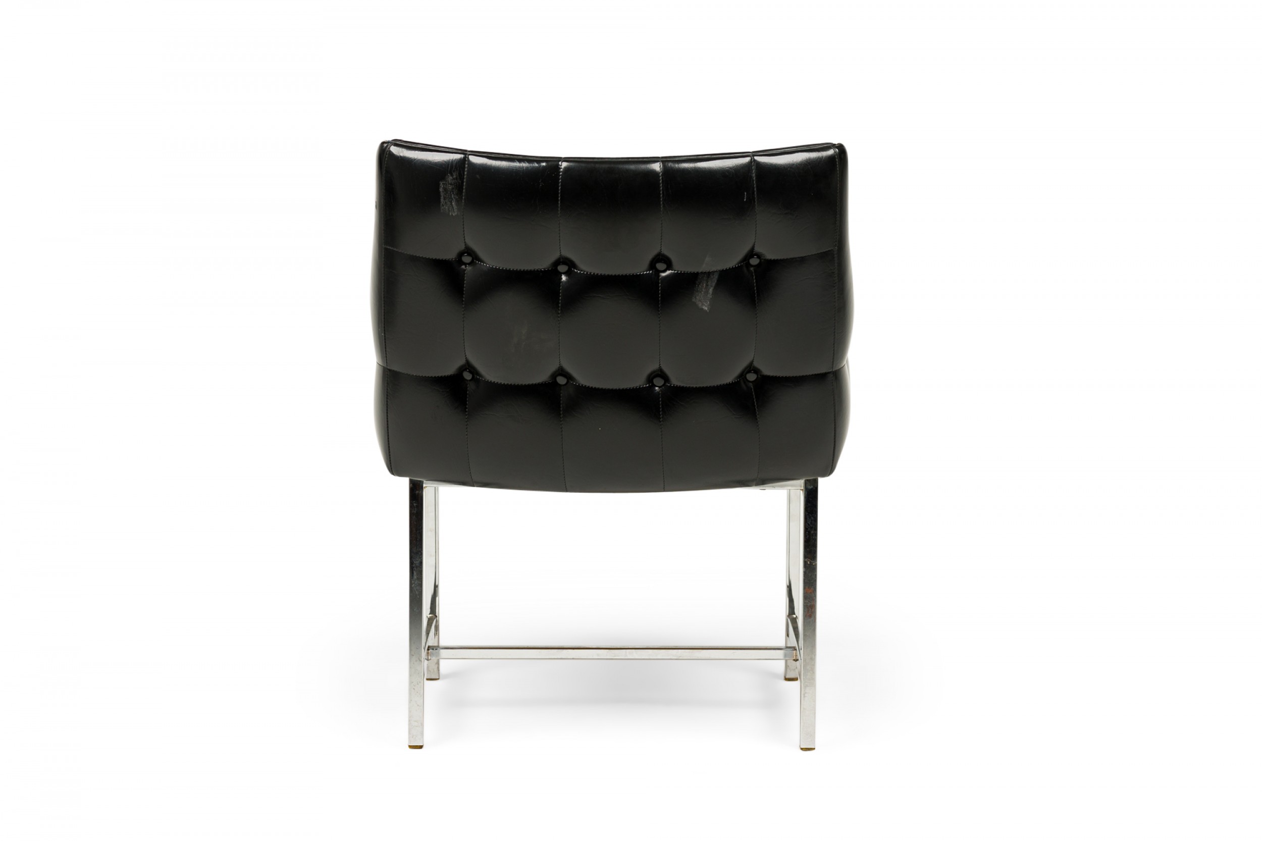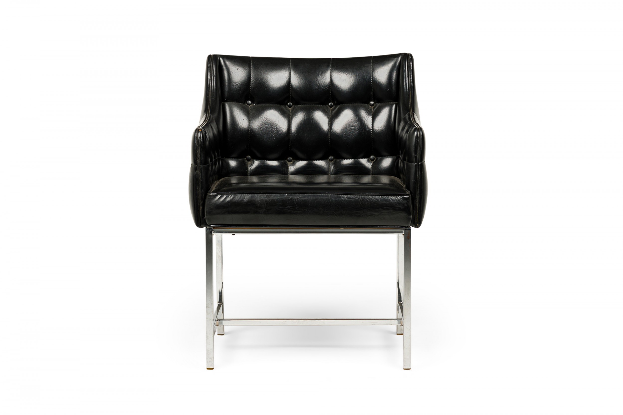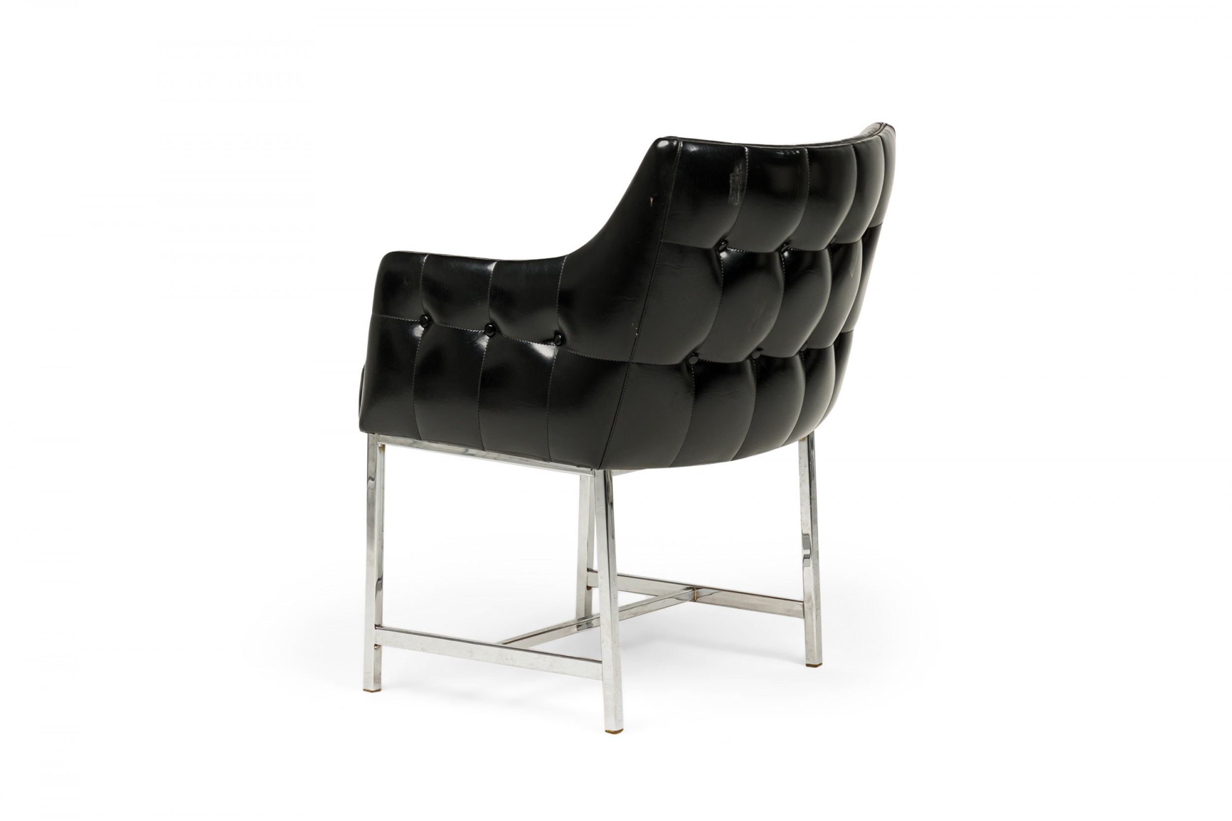 SET of 3 American Mid-Century game / armchairs with high sheen black vinyl button tufted upholstered seats with incorporated arms resting on silver metal square tube frames with stretcher bases. (CARSON)(PRICED AS SET).