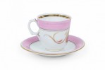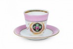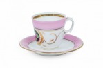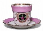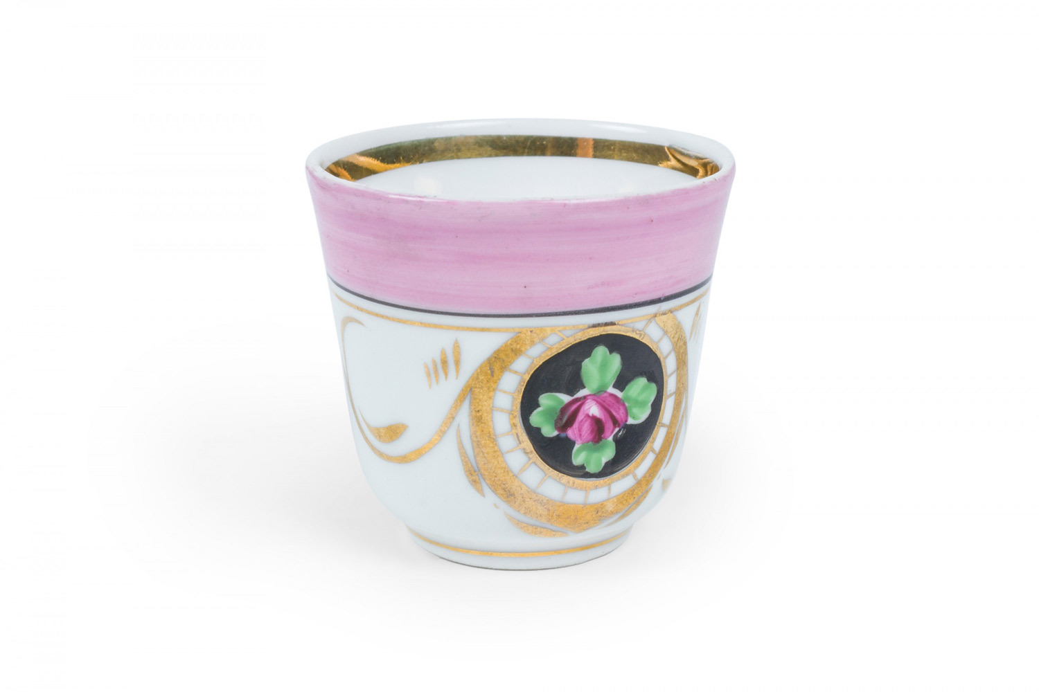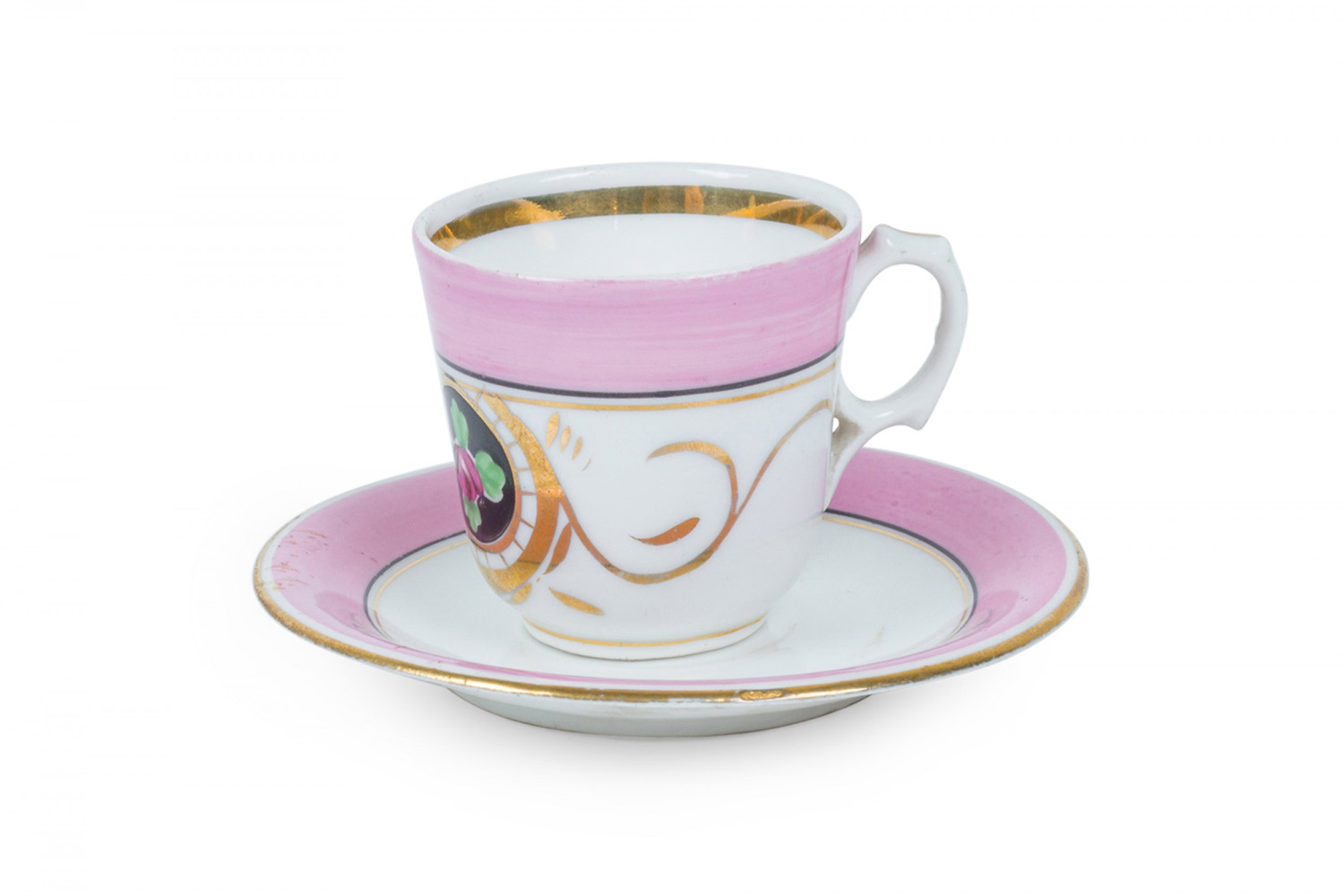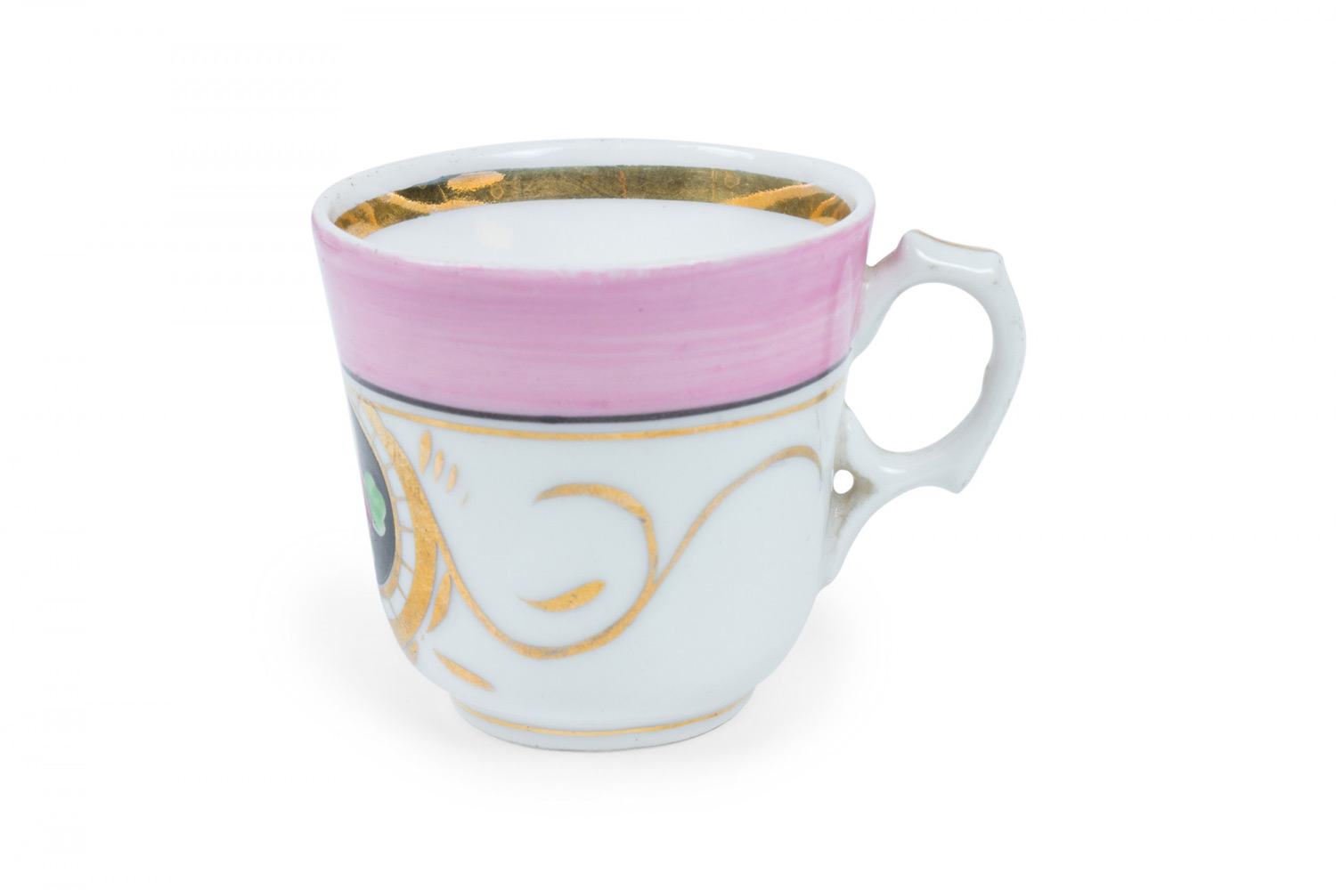 Set of 3 French Victorian pink and white porcelain tea cups and saucers with floral medallion. (PRICED AS SET).