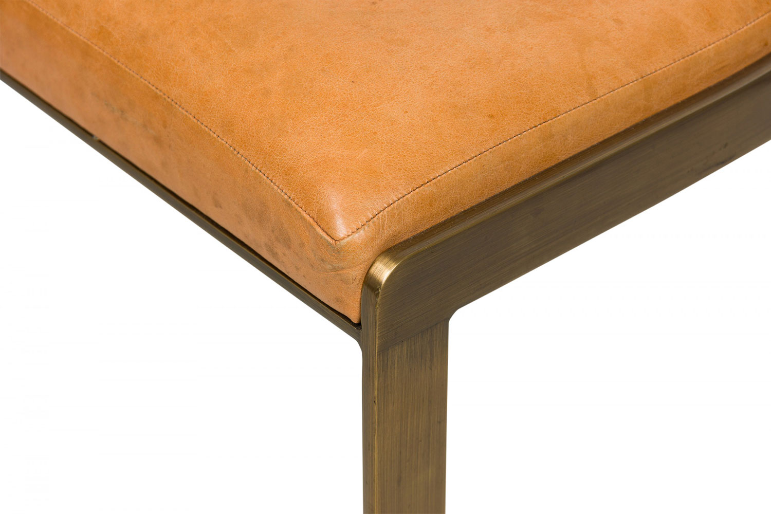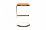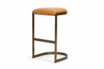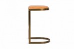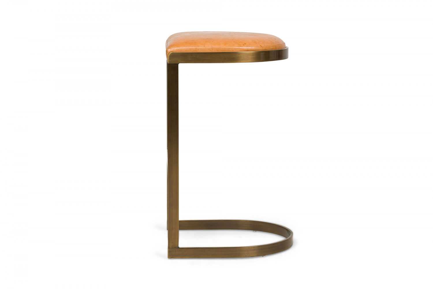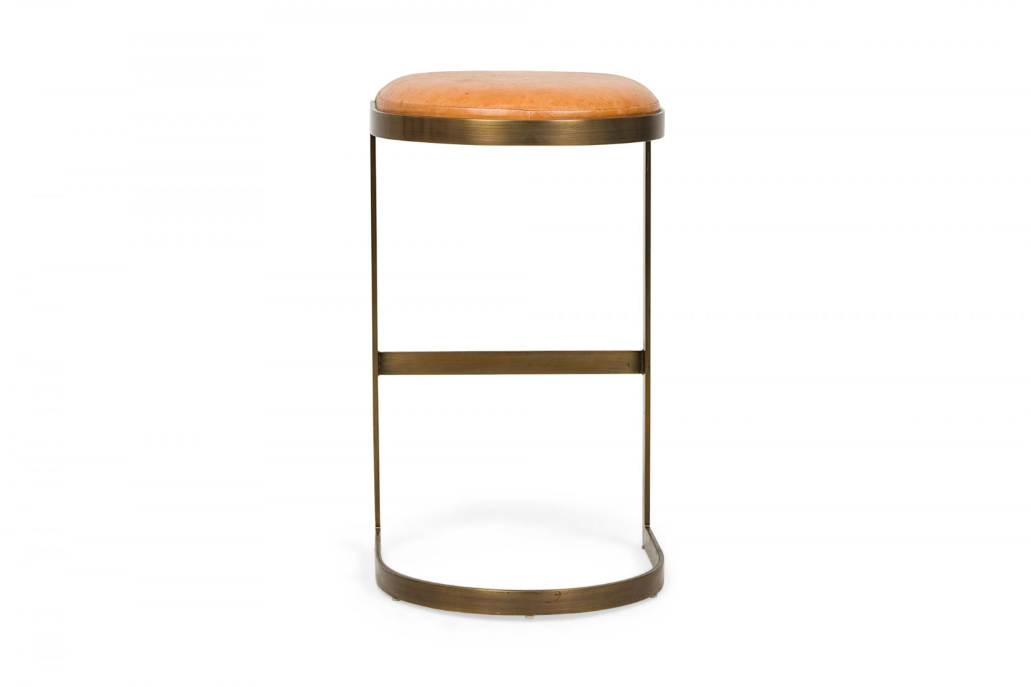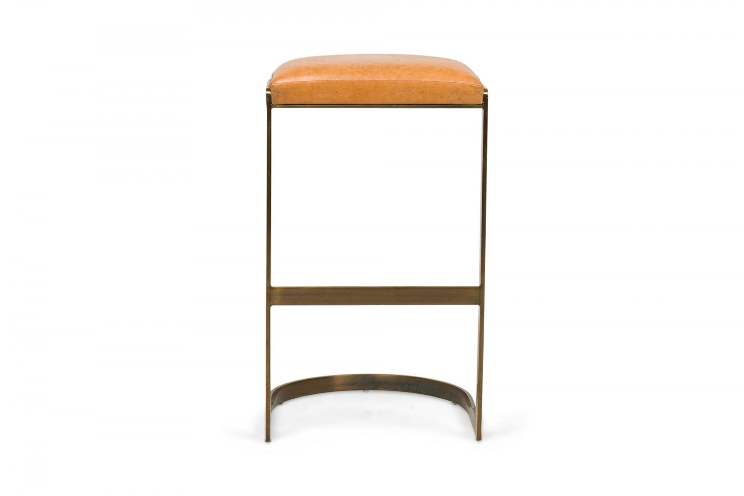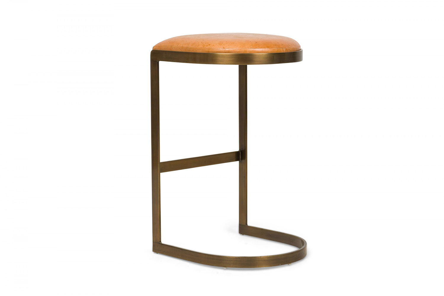 Set of 4 Brenton Mid-Century American Brass & Wood Tan Upholstered Horseshoe Cantilever Bar Stools