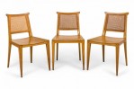 SET of 4 American Mid-Century side chairs with light wooden frames, solid wooden seats, and caned backs. (EDWARD WORMLEY FOR DUNBAR FURNITURE COMPANY)(PRICED AS SET)