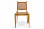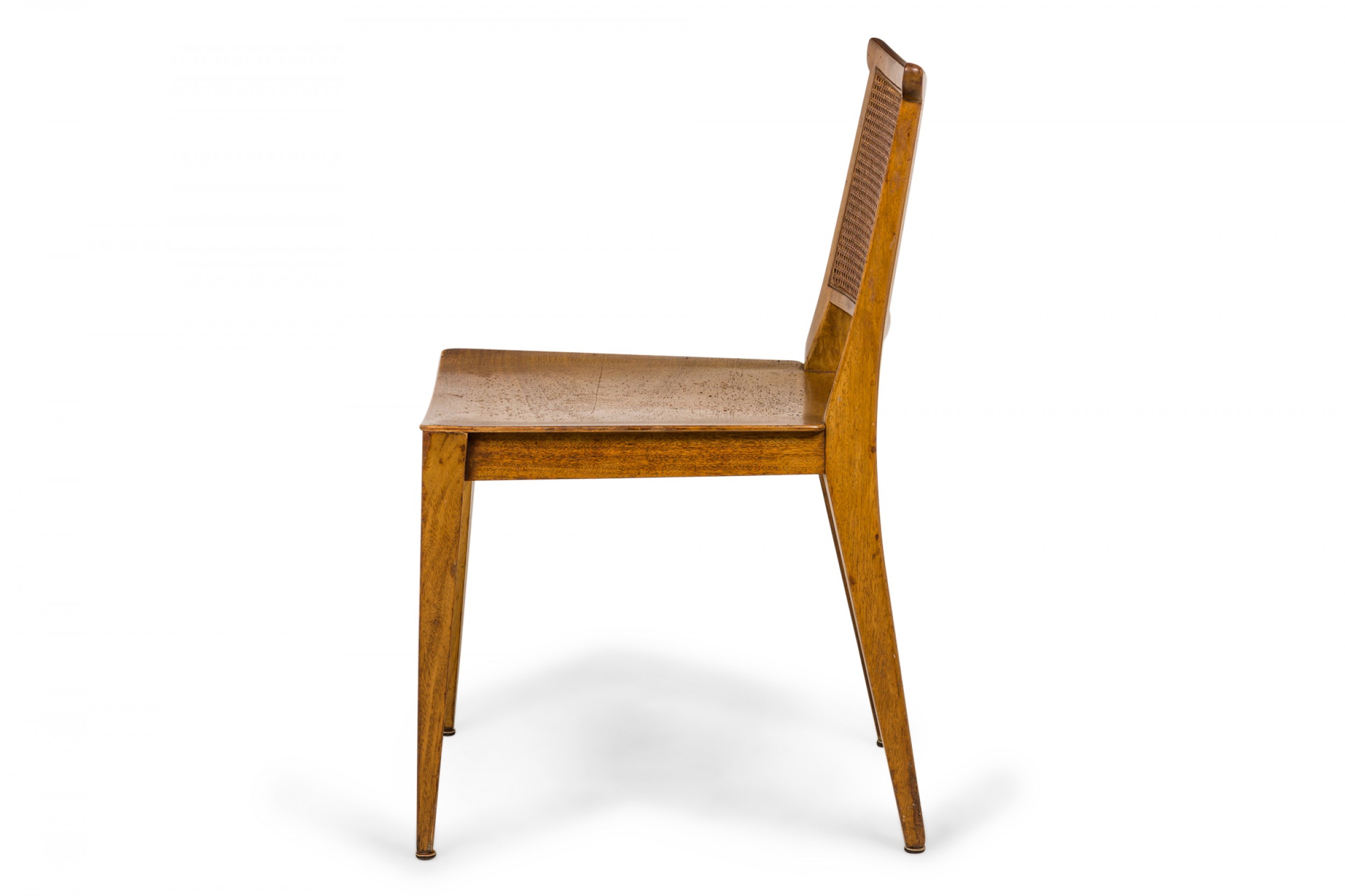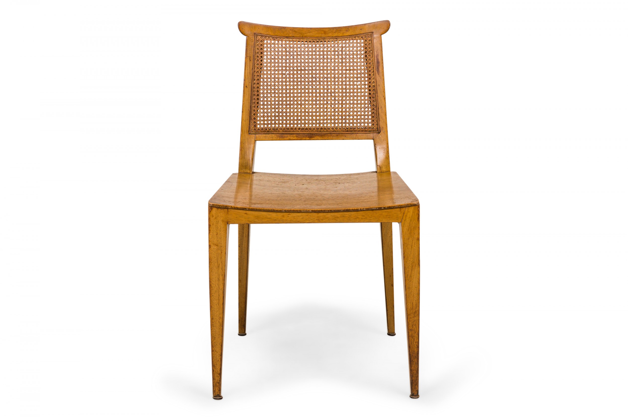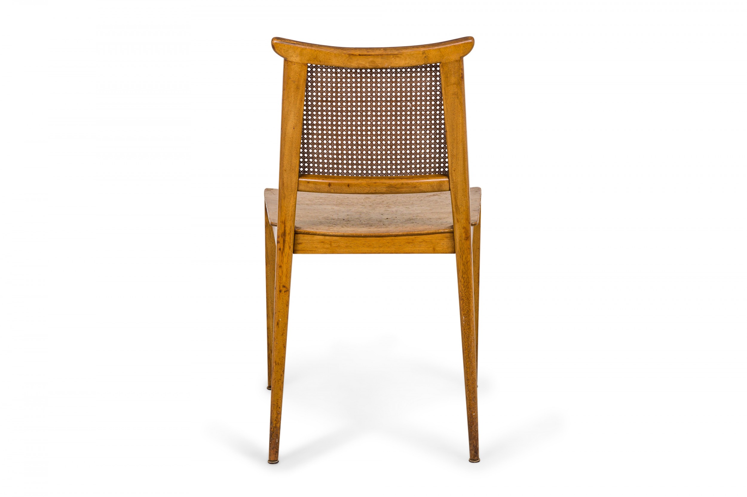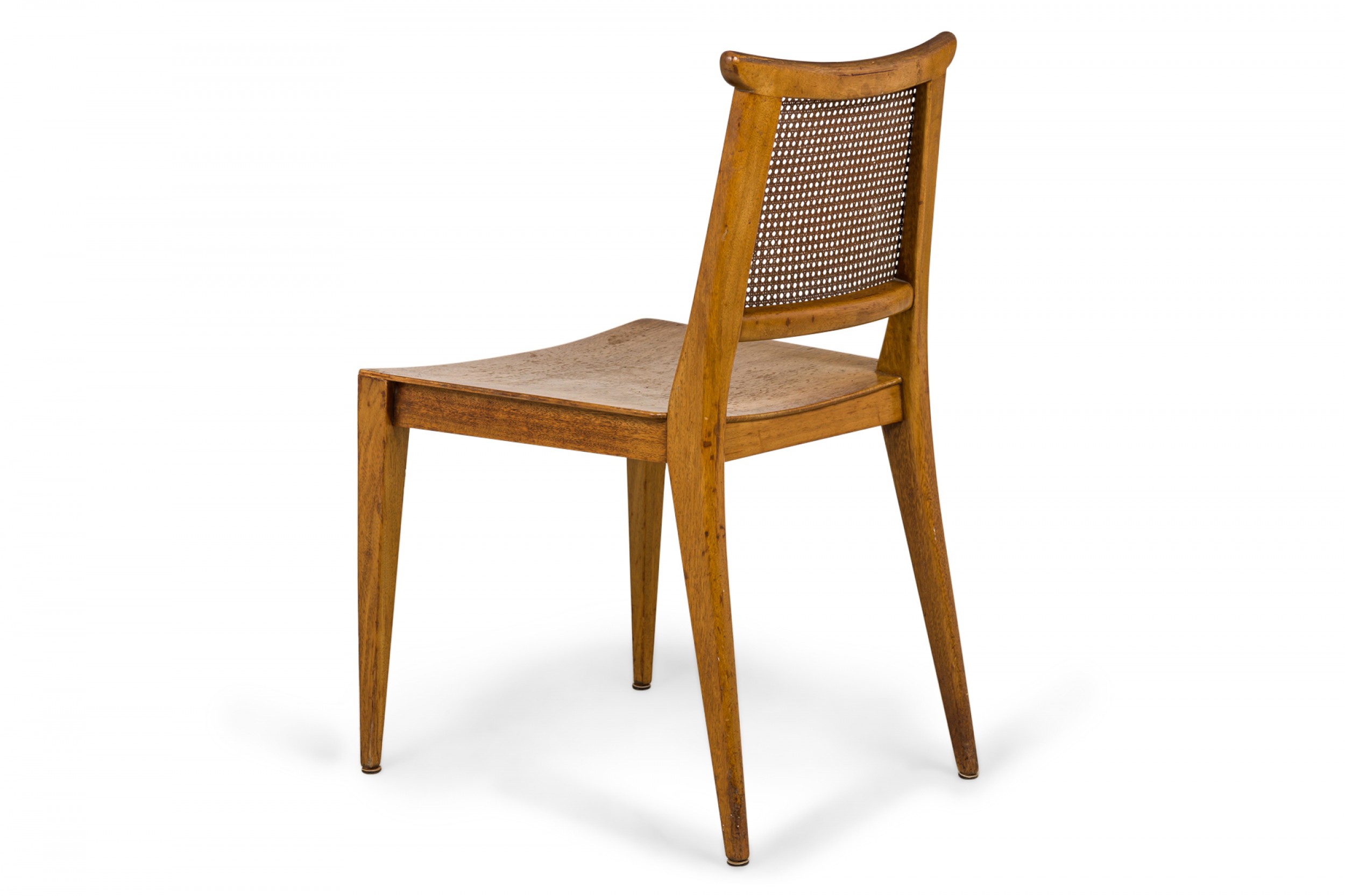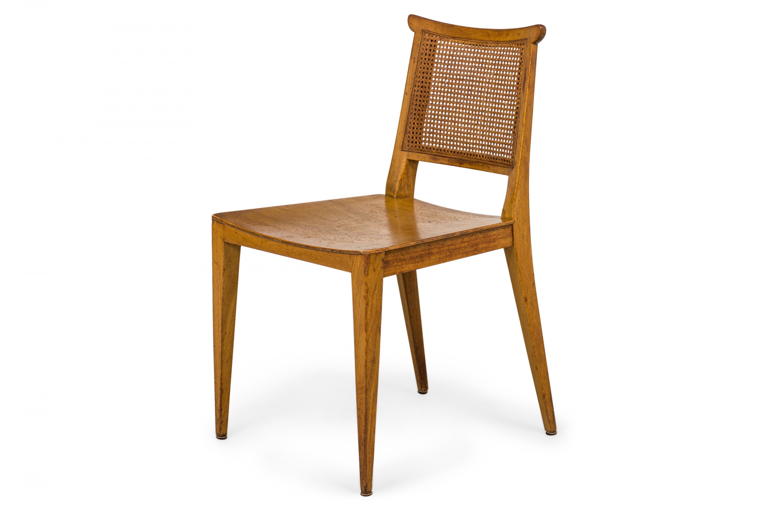 SET of 4 American Mid-Century side chairs with light wooden frames, solid wooden seats, and caned backs. (EDWARD WORMLEY FOR DUNBAR FURNITURE COMPANY)(PRICED AS SET).