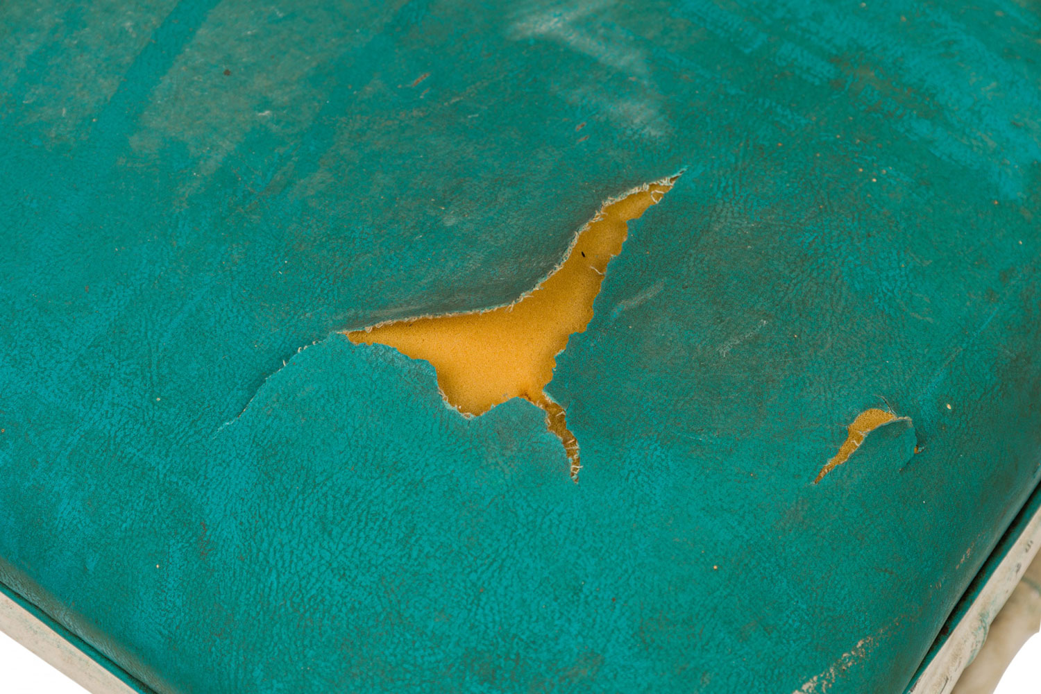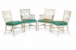 Style: Bamboo, Outdoor, Mid-Century Materials & Techniques: Aluminum, metal, painted, upholstered, vinyl Category: Seating, Office/Library, Dining Room Condition: Heavy wear to finish, one chair stripped of finish. Cushions deteriorated. Distressed