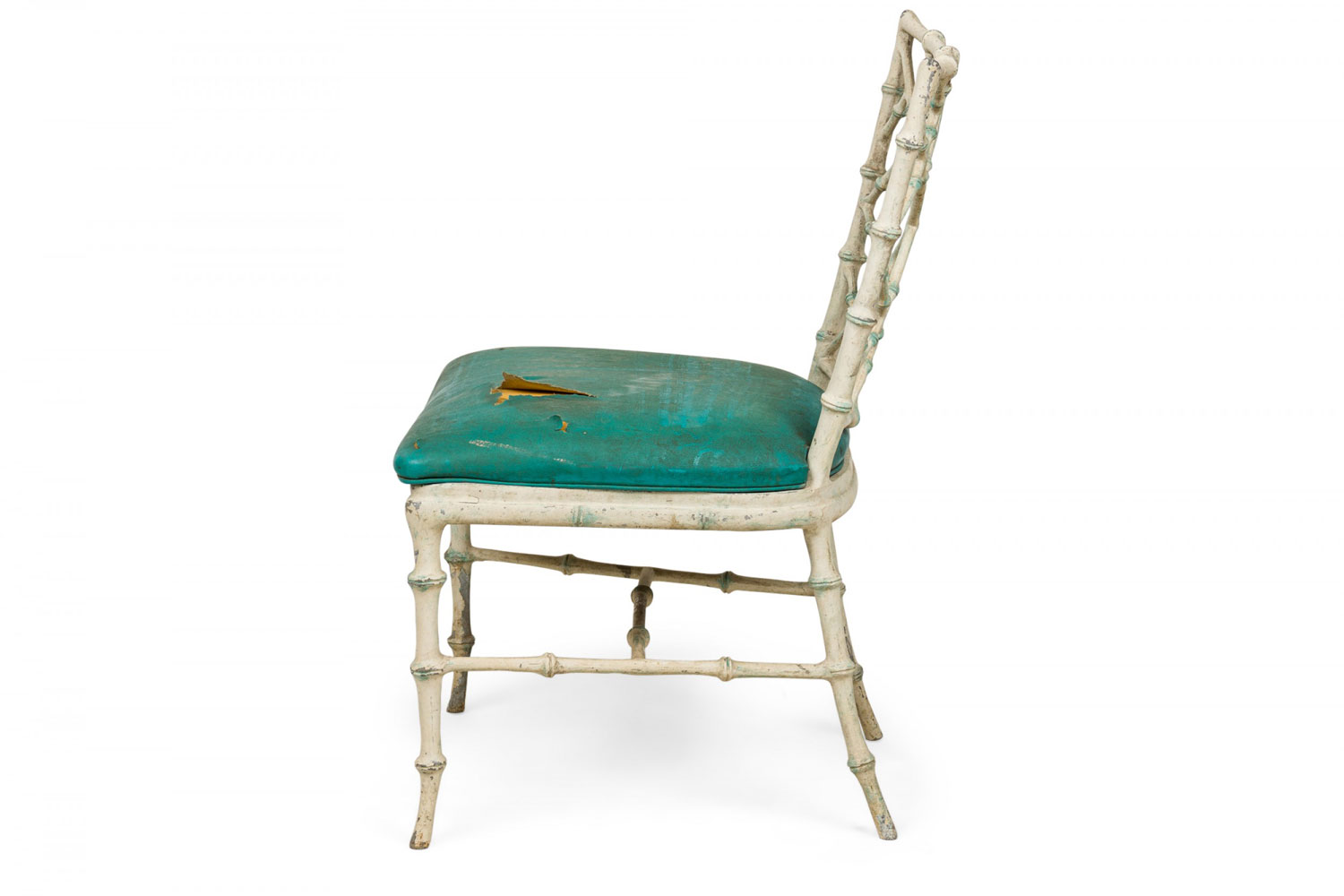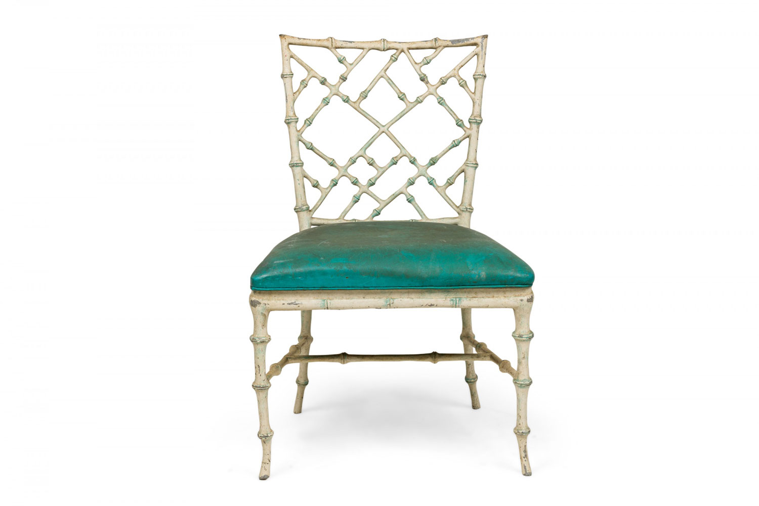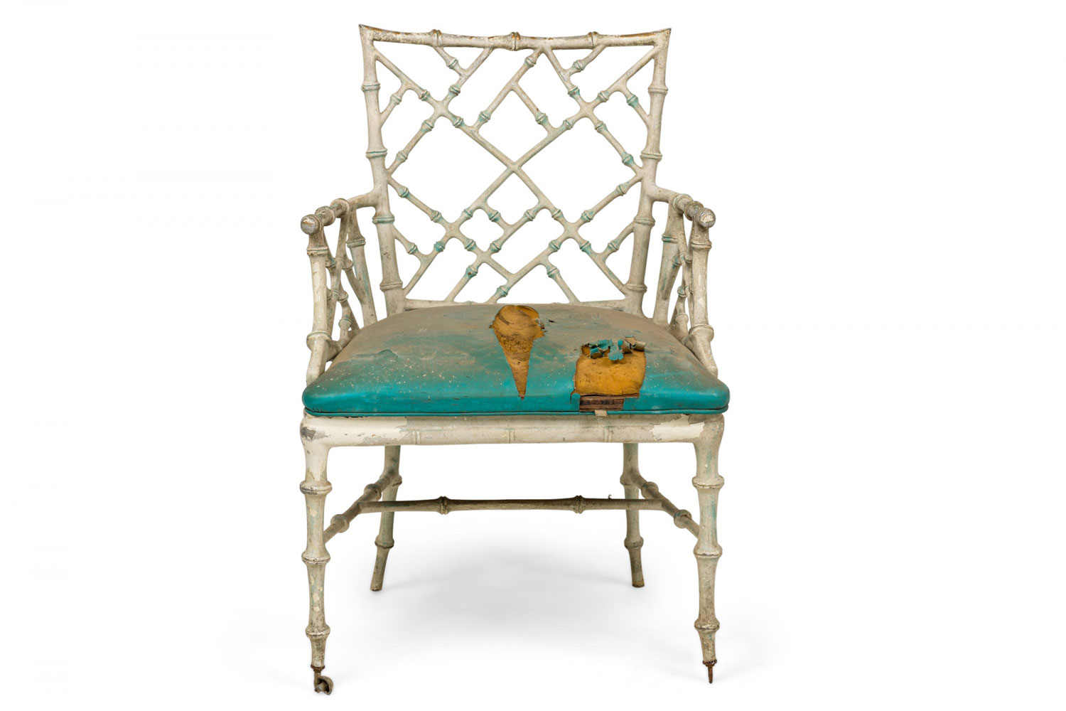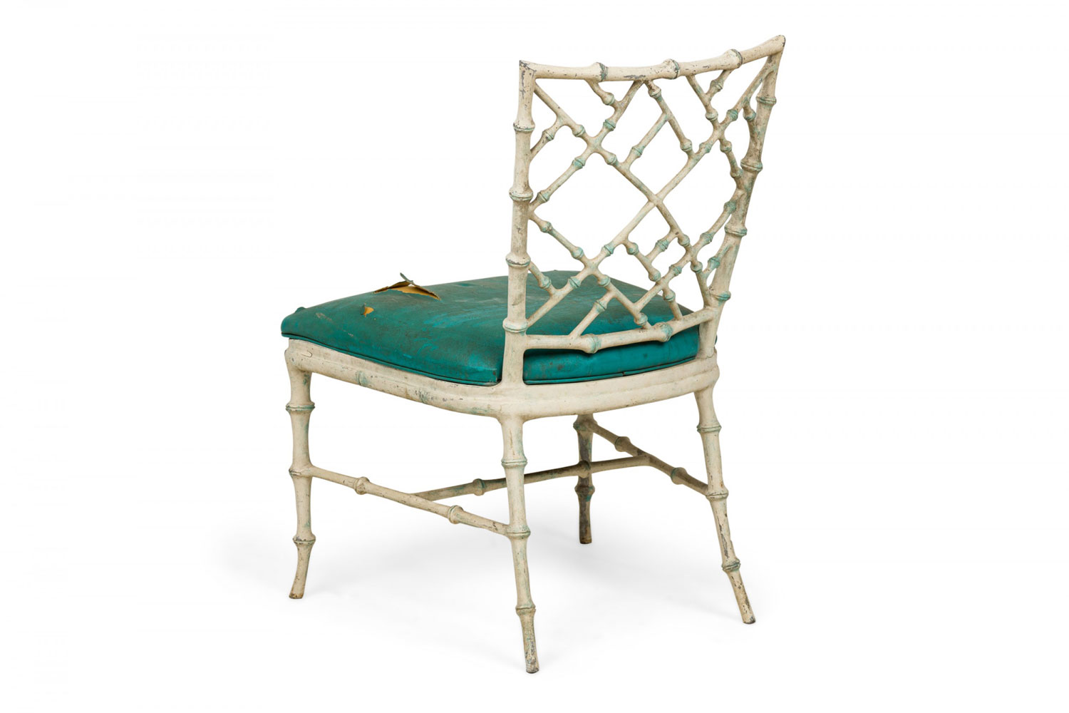 SET of 4 American Mid-Century (1960s) cast aluminum (outdoor) faux bamboo dining chairs painted in a distressed off-white and green trim with teal seats (as is), having open latice backs and resting on legs with stretcher (2 armchairs, 2 side chairs) (PHYLLIS MORRIS FOR KESSLER INDUSTRIES)(PRICED AS SET)(matching table: DUF0857).