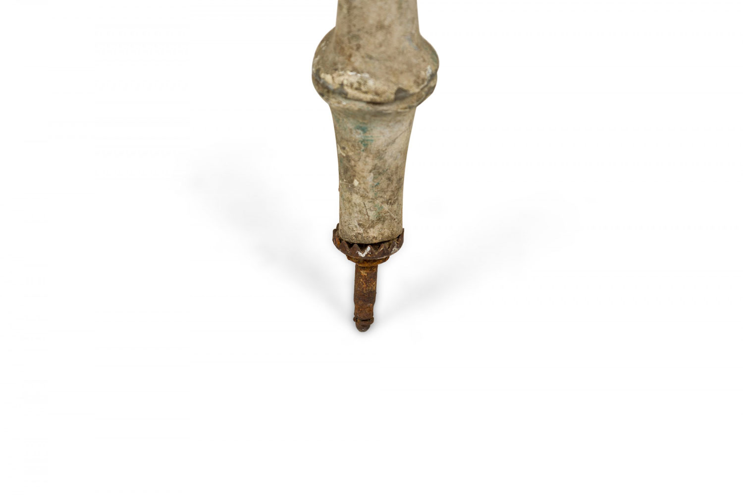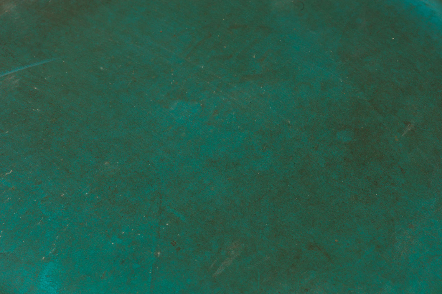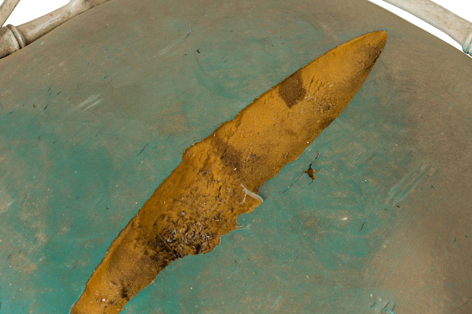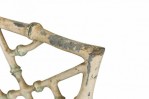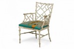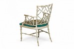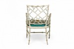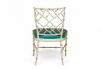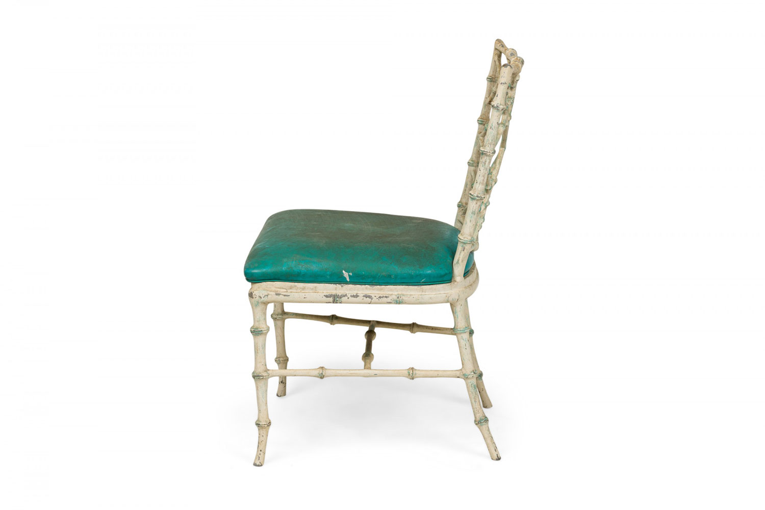 SET of 4 American Mid-Century (1960s) cast aluminum (outdoor) faux bamboo dining chairs painted in a distressed off-white and green trim with teal seats (as is), having open latice backs and resting on legs with stretcher (2 armchairs, 2 side chairs) (PHYLLIS MORRIS FOR KESSLER INDUSTRIES)(PRICED AS SET)(matching table: DUF0857).