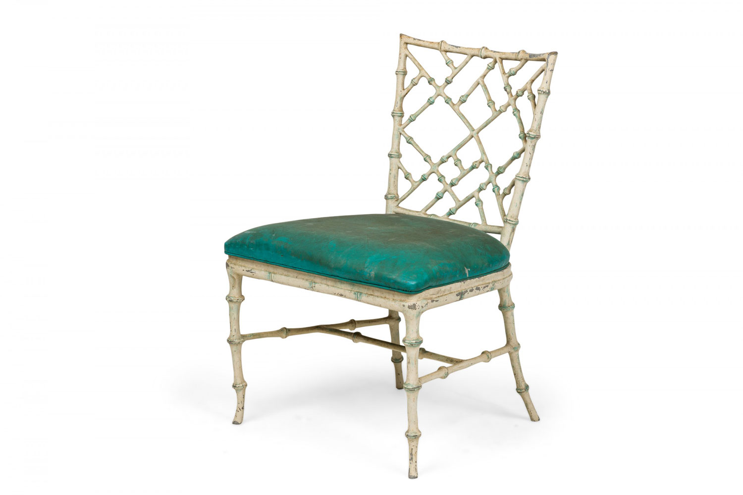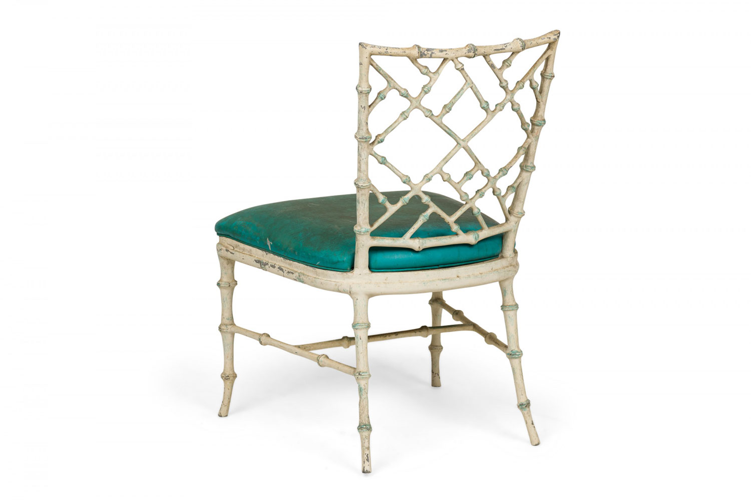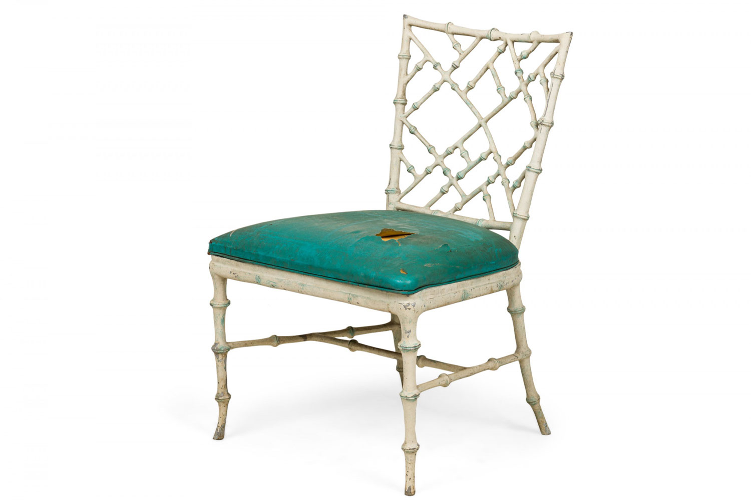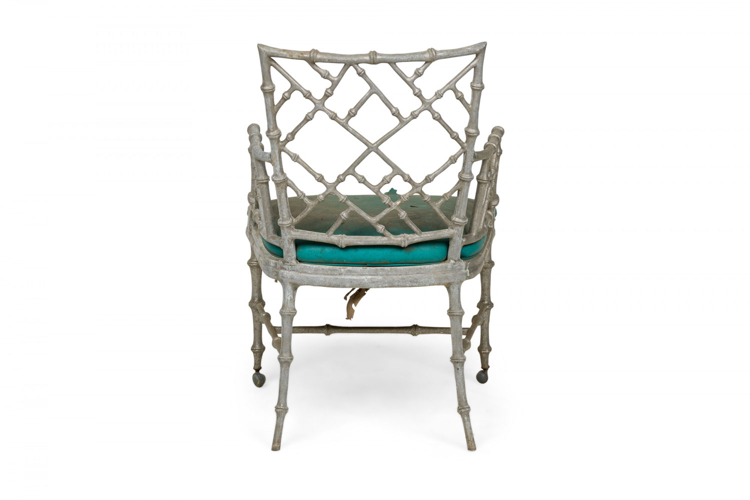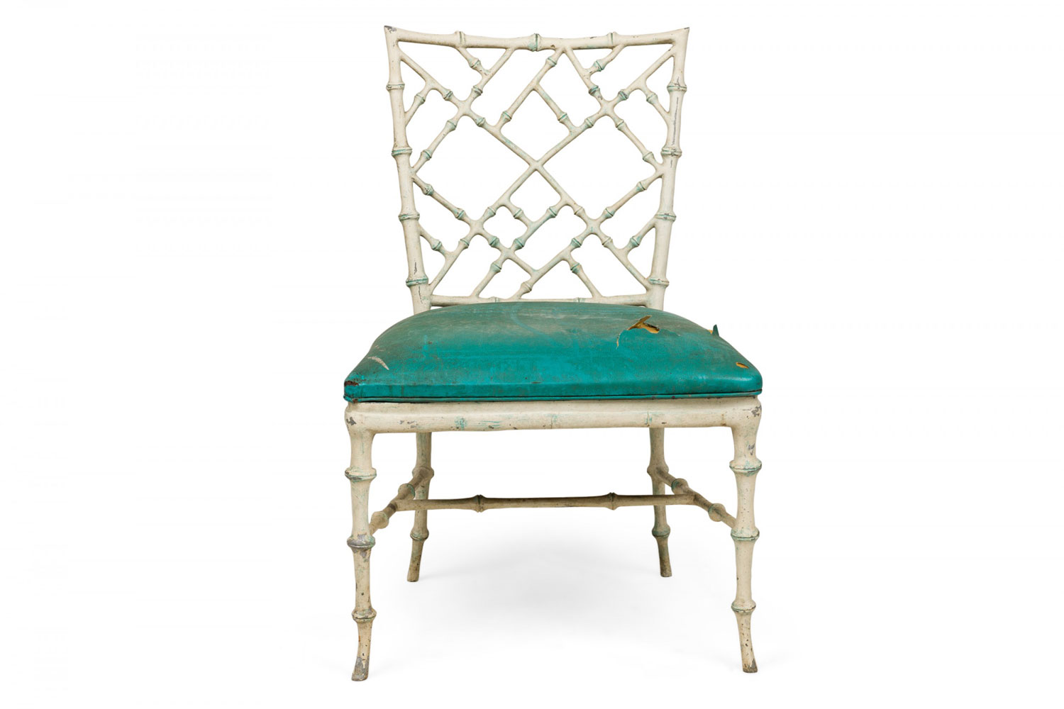 SET of 4 American Mid-Century (1960s) cast aluminum (outdoor) faux bamboo dining chairs painted in a distressed off-white and green trim with teal seats (as is), having open latice backs and resting on legs with stretcher (2 armchairs, 2 side chairs) (PHYLLIS MORRIS FOR KESSLER INDUSTRIES)(PRICED AS SET)(matching table: DUF0857)