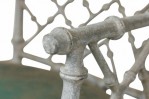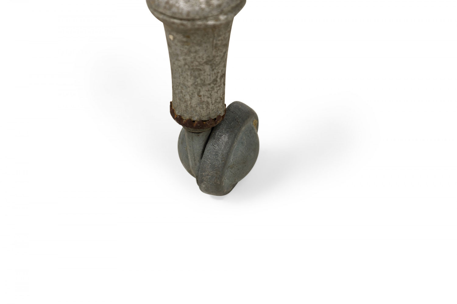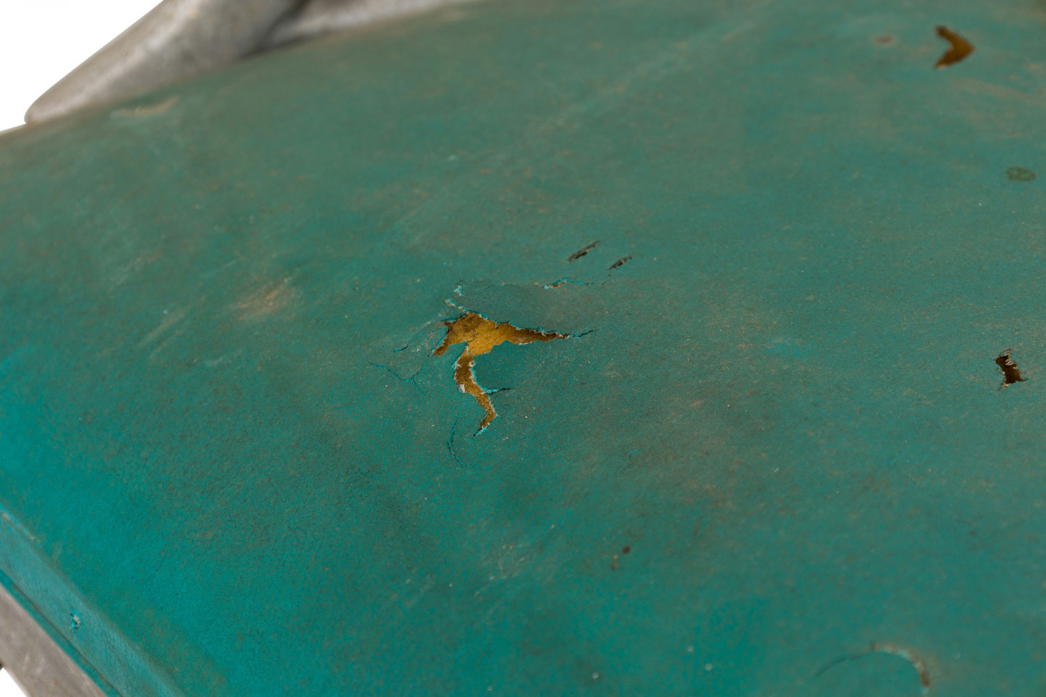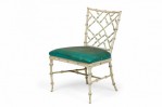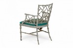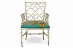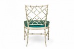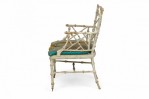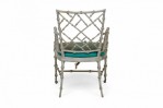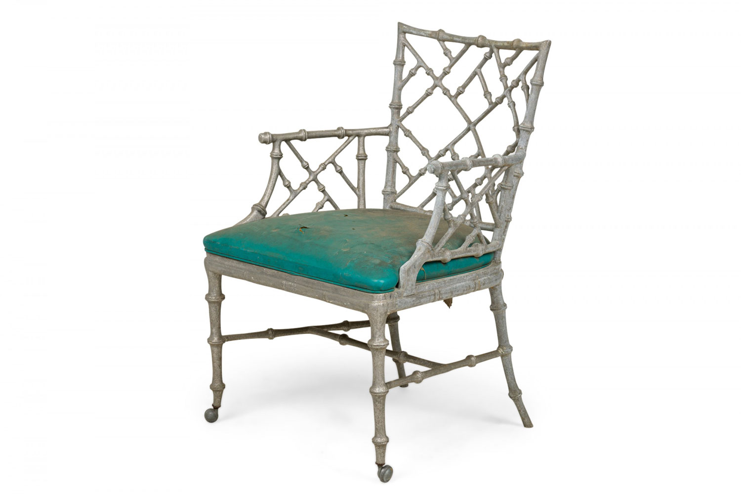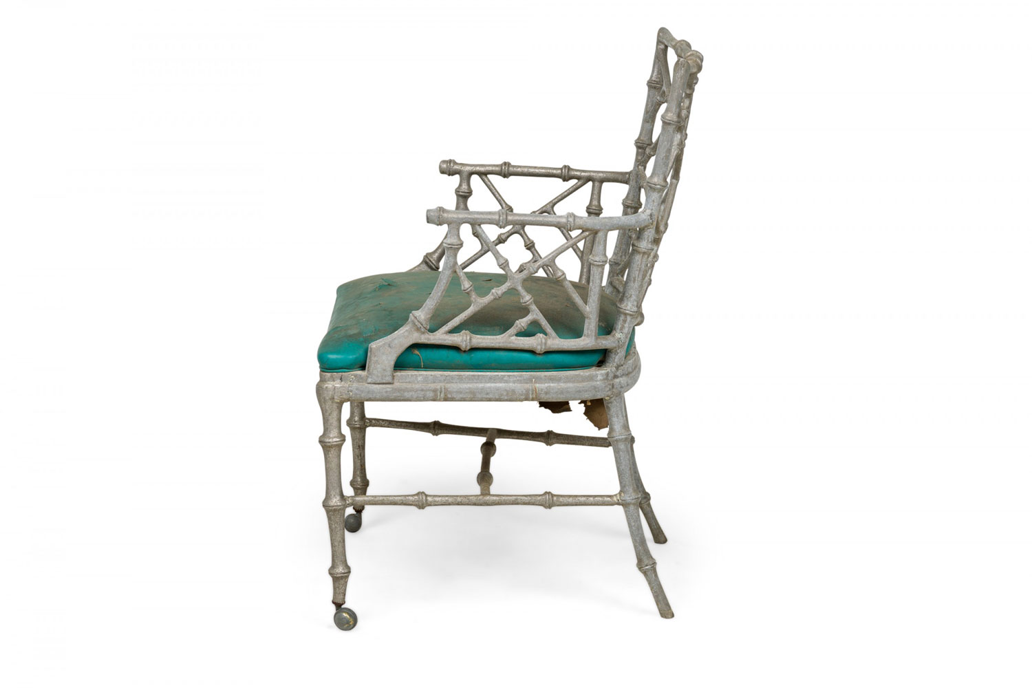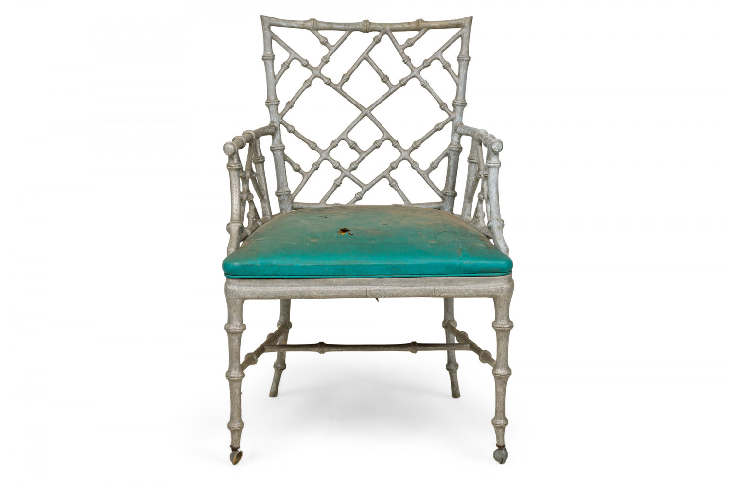 SET of 4 American Mid-Century (1960s) cast aluminum (outdoor) faux bamboo dining chairs painted in a distressed off-white and green trim with teal seats (as is), having open latice backs and resting on legs with stretcher (2 armchairs, 2 side chairs) (PHYLLIS MORRIS FOR KESSLER INDUSTRIES)(PRICED AS SET)(matching table: DUF0857)