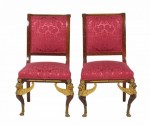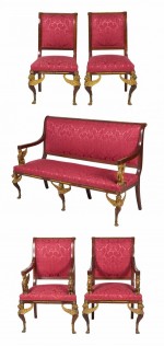 SET of 5 French Empire-style (19th Century) mahogany salon / living room set comprised of 2 armchairs, 2 sidechairs, and one loveseat/settee with bronze trim and red damask upholstery. (Available individually: Loveseat: 031624A Armchairs: 031624B Side chairs: 031624C).