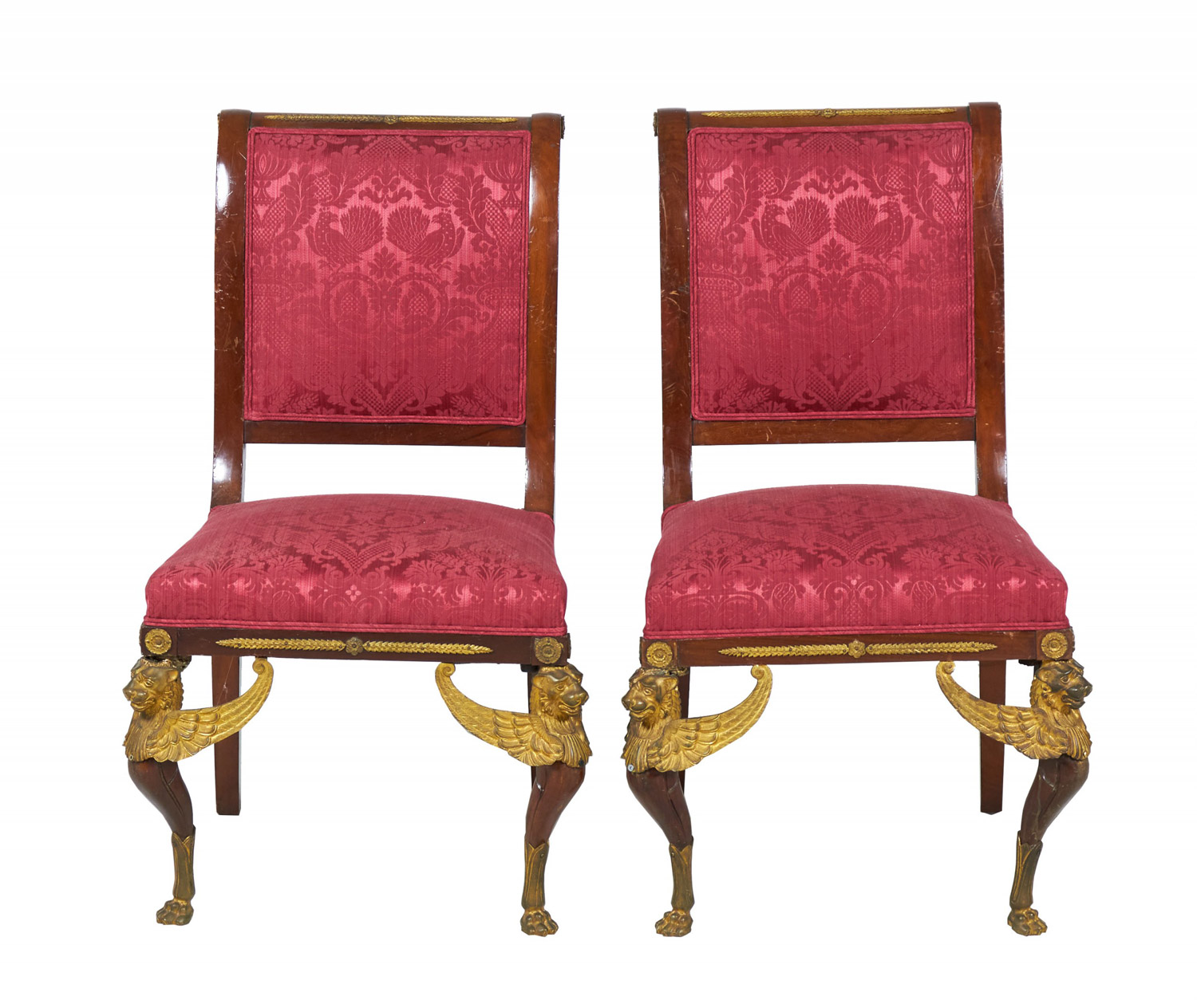SET of 5 French Empire-style (19th Century) mahogany salon / living room set comprised of 2 armchairs, 2 sidechairs, and one loveseat/settee with bronze trim and red damask upholstery. (Available individually: Loveseat: 031624A Armchairs: 031624B Side chairs: 031624C)